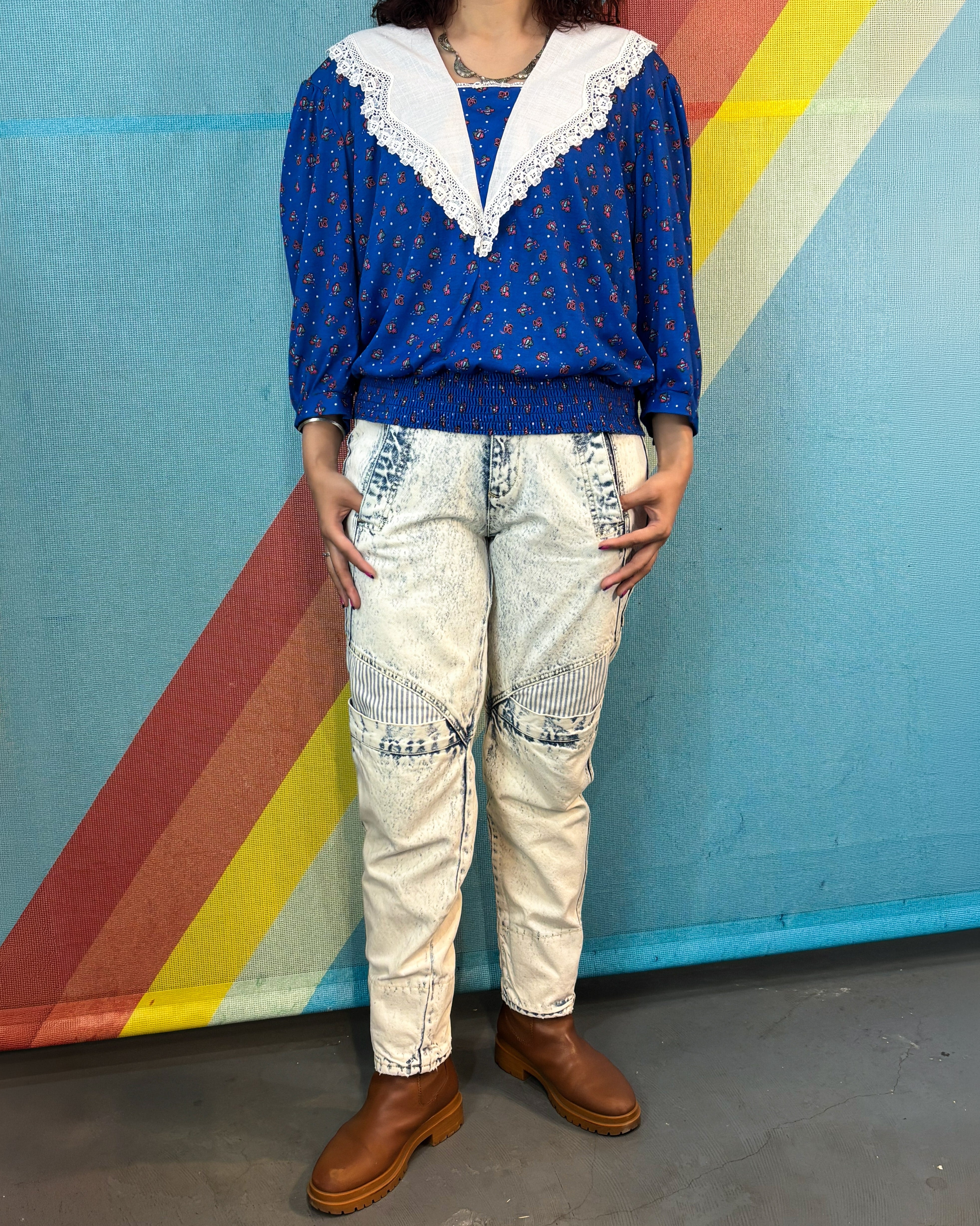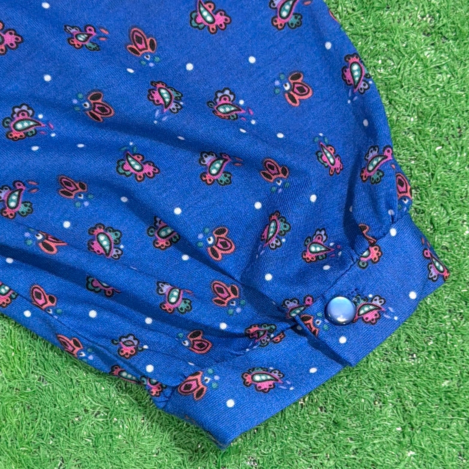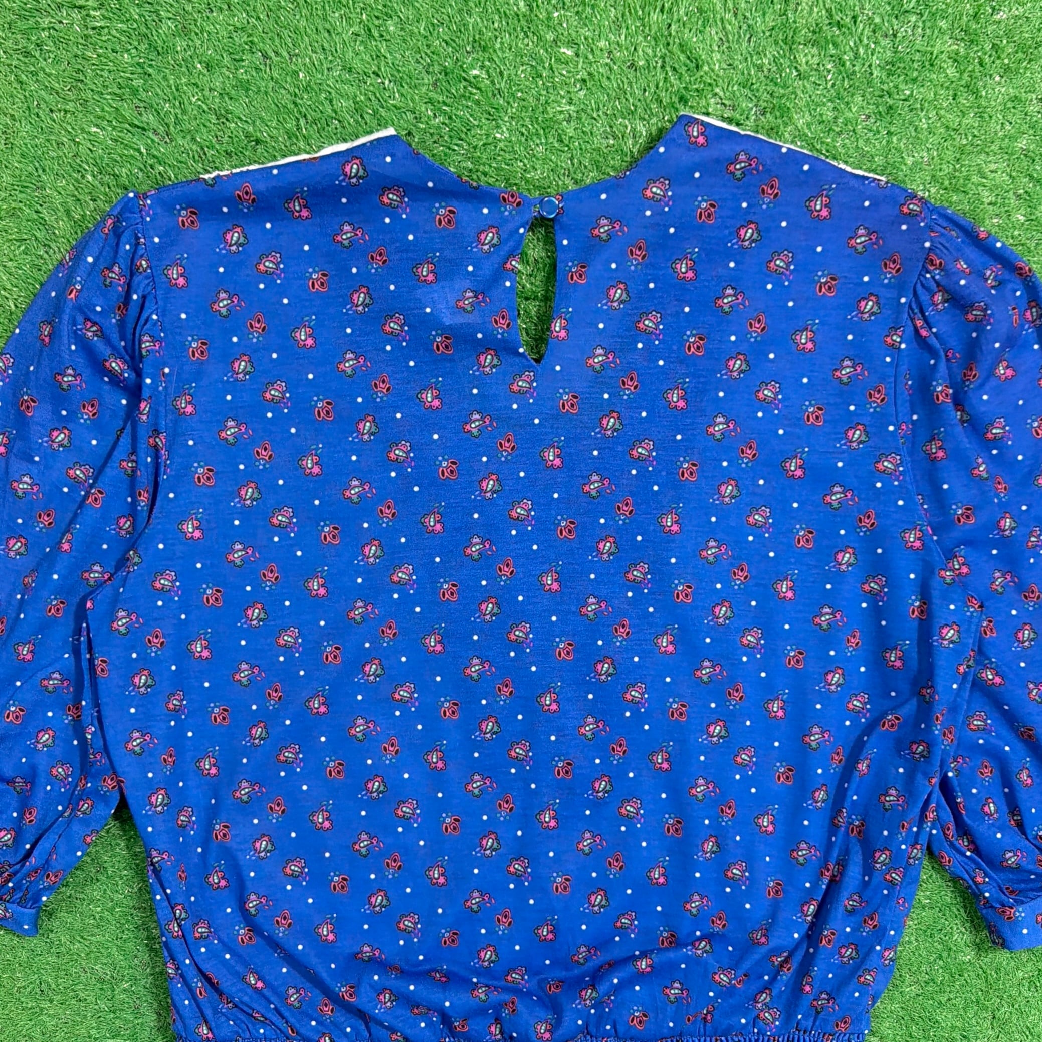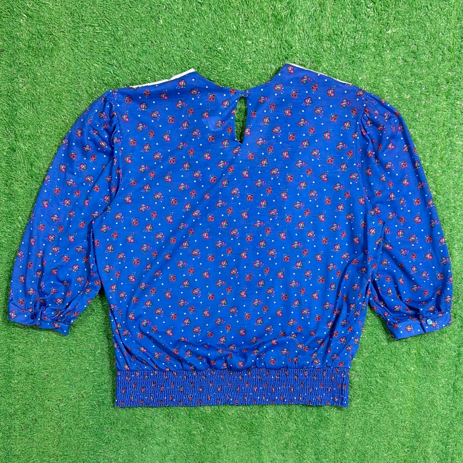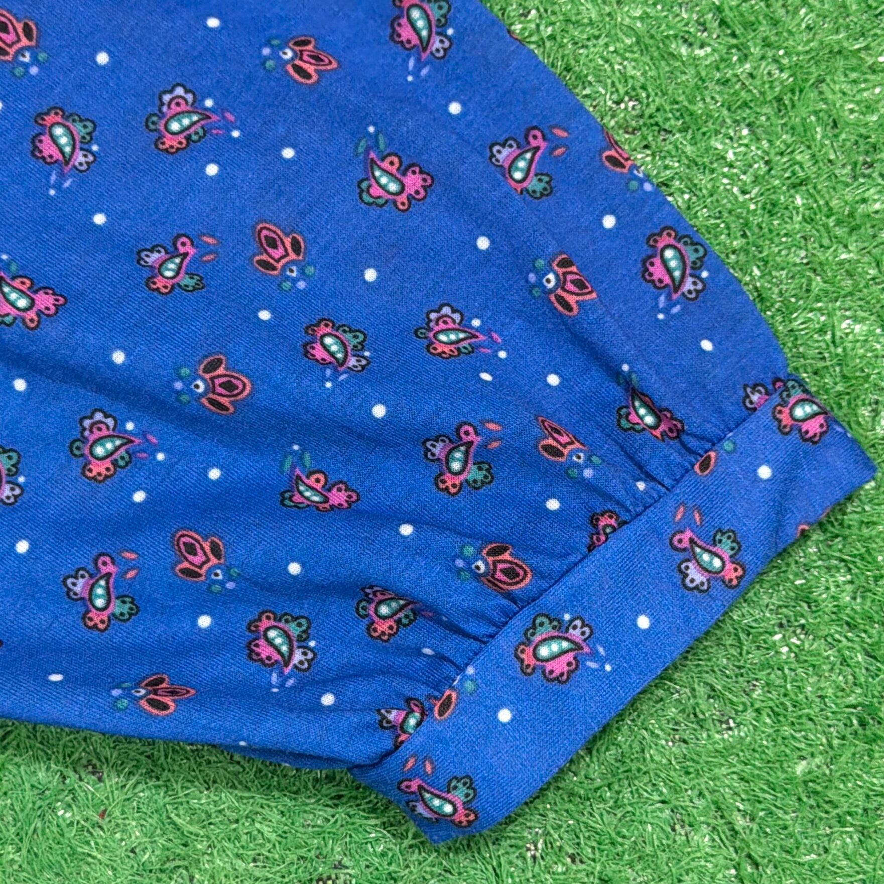 鮮やかなブルーベースに小花のような総柄が入り、ヴィンテージらしい華やかな雰囲気の一枚。大きめのホワイトカラーにレースがあしらわれたデザインが特徴的で、しっかり存在感のある仕上がりです。