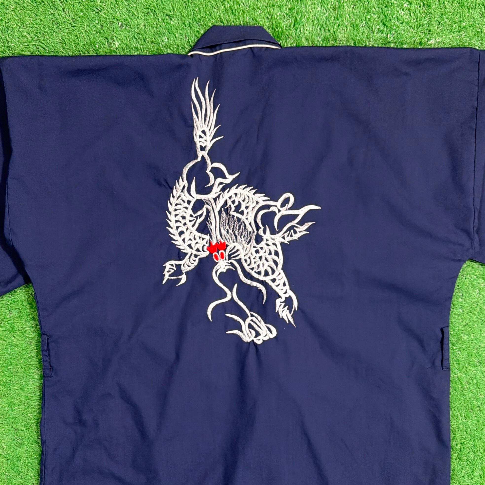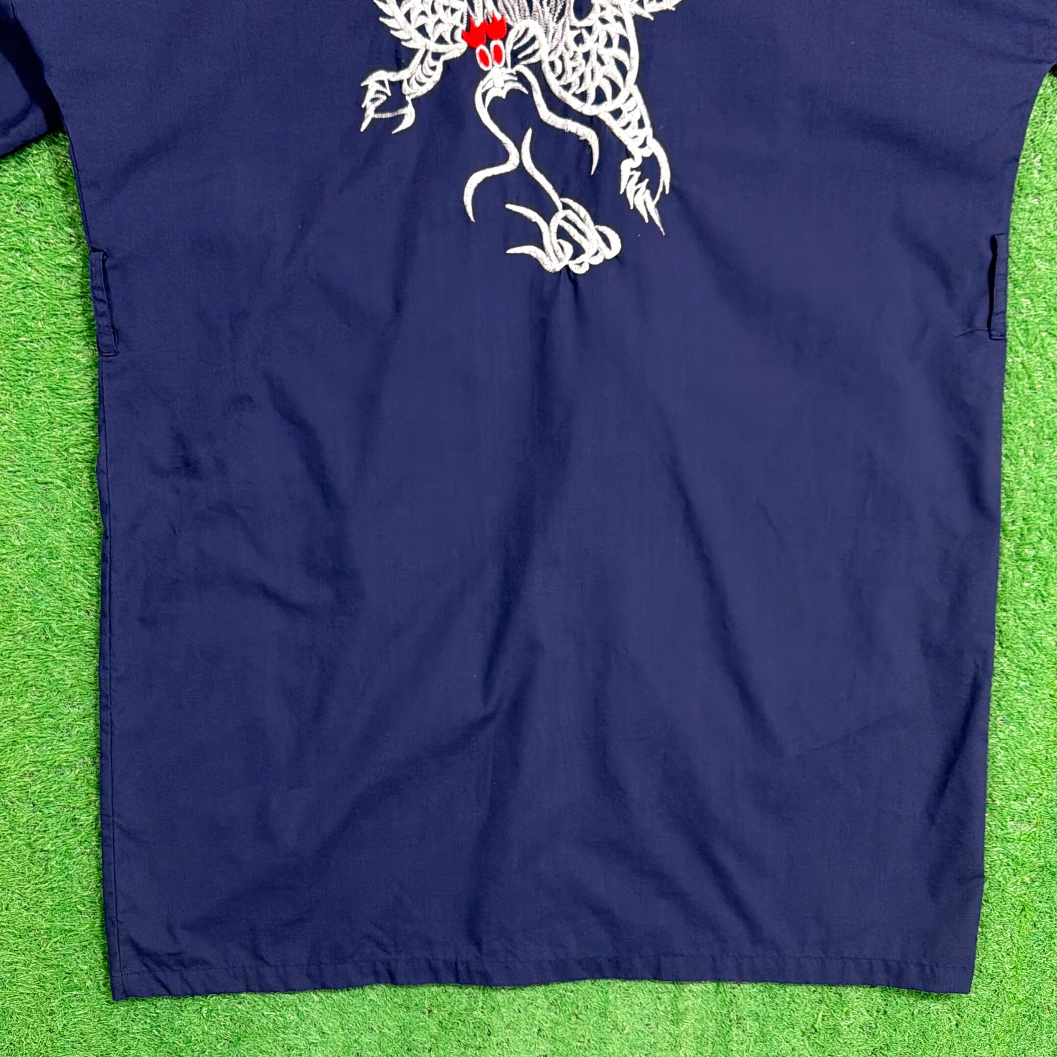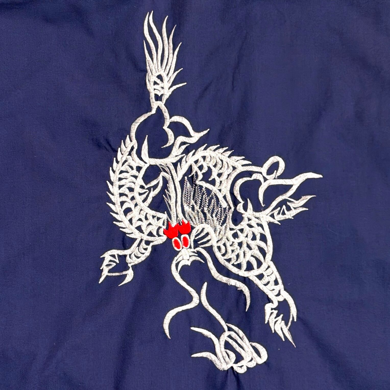 ネイビーボディに、背面とフロントに入るドラゴンの刺繍がインパクトのある一枚。シンプルな形ながらも、刺繍デザインでしっかり個性の出るアイテムです。