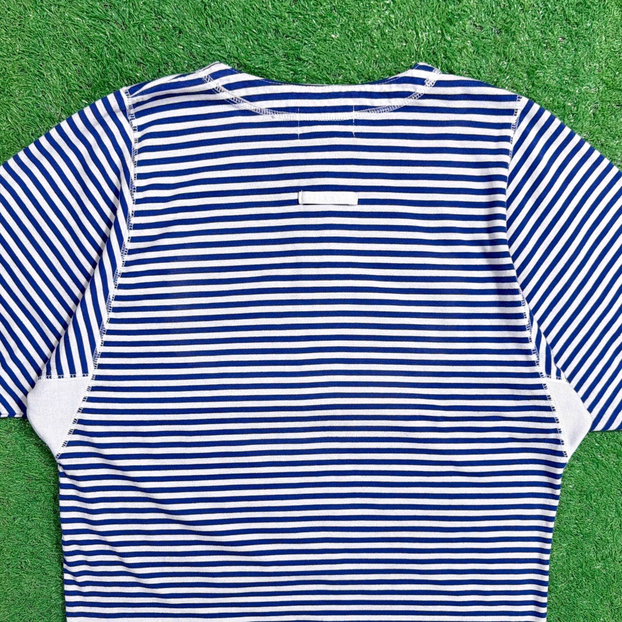 細めのボーダーが入ったデザインで、ブルー×ホワイトの爽やかな配色が特徴的な一枚。シンプルながらもスタイリングに程よくアクセントを加えてくれるアイテムです。