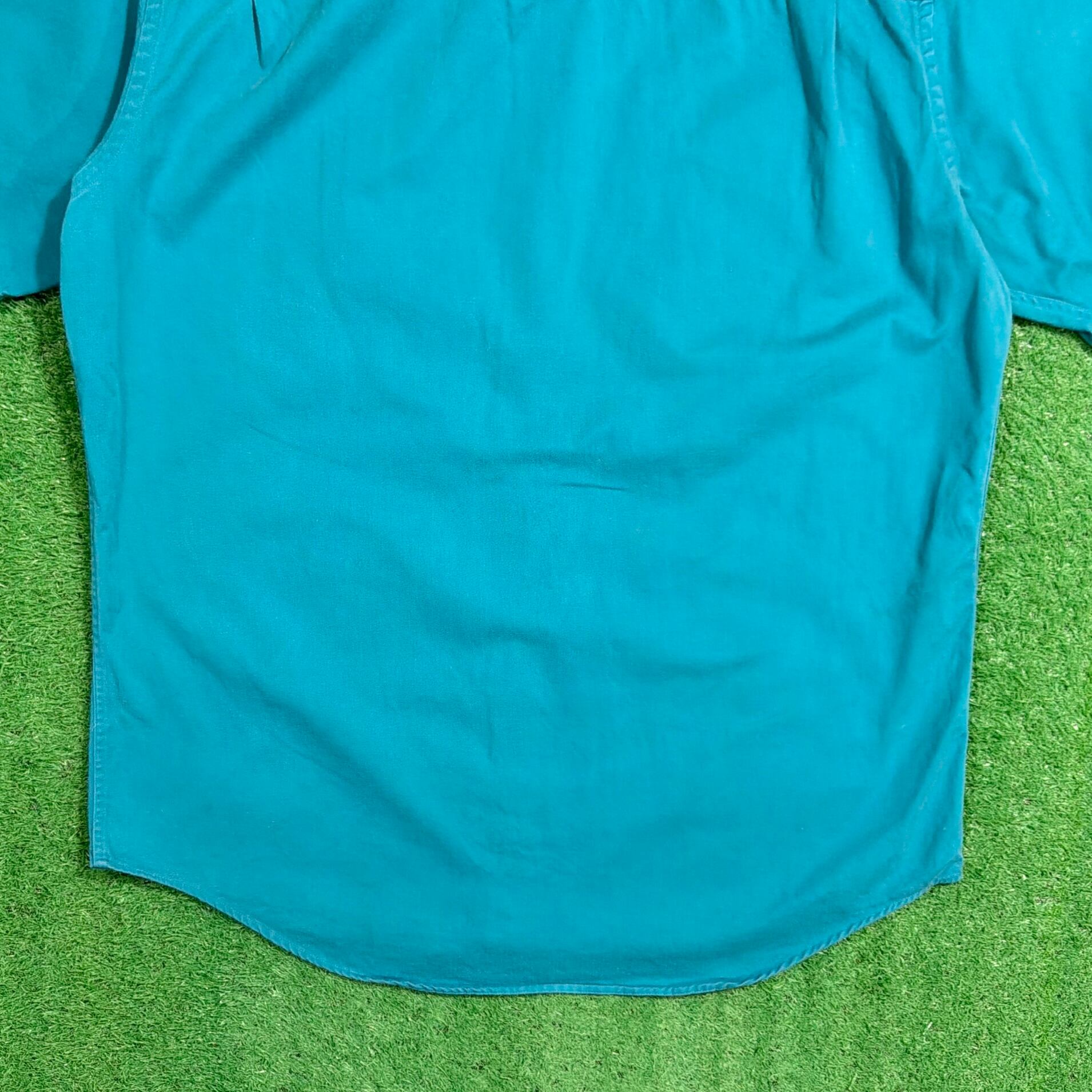 鮮やかなターコイズブルーが印象的な一枚で、シンプルながらもカラーでしっかり存在感の出るアイテム。無地ベースでスタイリングにも取り入れやすいのが特徴です。