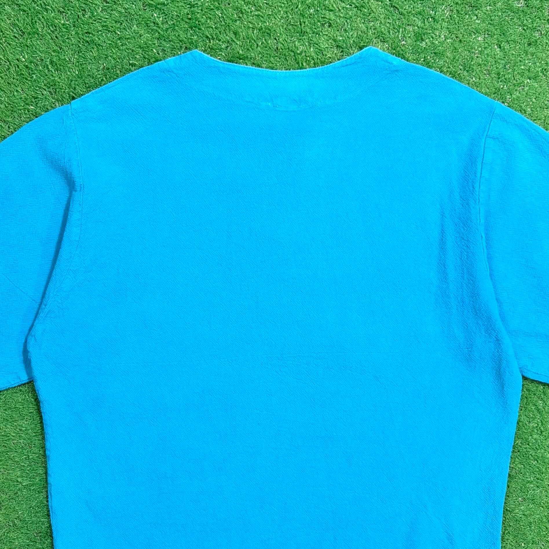 鮮やかなブルーが目を引く一枚で、シンプルながらもカラーでしっかり存在感の出るアイテム。無地デザインなのでスタイリングにも取り入れやすいのが特徴です。