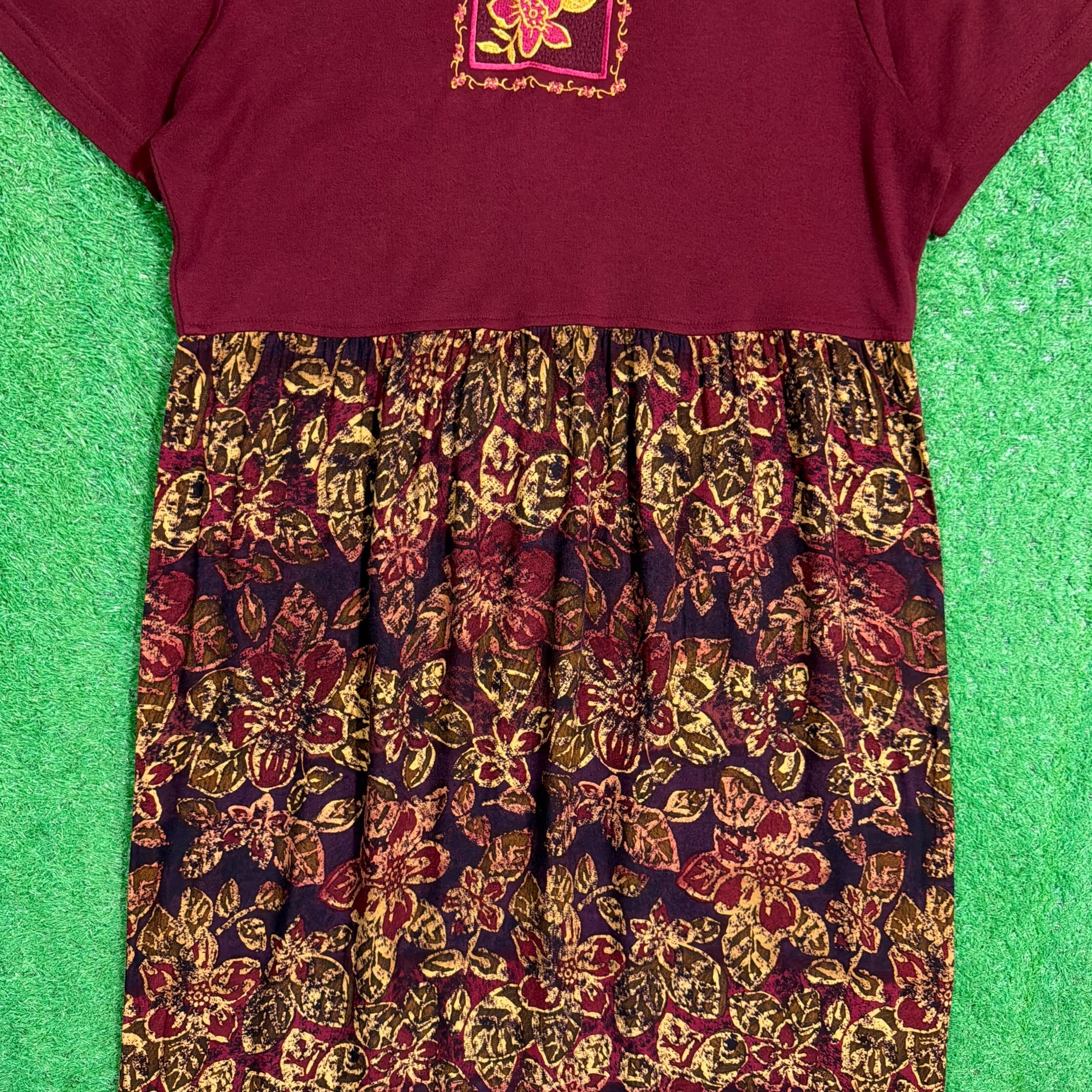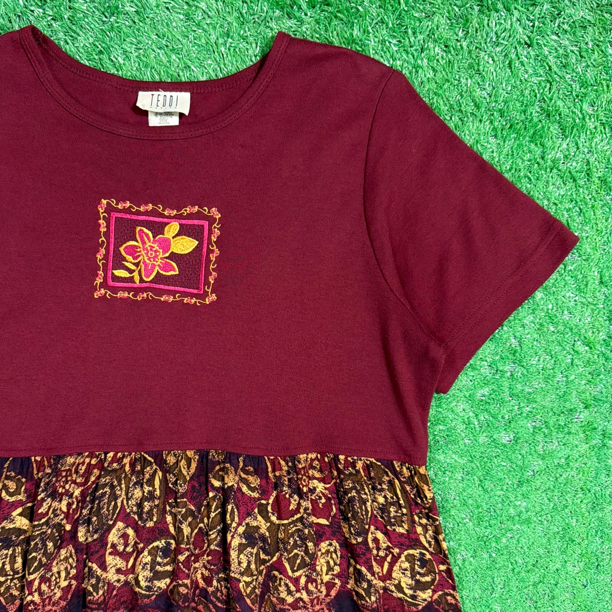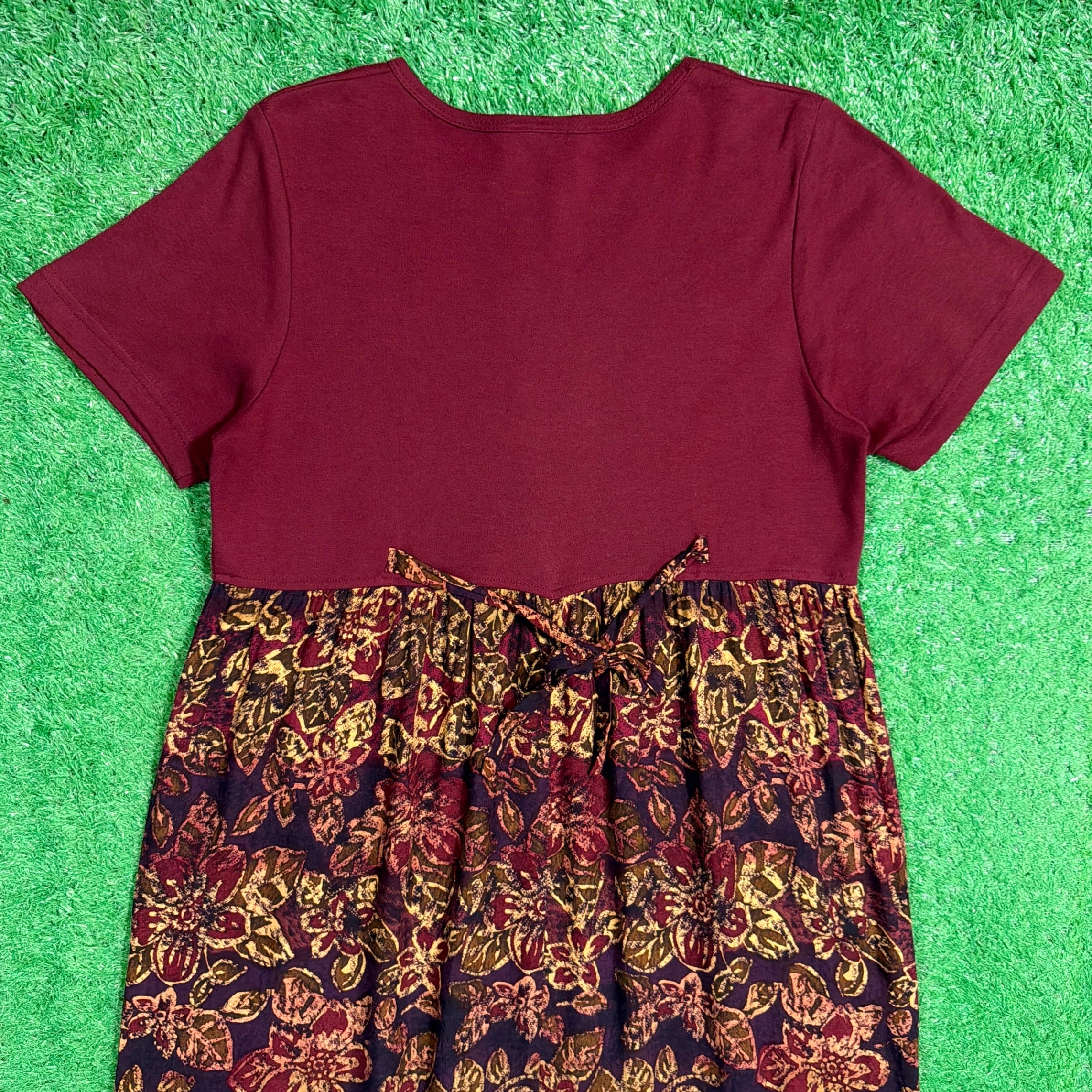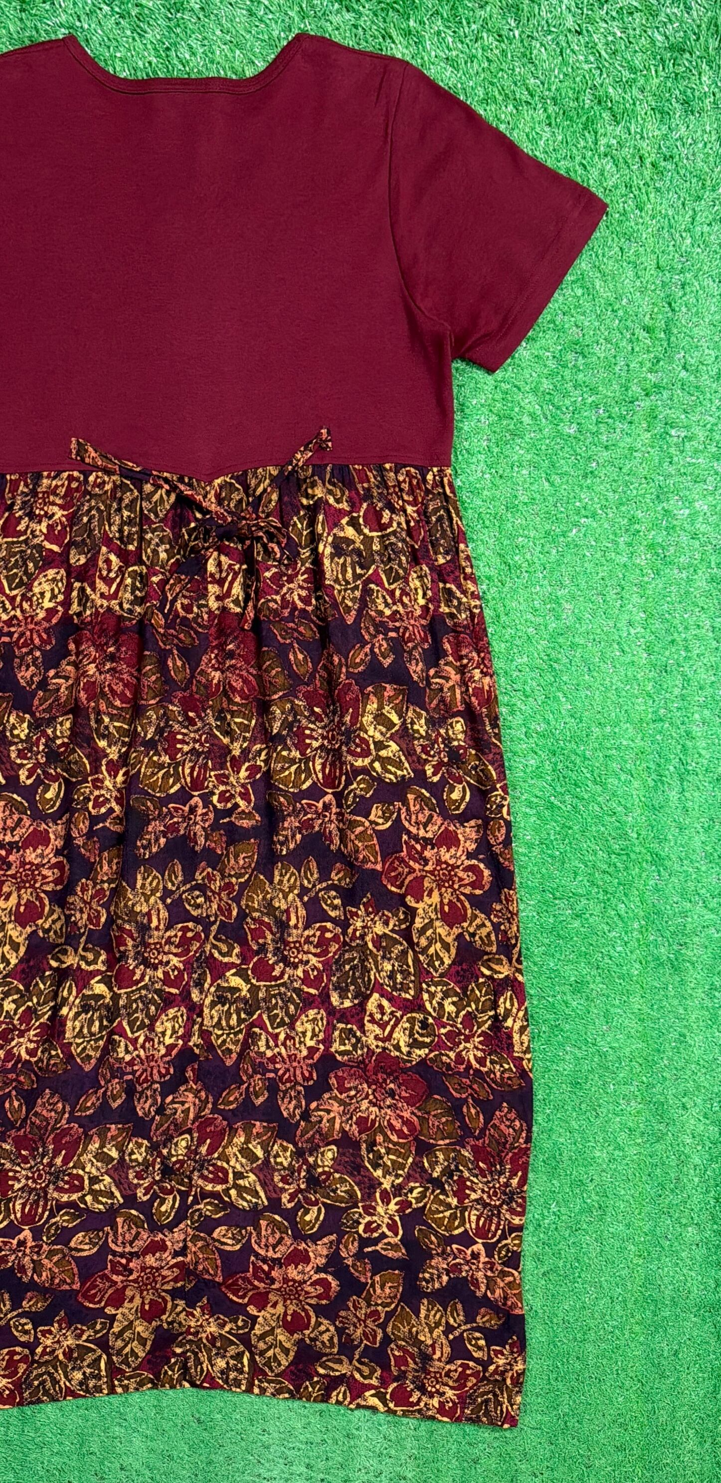 Tシャツのようなトップス部分と、総柄のレーヨンスカートが組み合わさったデザインが特徴的な一枚。トップはシンプルなボルドーカラー、スカートは落ち着いたトーンの総柄で、1枚でスタイリングが完成するアイテムです。