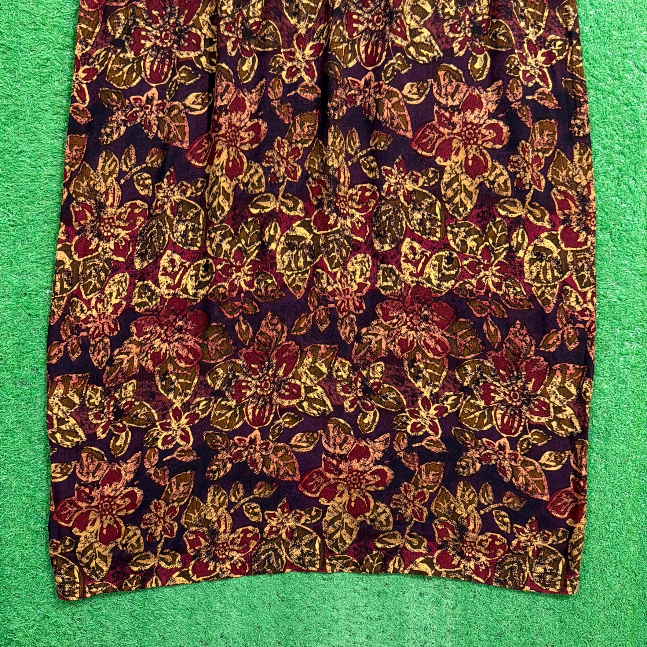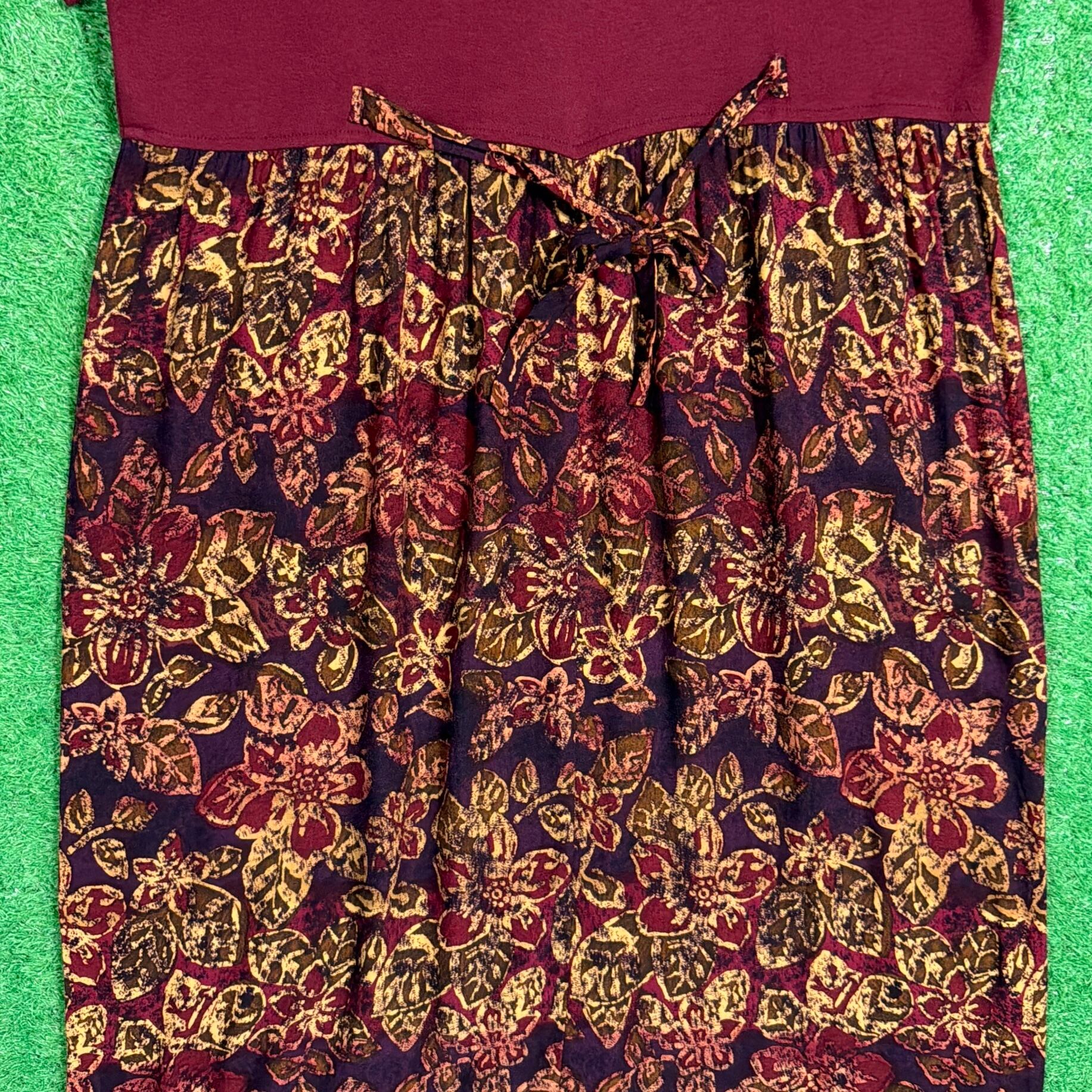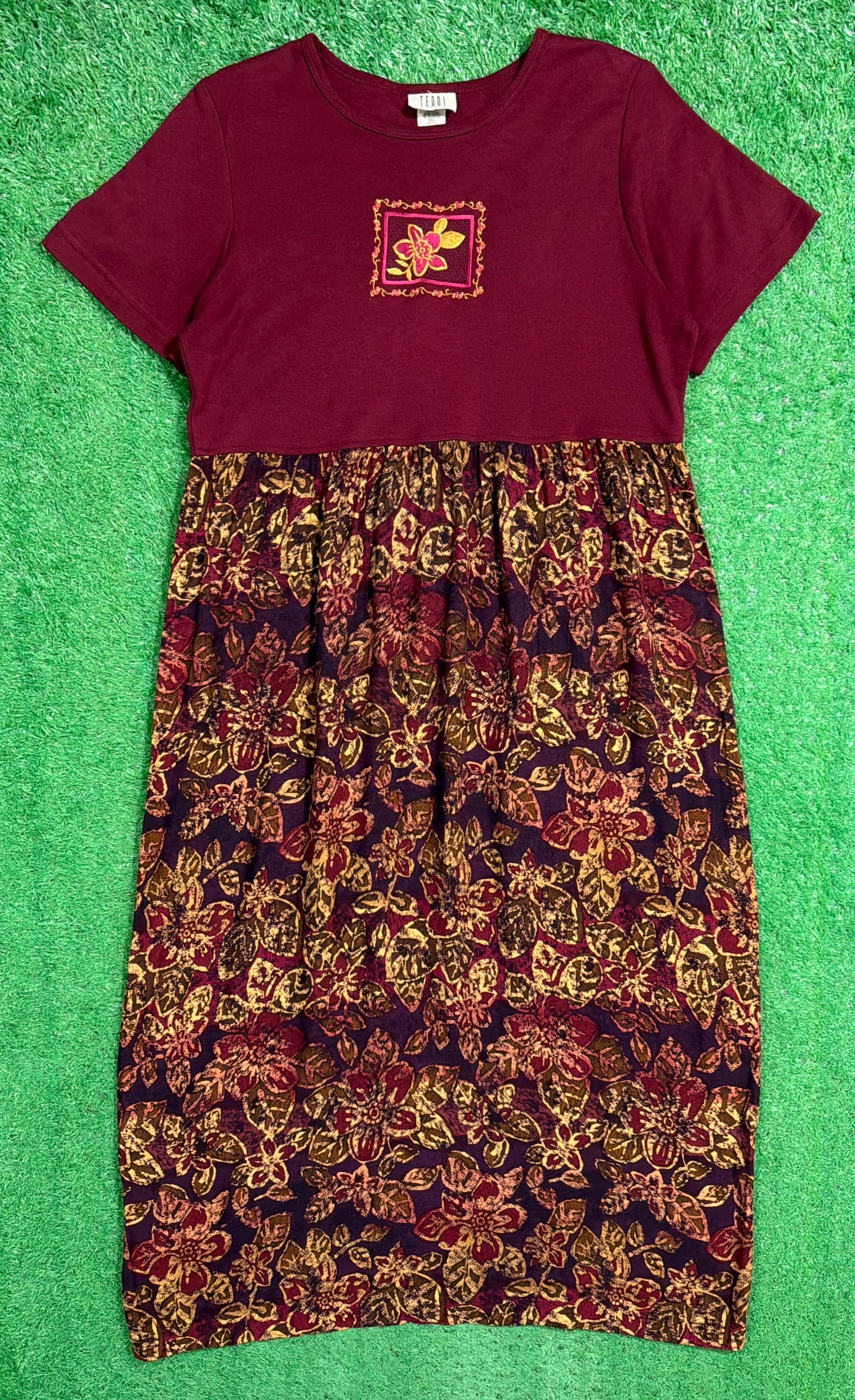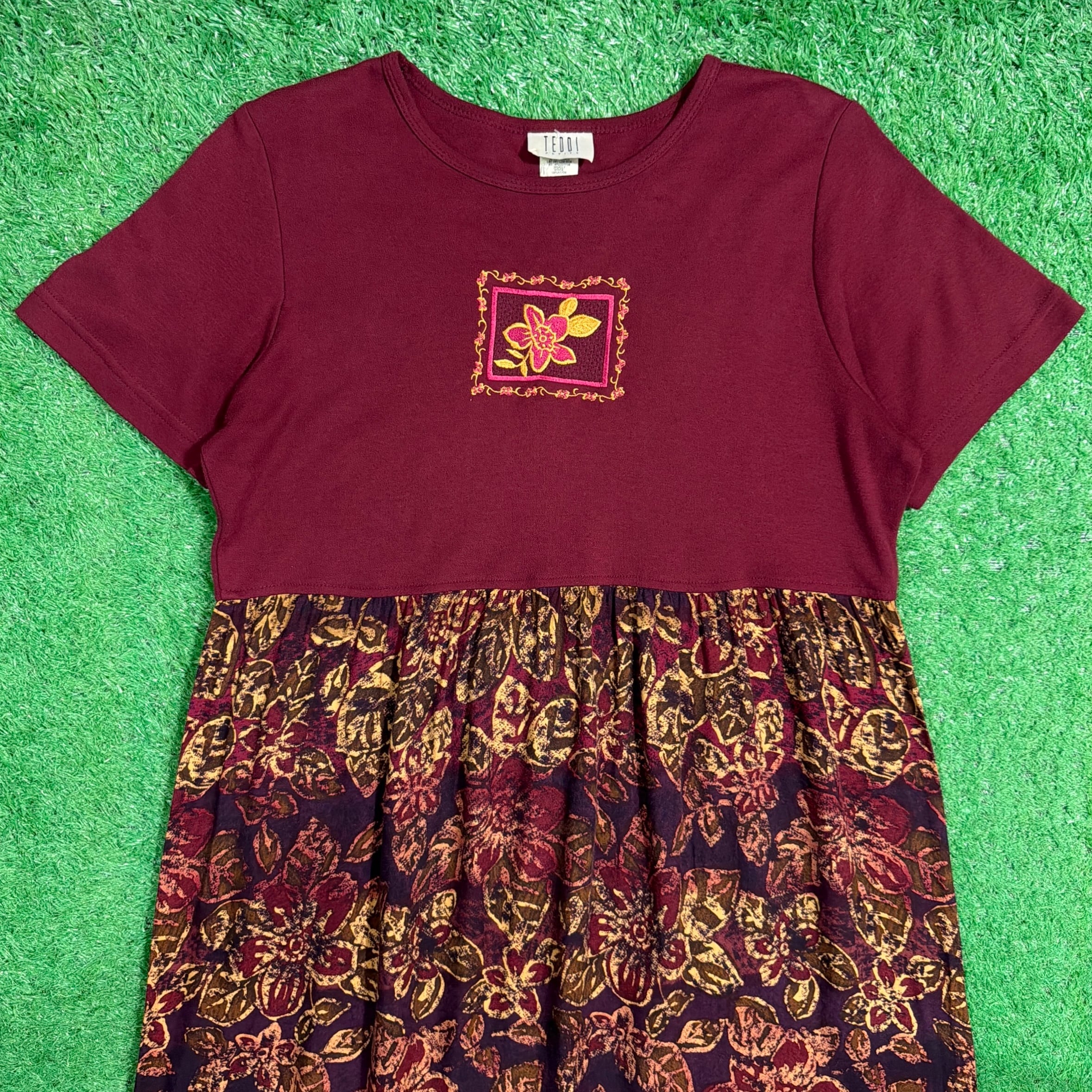 Tシャツのようなトップス部分と、総柄のレーヨンスカートが組み合わさったデザインが特徴的な一枚。トップはシンプルなボルドーカラー、スカートは落ち着いたトーンの総柄で、1枚でスタイリングが完成するアイテムです。