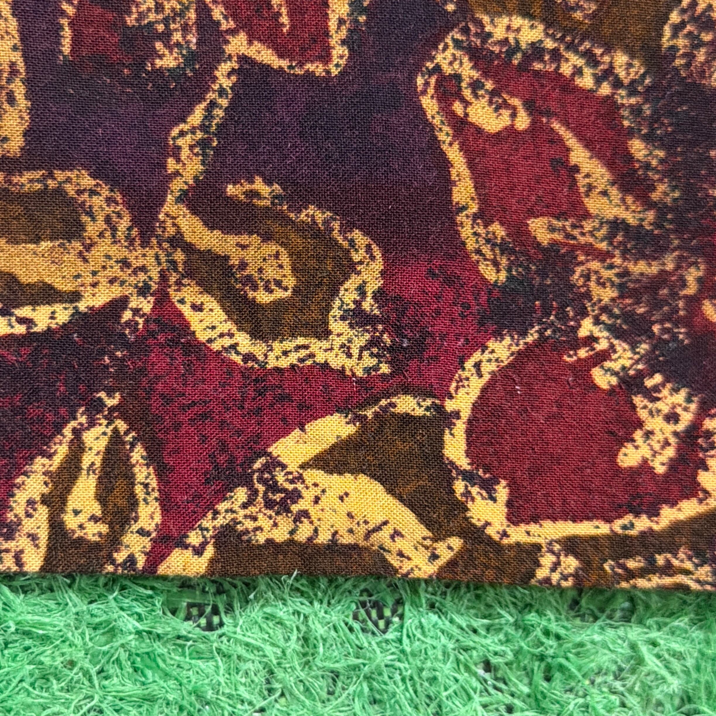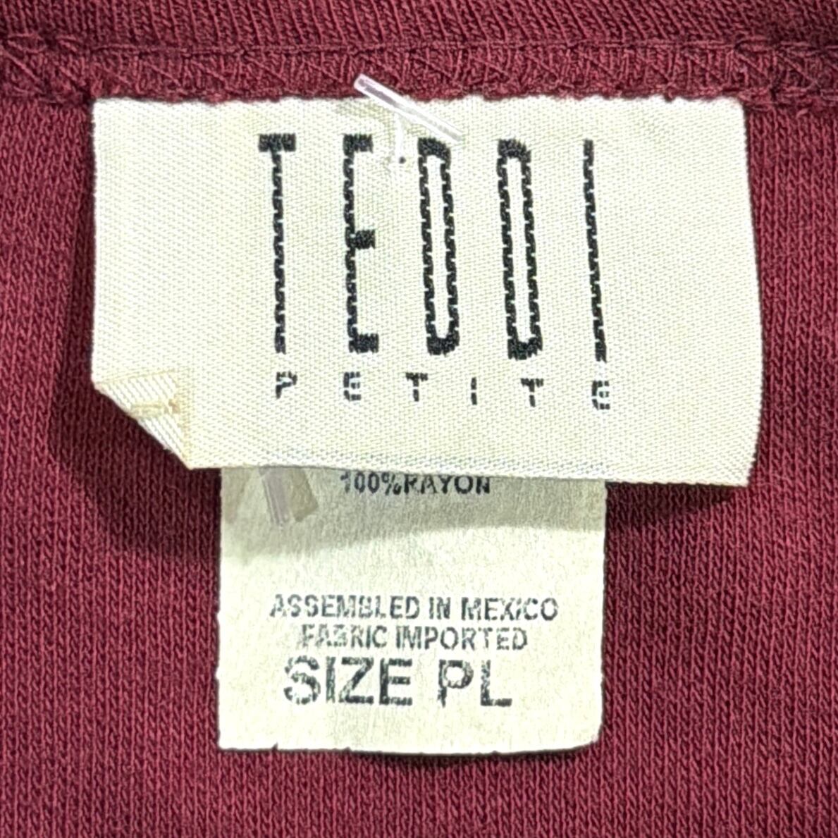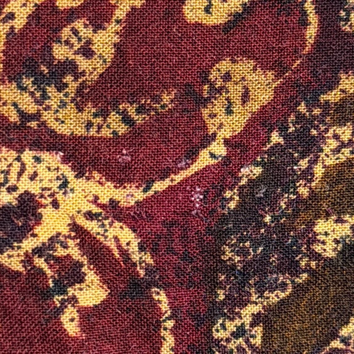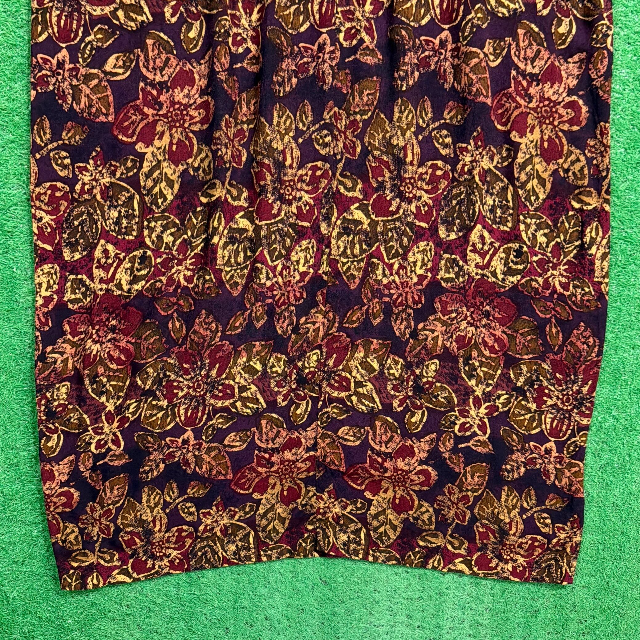 Tシャツのようなトップス部分と、総柄のレーヨンスカートが組み合わさったデザインが特徴的な一枚。トップはシンプルなボルドーカラー、スカートは落ち着いたトーンの総柄で、1枚でスタイリングが完成するアイテムです。
