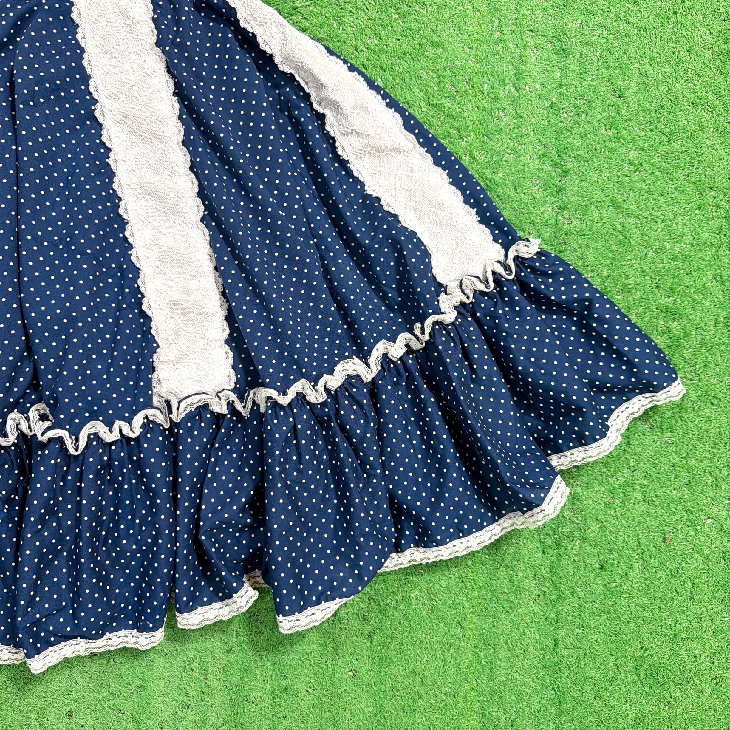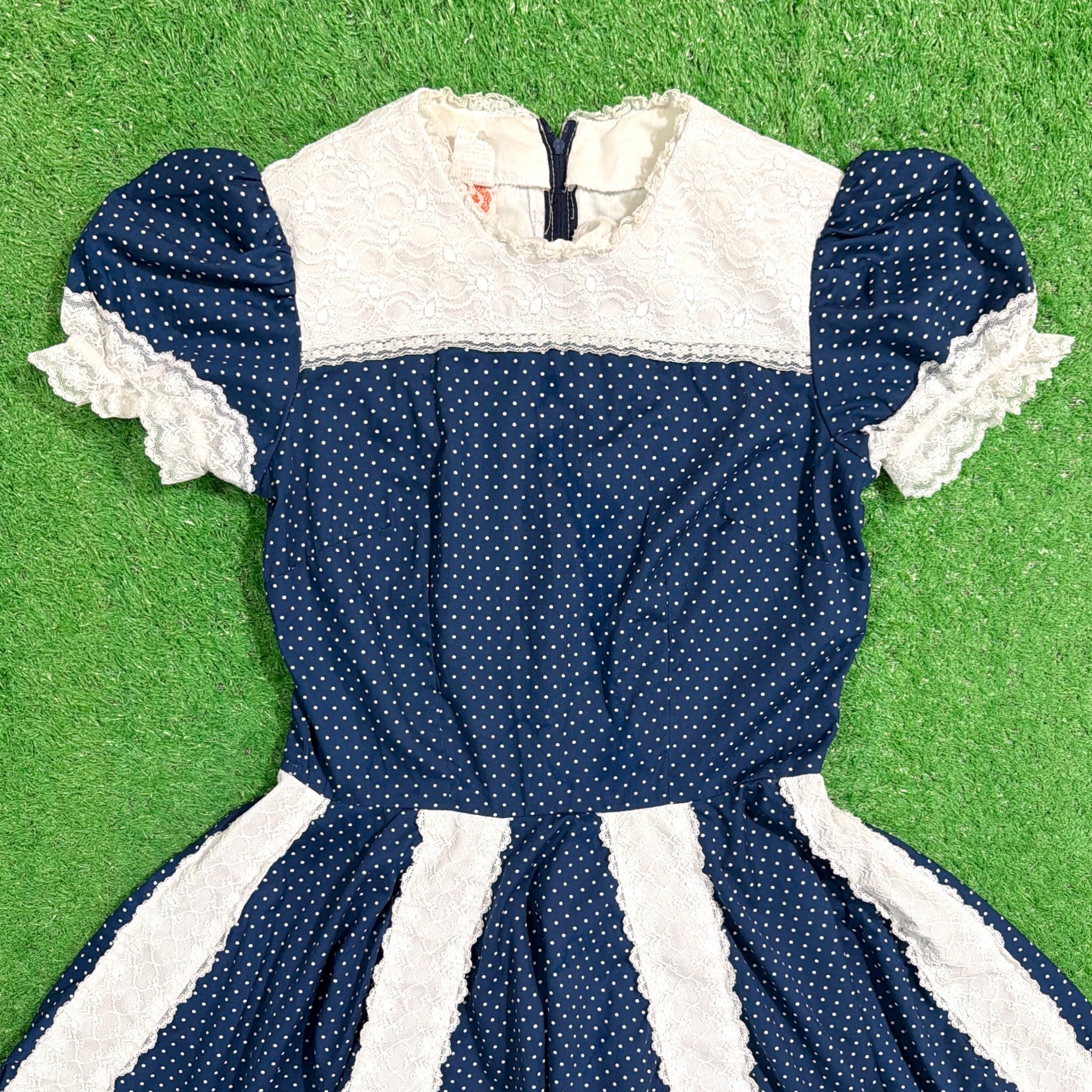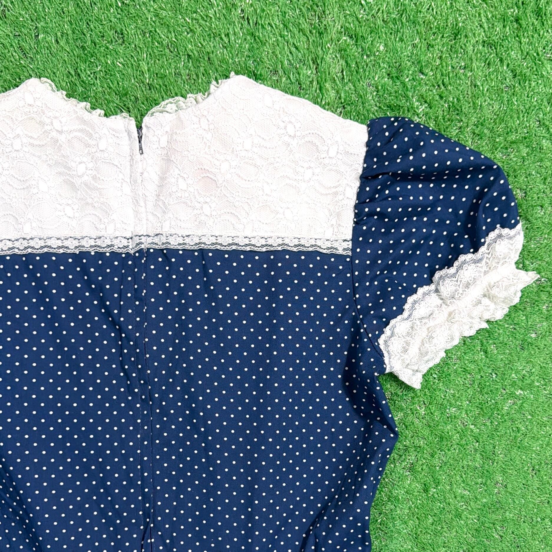 ネイビーベースに細かなドット柄が入り、ホワイトのレースや切り替えデザインがアクセントになった一枚。クラシカルで可愛らしい雰囲気がしっかり出る、80sらしいデザインです。