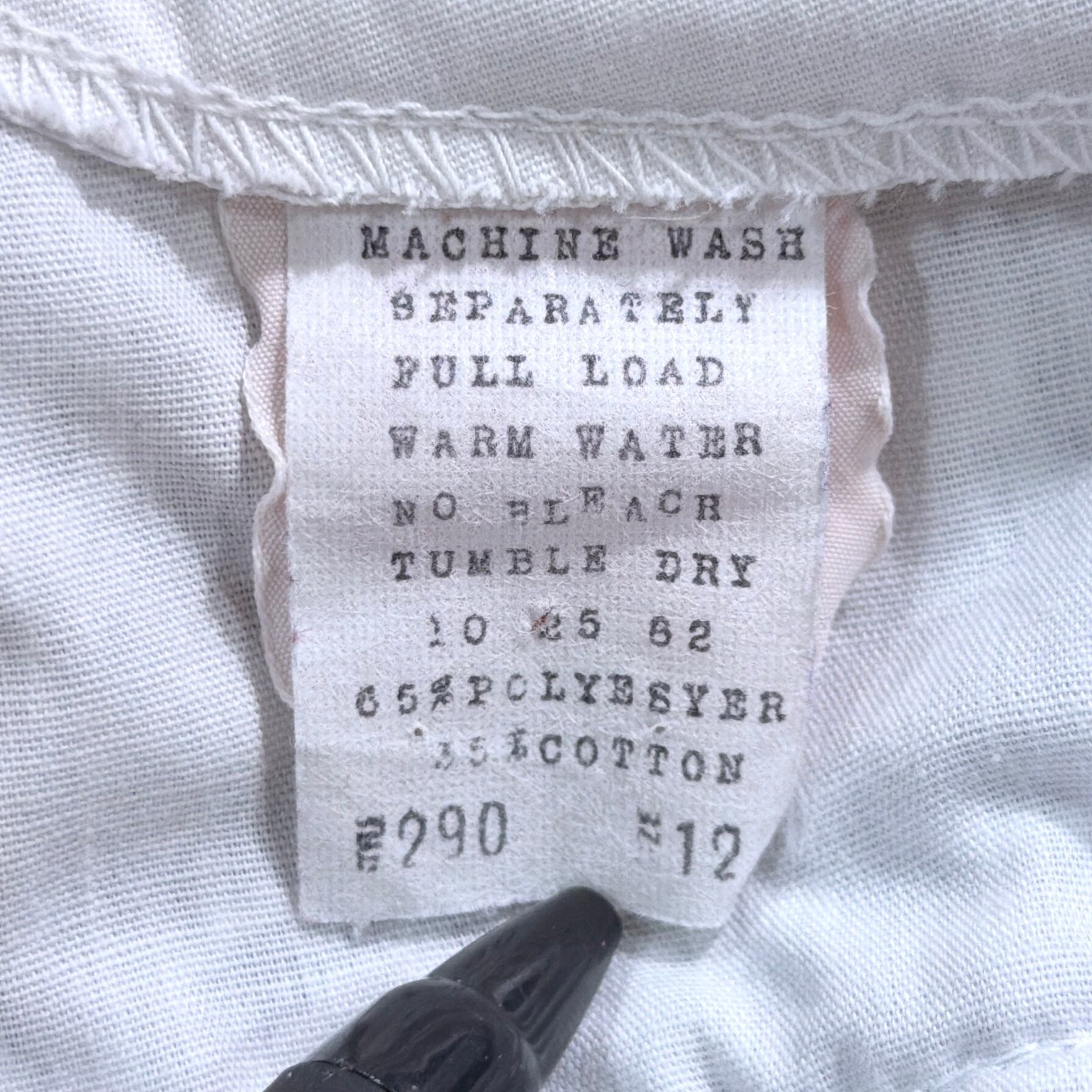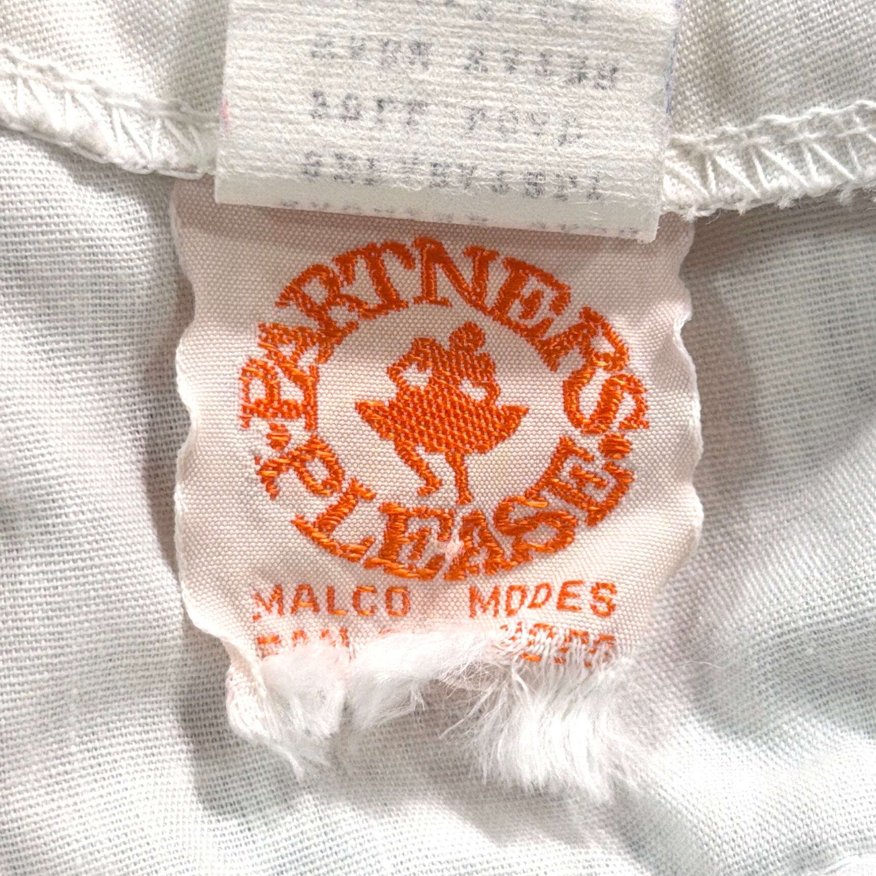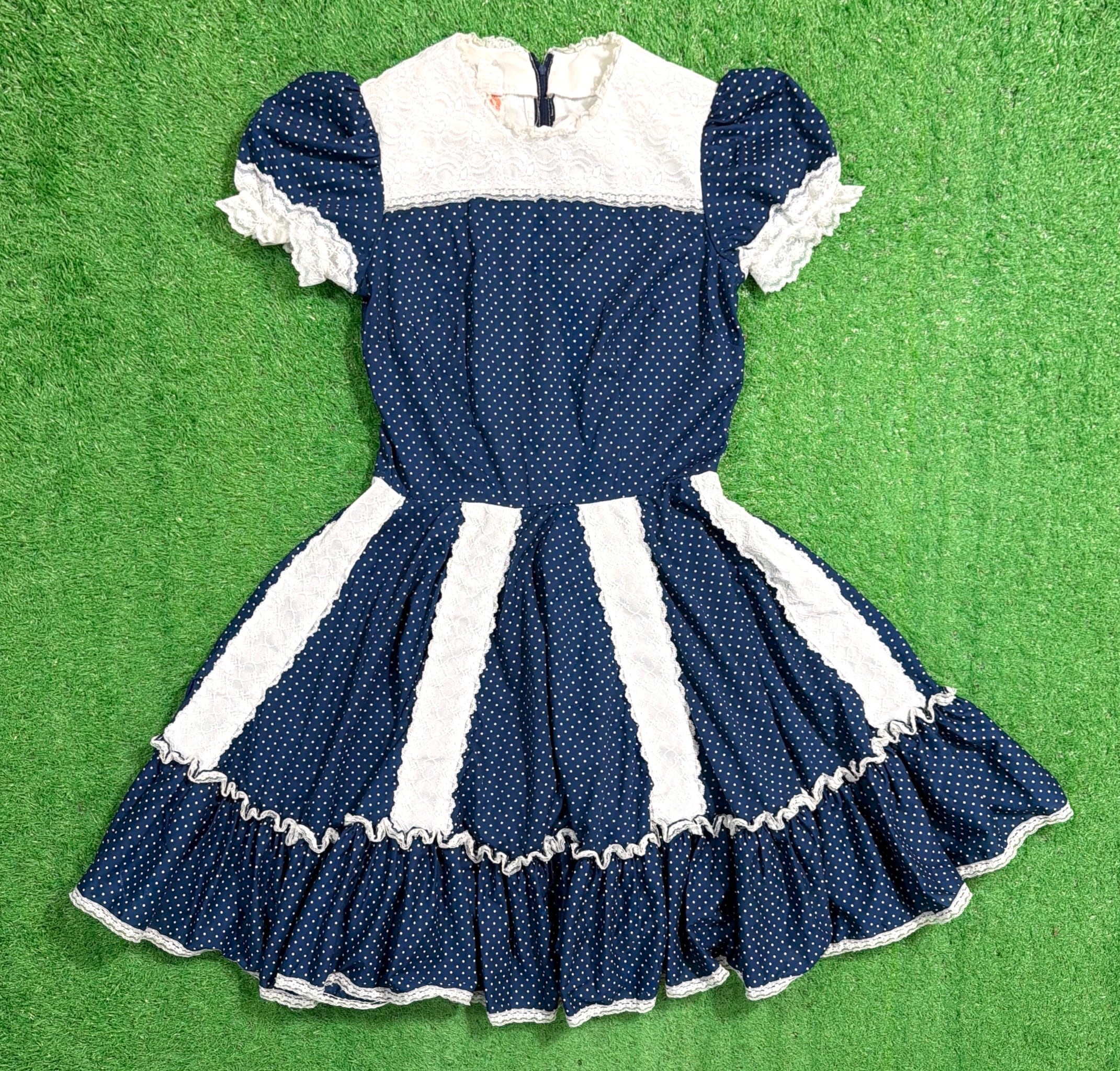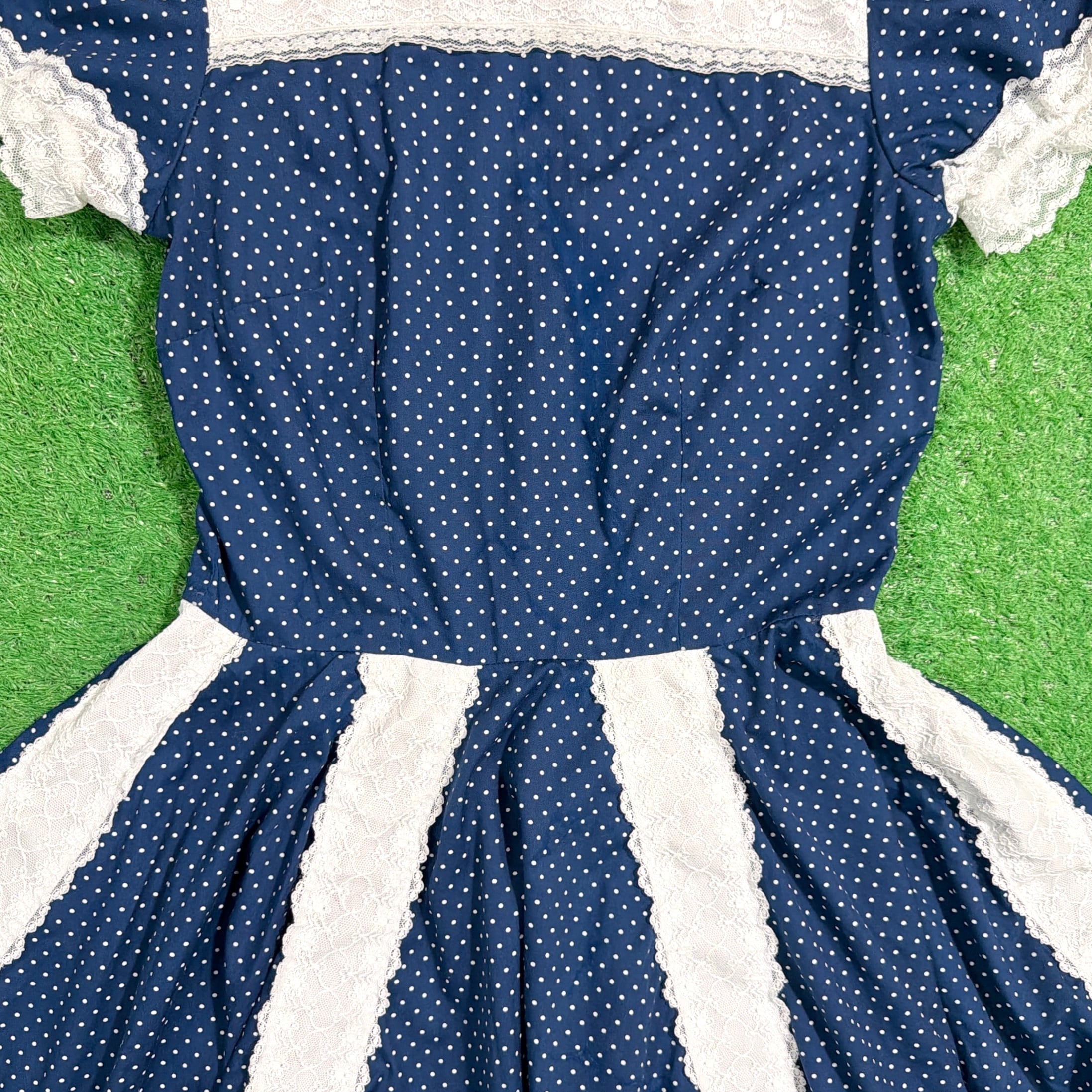 ネイビーベースに細かなドット柄が入り、ホワイトのレースや切り替えデザインがアクセントになった一枚。クラシカルで可愛らしい雰囲気がしっかり出る、80sらしいデザインです。