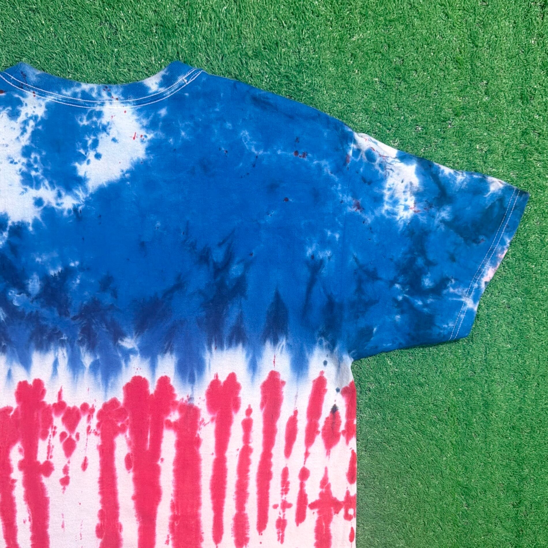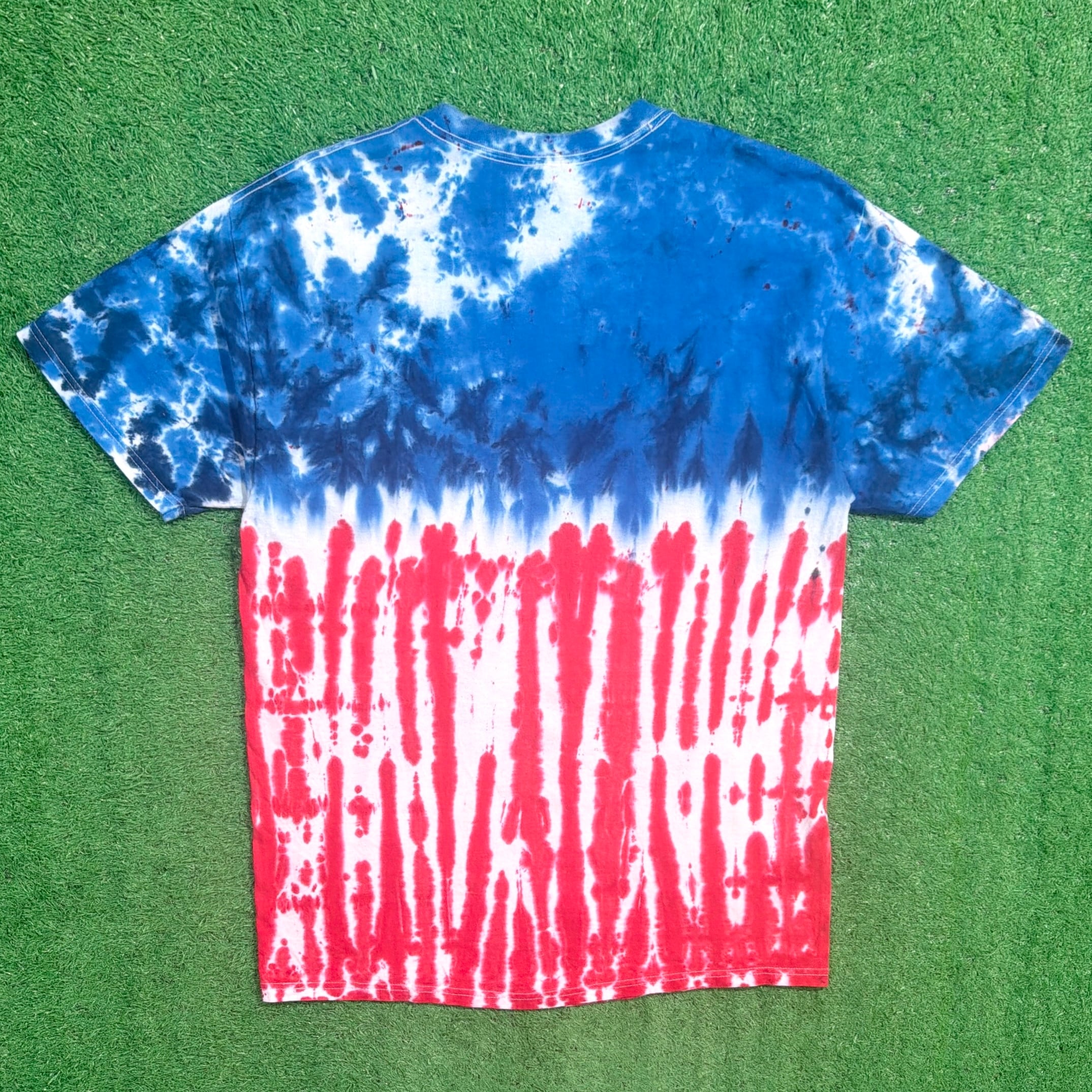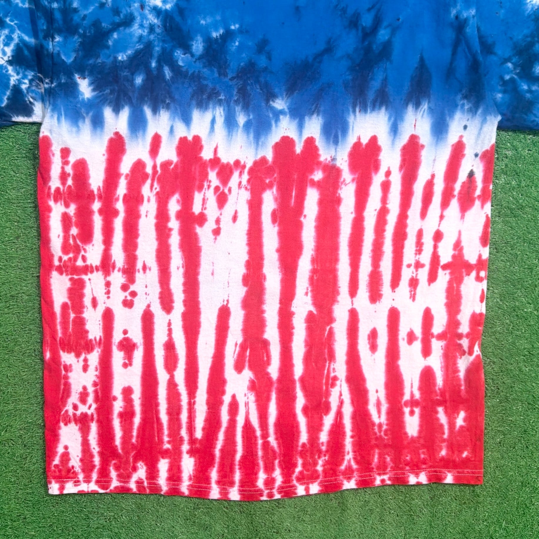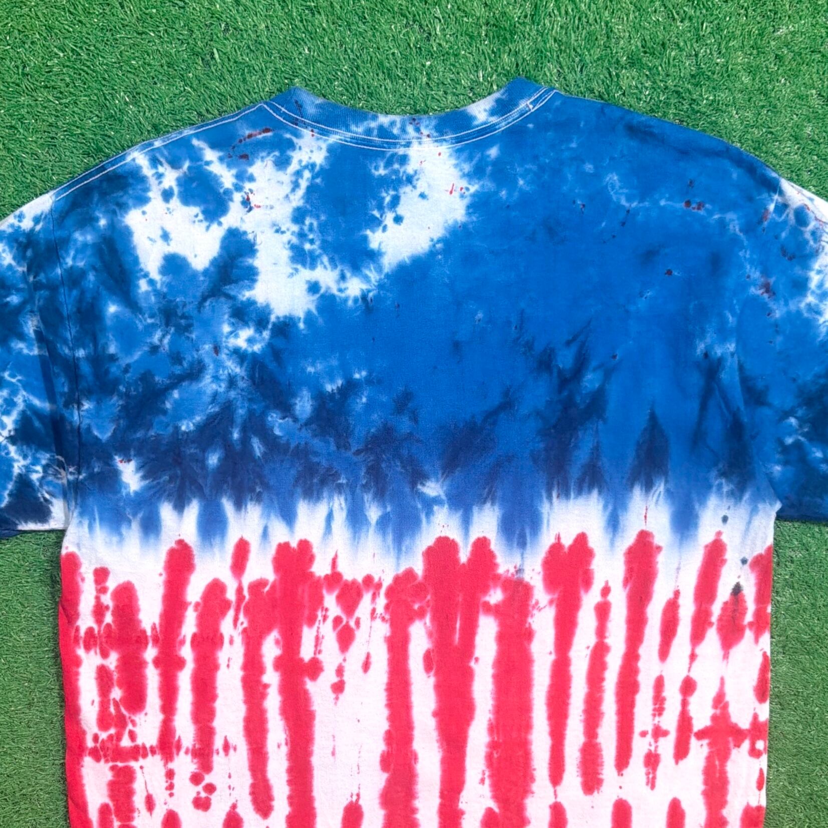 ブルー・ホワイト・レッドの配色で、星条旗をイメージしたインパクトのあるタイダイ染めが特徴的な一枚。フロントには「Walk America 2002」のロゴとグラフィックがプリントされています。