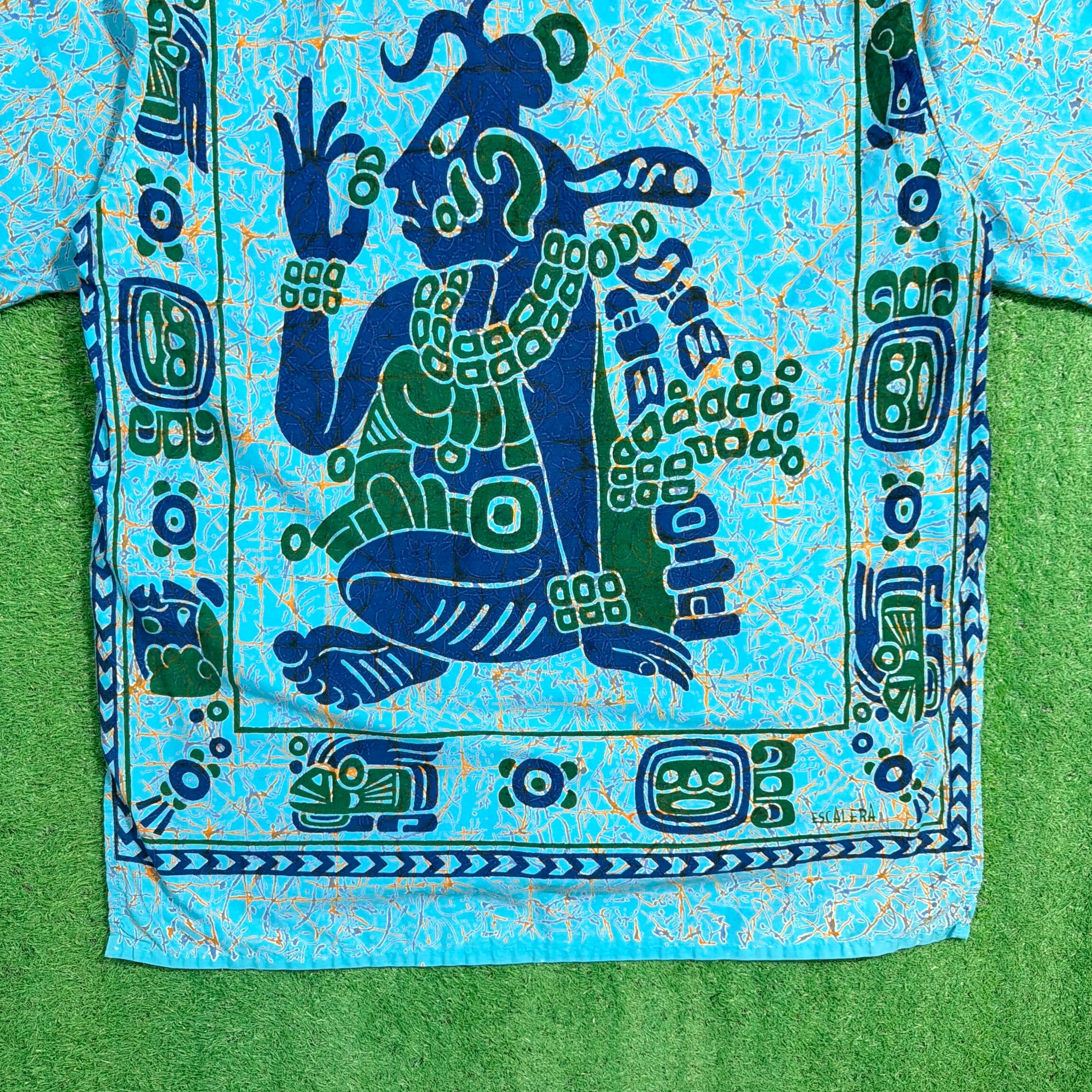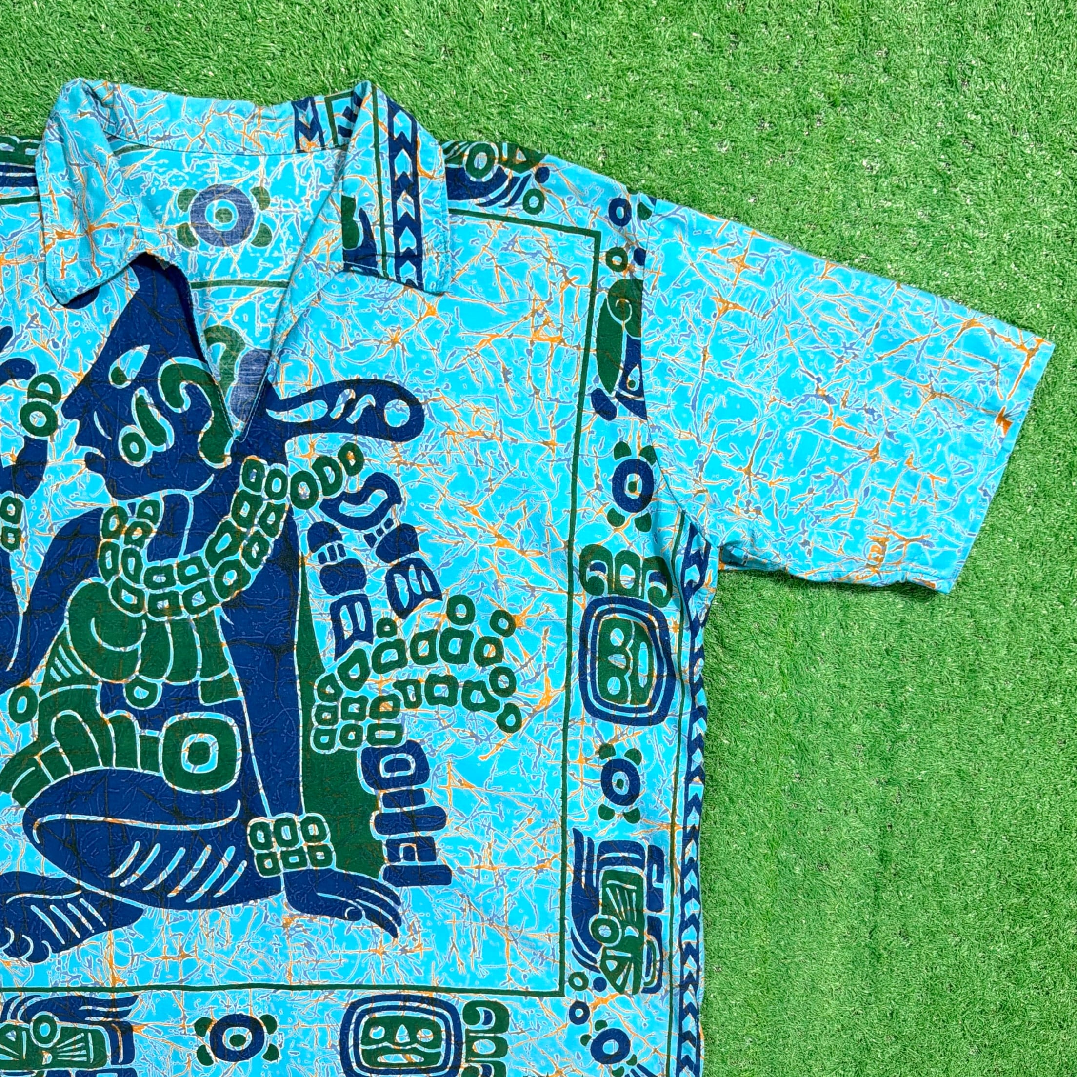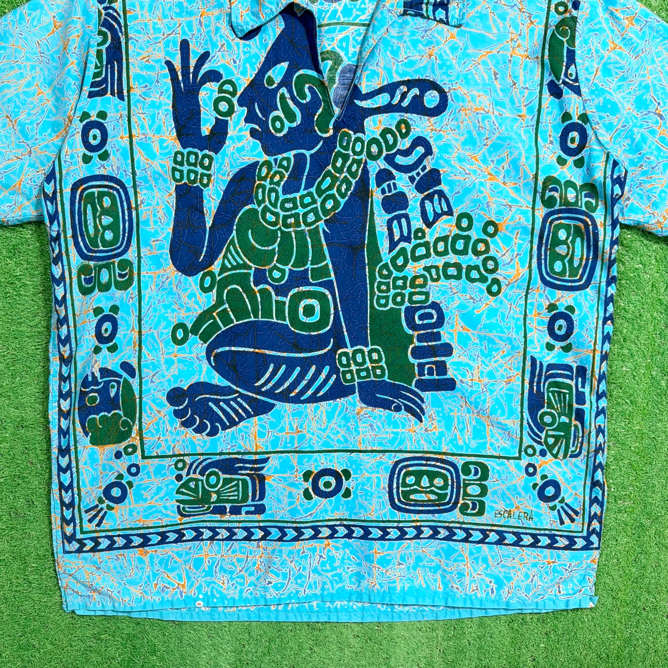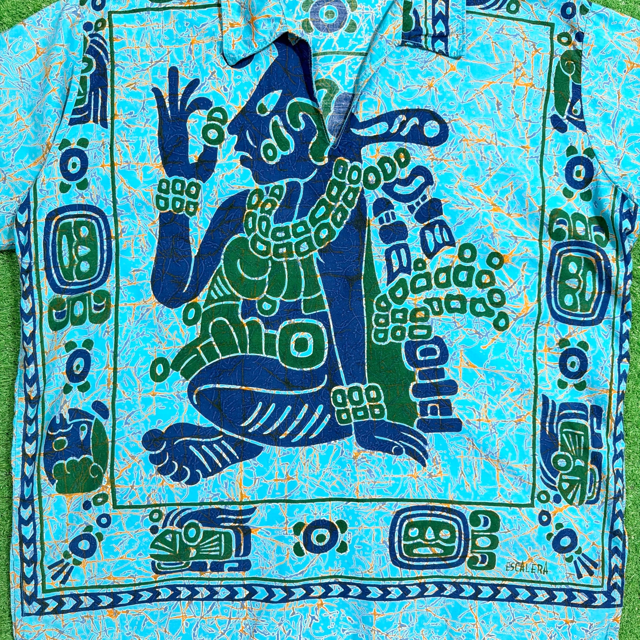 ターコイズブルーをベースに、中南米を感じさせるような人物モチーフや幾何学柄が大胆に配置されたインパクトのある一枚。