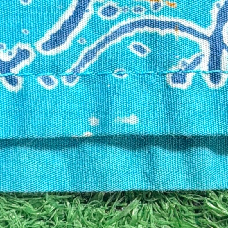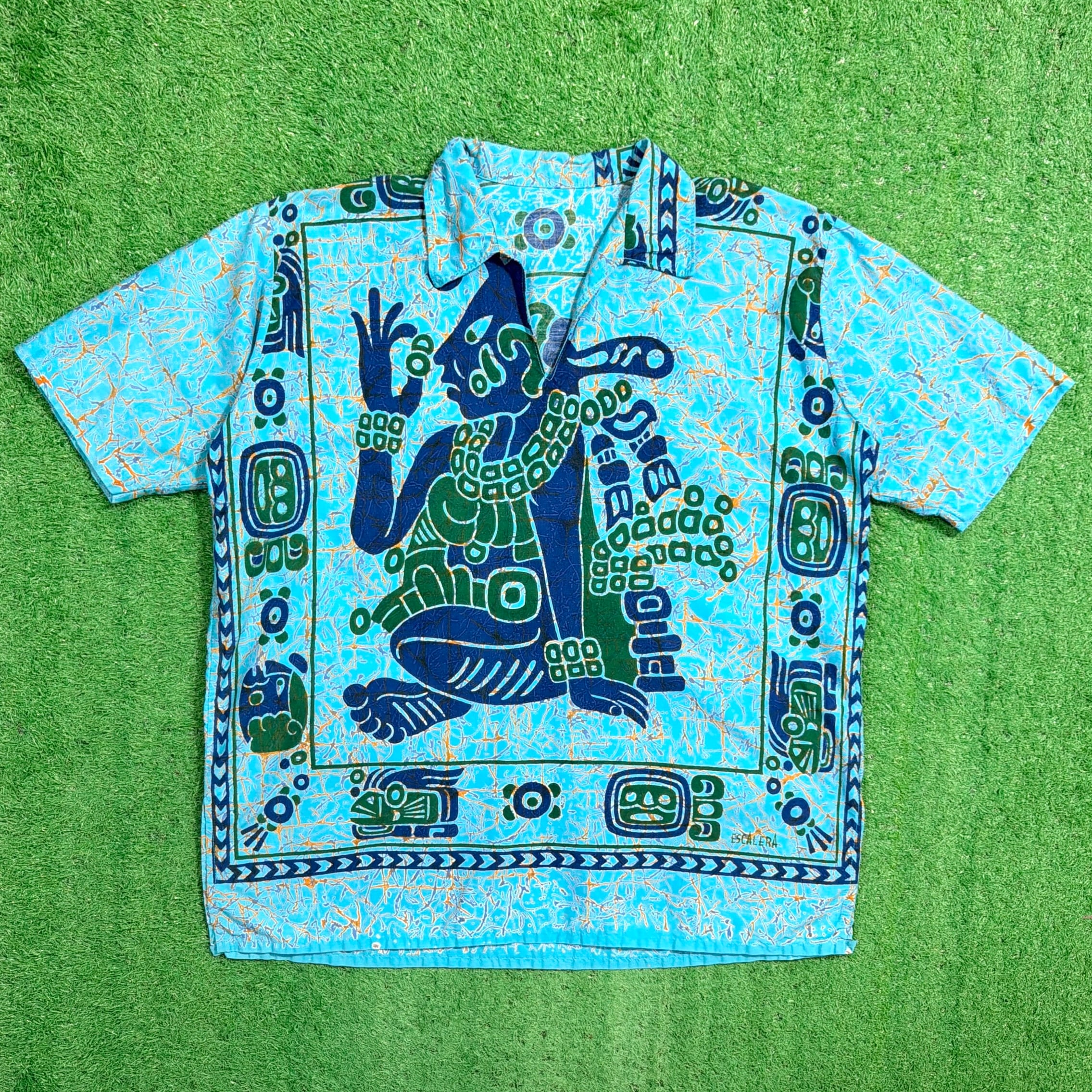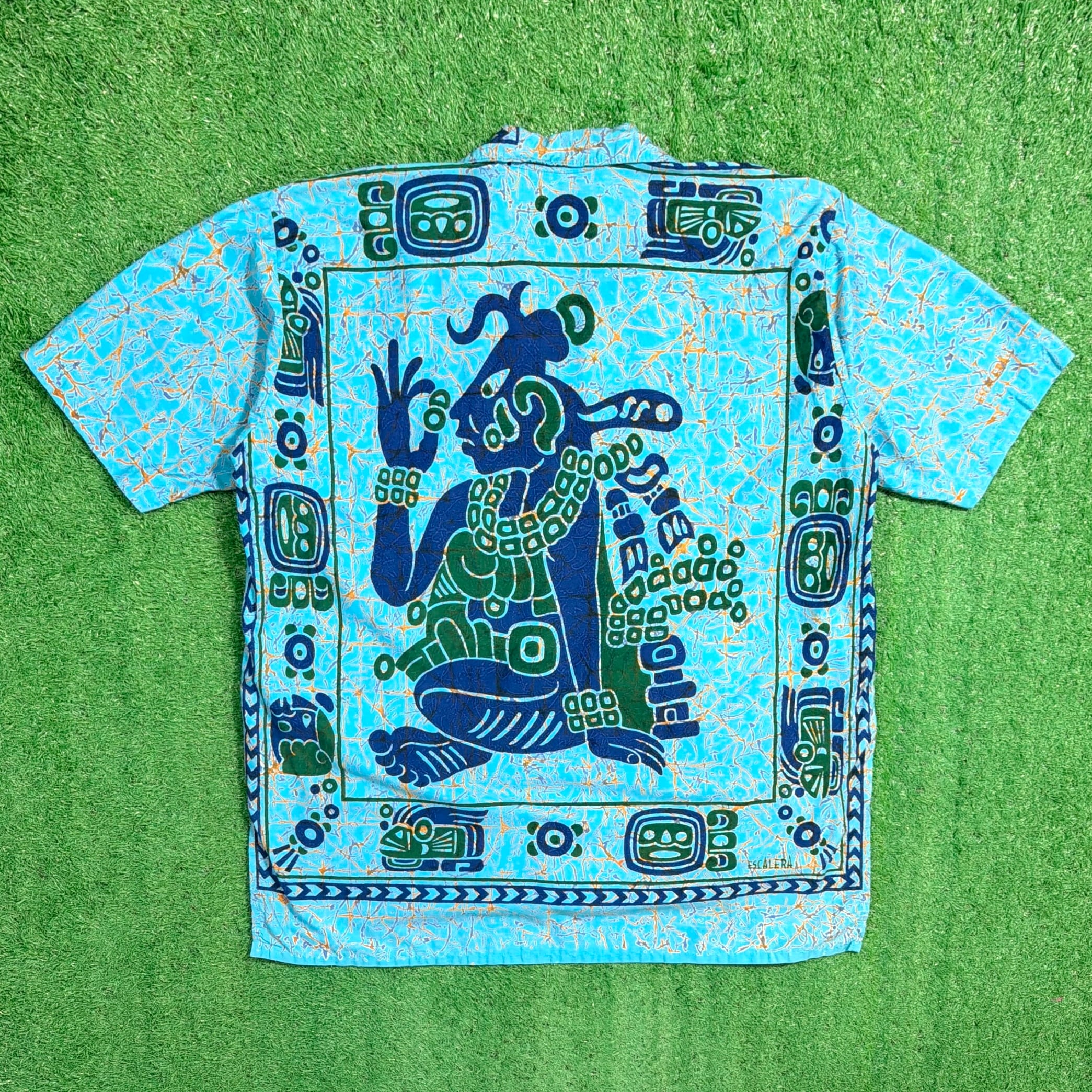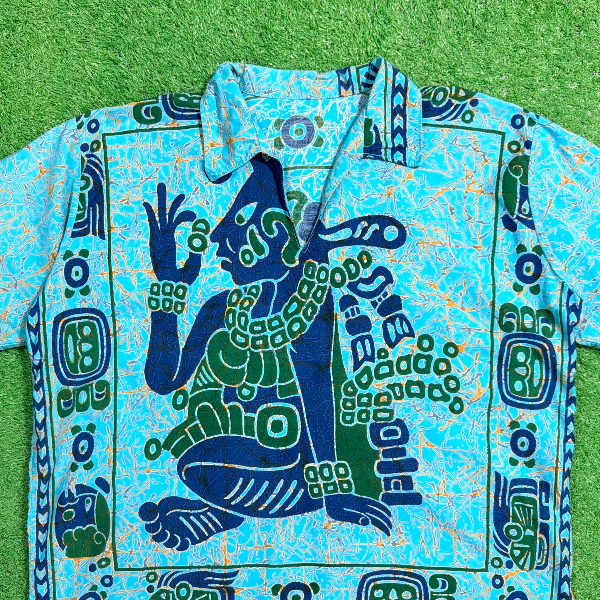 ターコイズブルーをベースに、中南米を感じさせるような人物モチーフや幾何学柄が大胆に配置されたインパクトのある一枚。