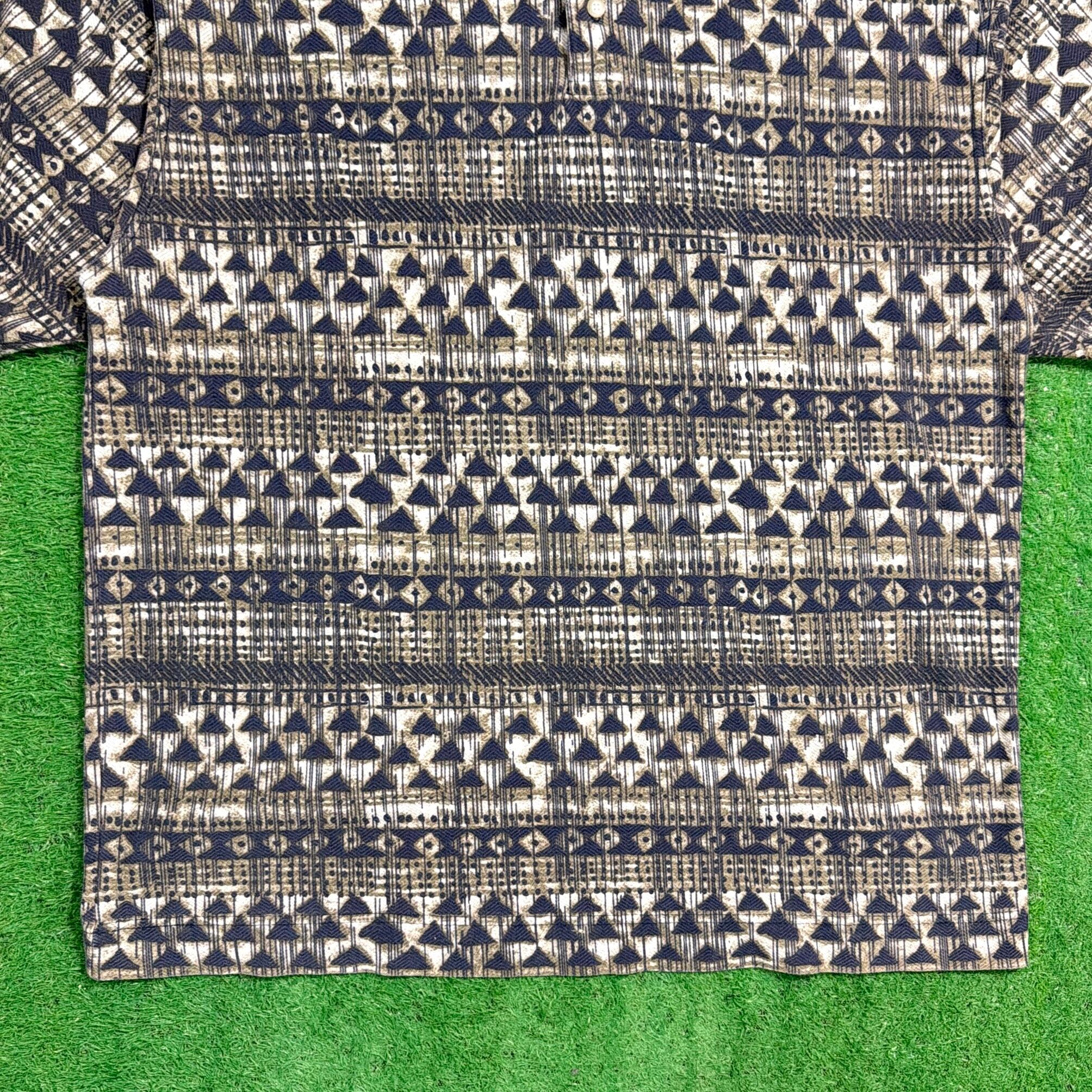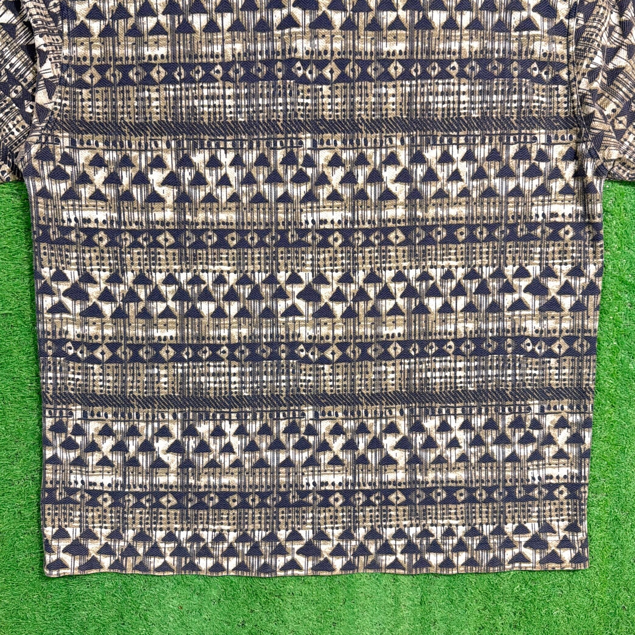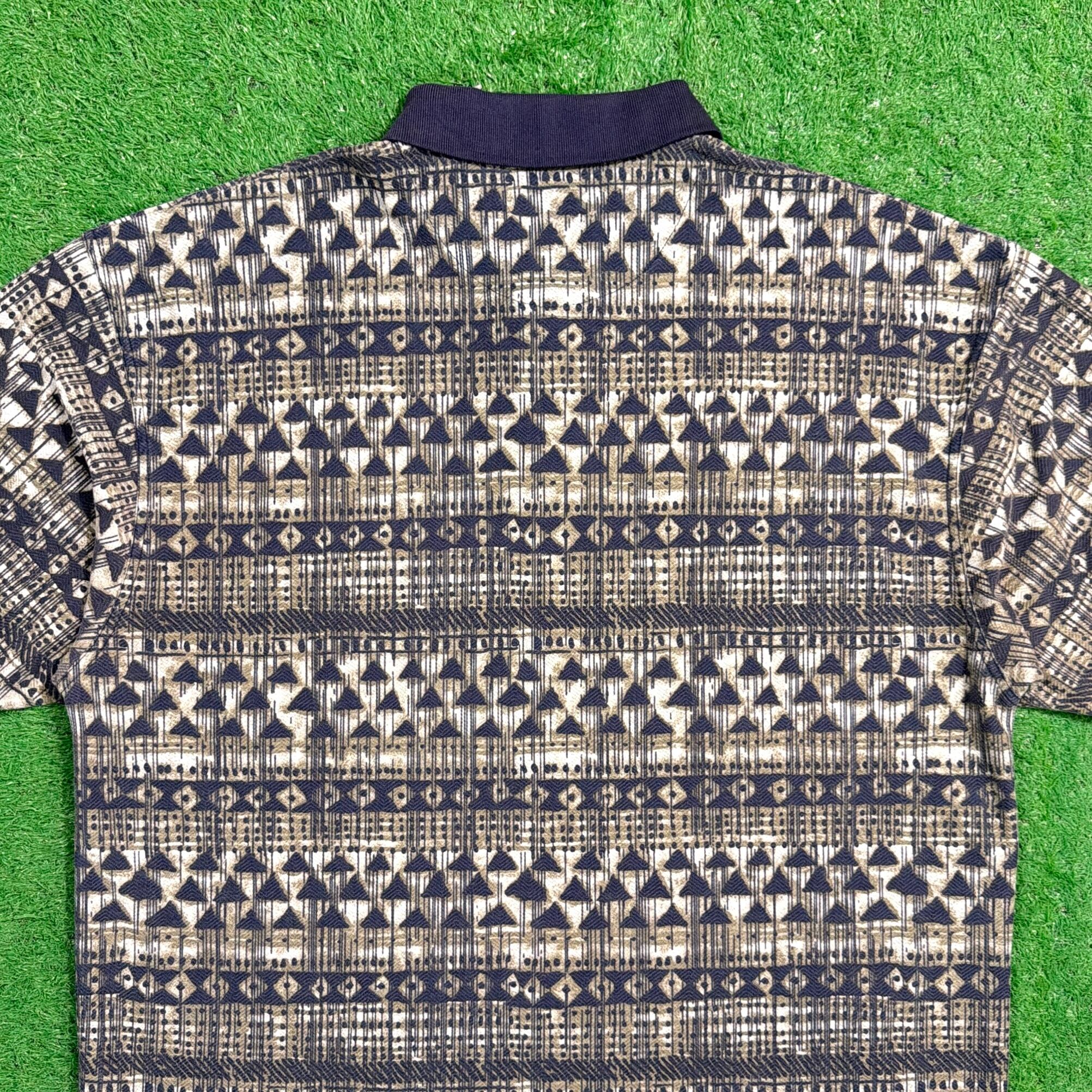 全体に細かい幾何学模様が入った総柄デザインで、落ち着いたカラーリングながらしっかり個性を感じられる一枚。90年代らしいパターンで、スタイリングの主役にもなるアイテムです。