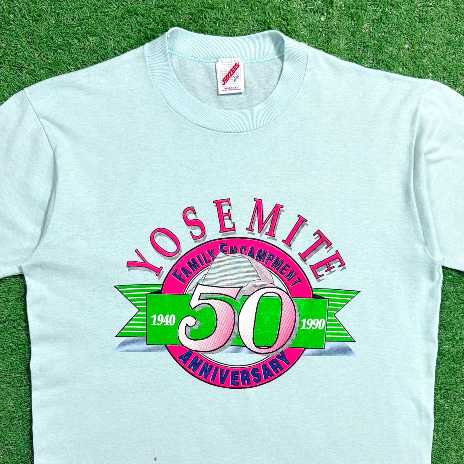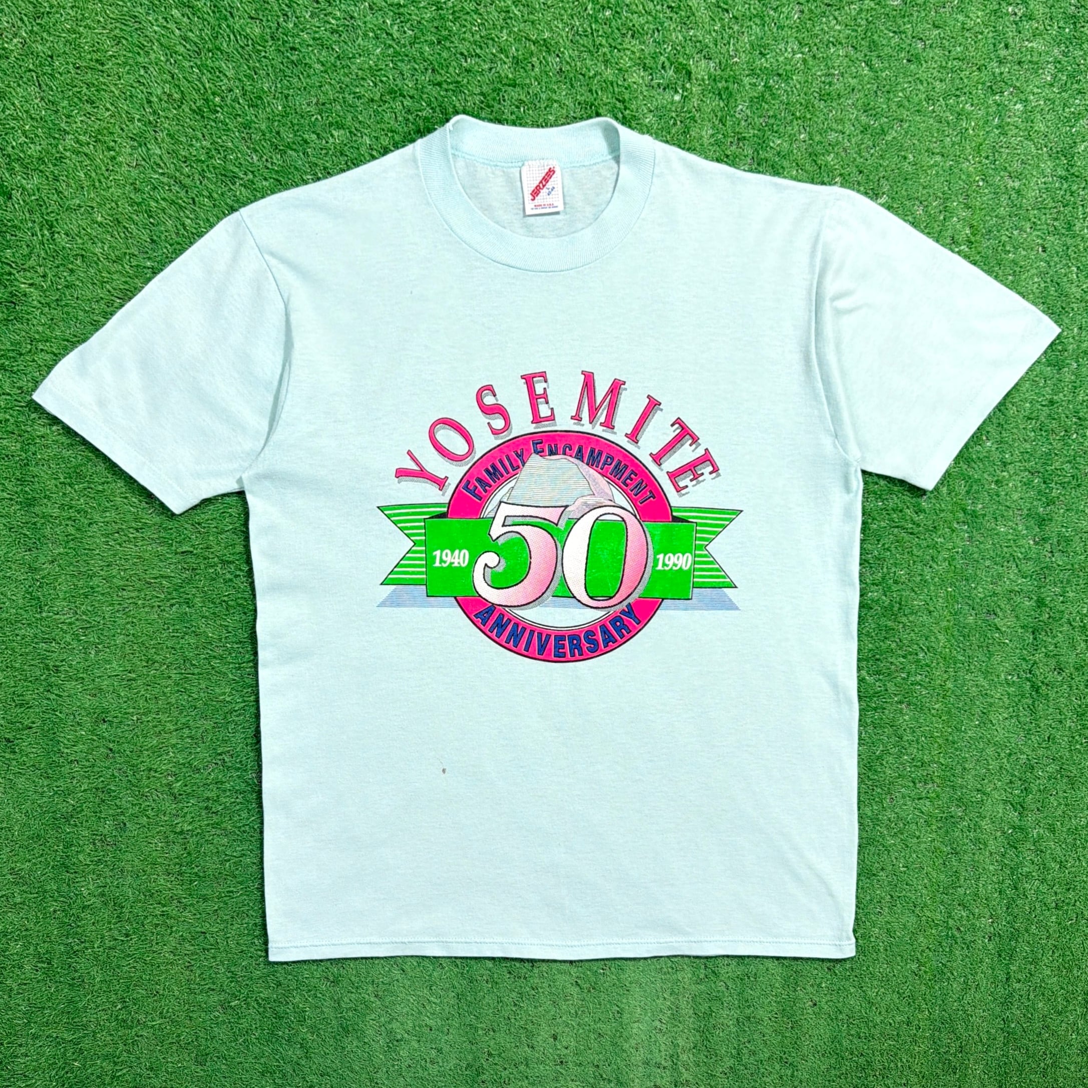アメリカ・カリフォルニア州にあるヨセミテ国立公園の「50周年記念」のアニバーサリーTシャツ。フロントには「YOSEMITE 50th ANNIVERSARY」と大きくプリントされており、記念アイテムらしい特別感のある1枚です。