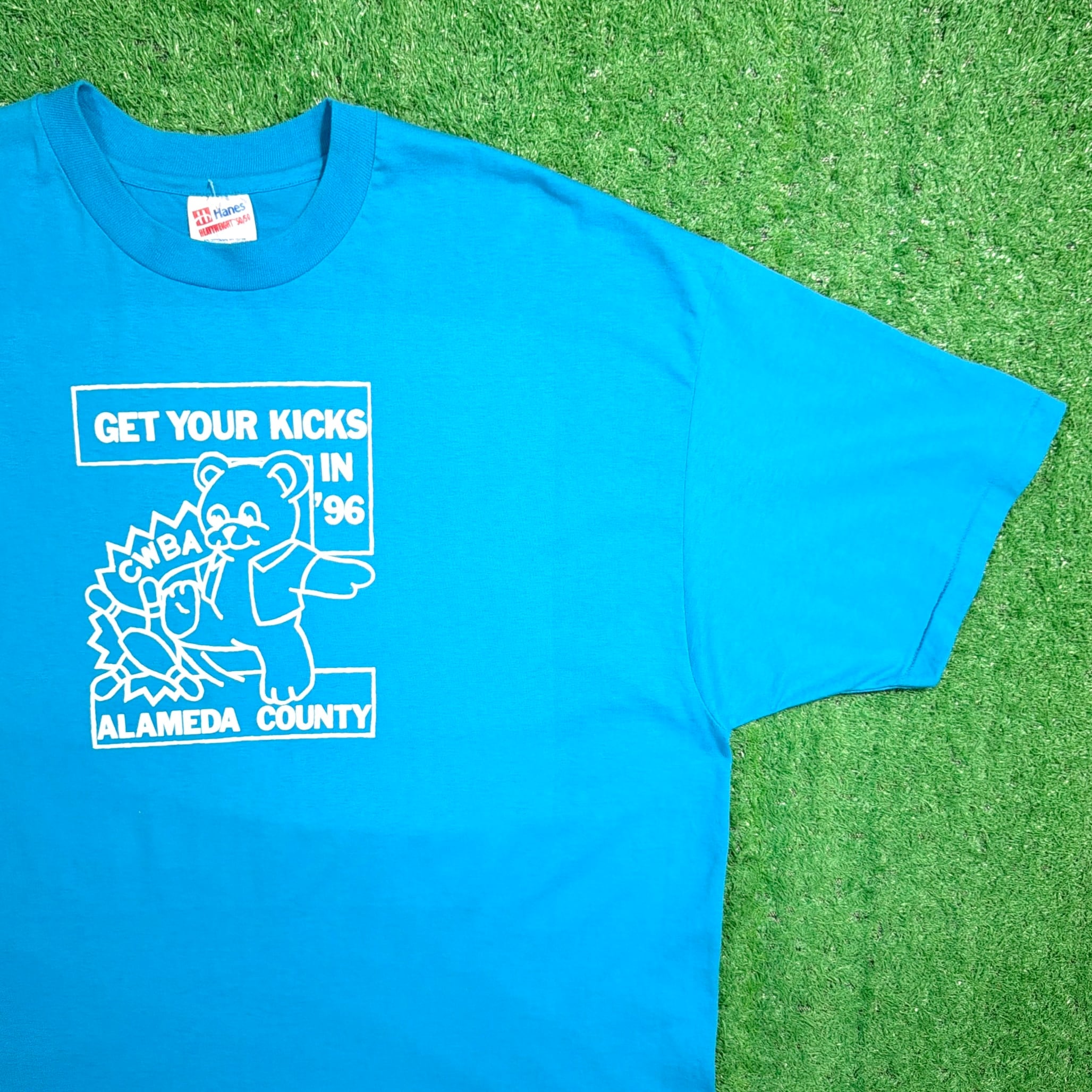 フロントには「GET YOUR KICKS IN ’96」のメッセージと、クマがボーリングのピンを蹴っているユニークなイラストがプリントされたデザイン。