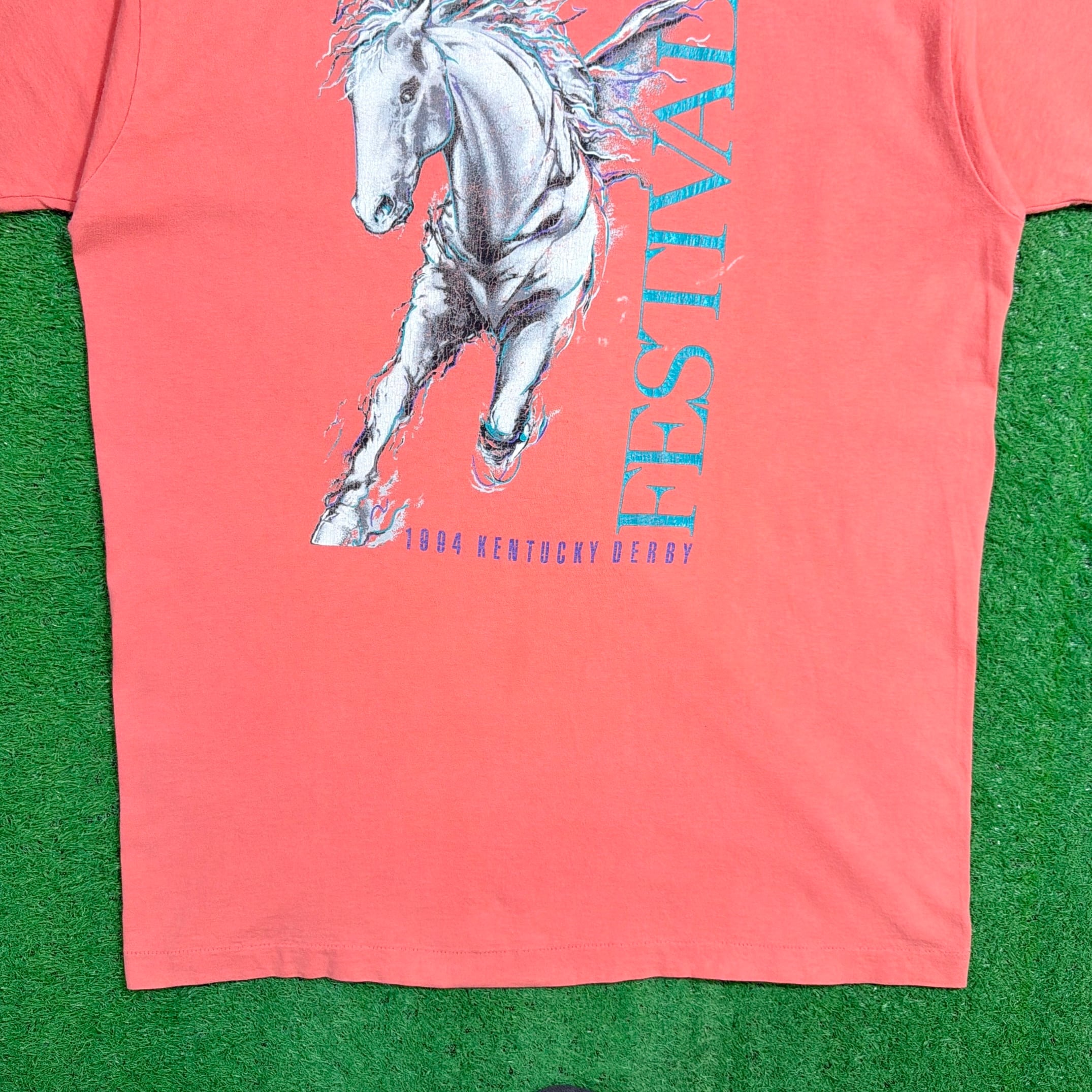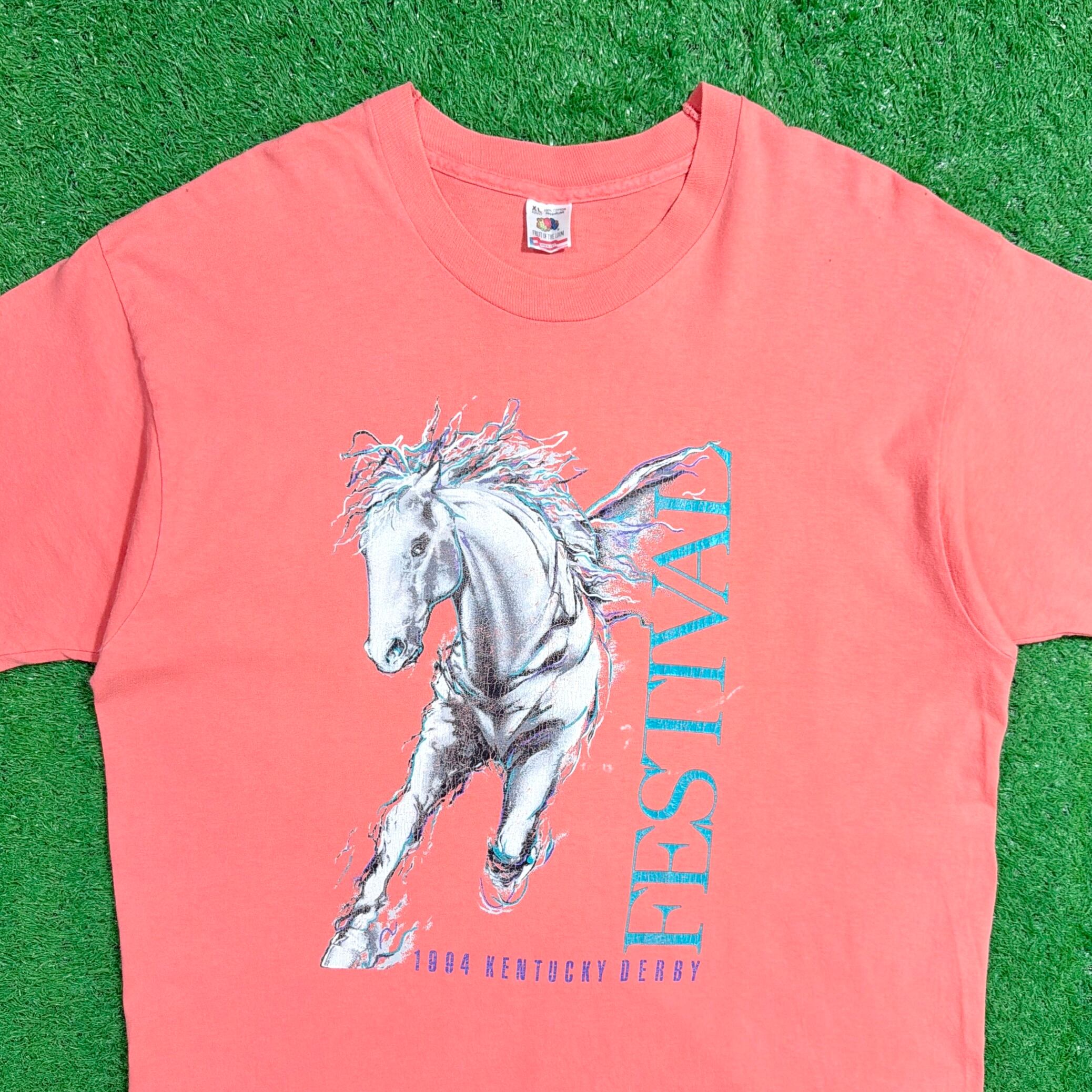 フロントには躍動感のある馬のイラストと「FESTIVAL」の文字がデザインされた印象的な一枚。立体感のあるグラフィックと縦に入るロゴ配置が特徴で、90年代らしいアート感のある仕上がりになっています。