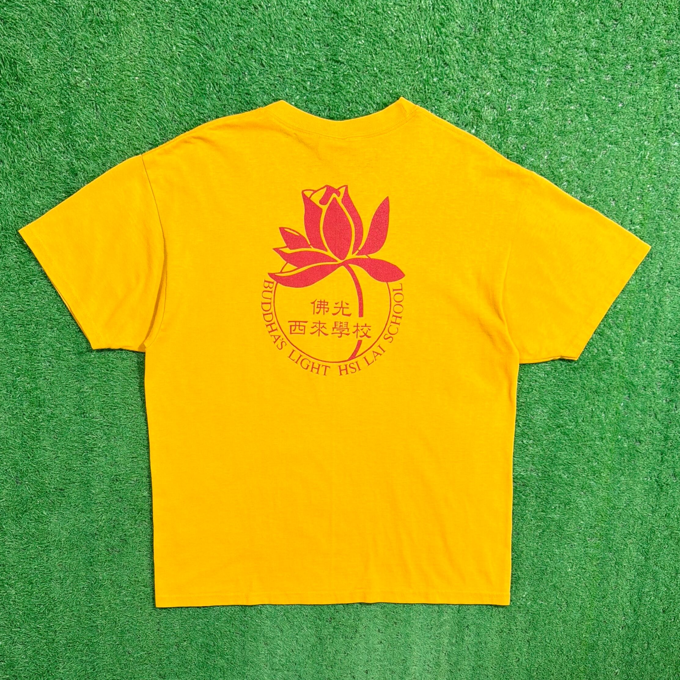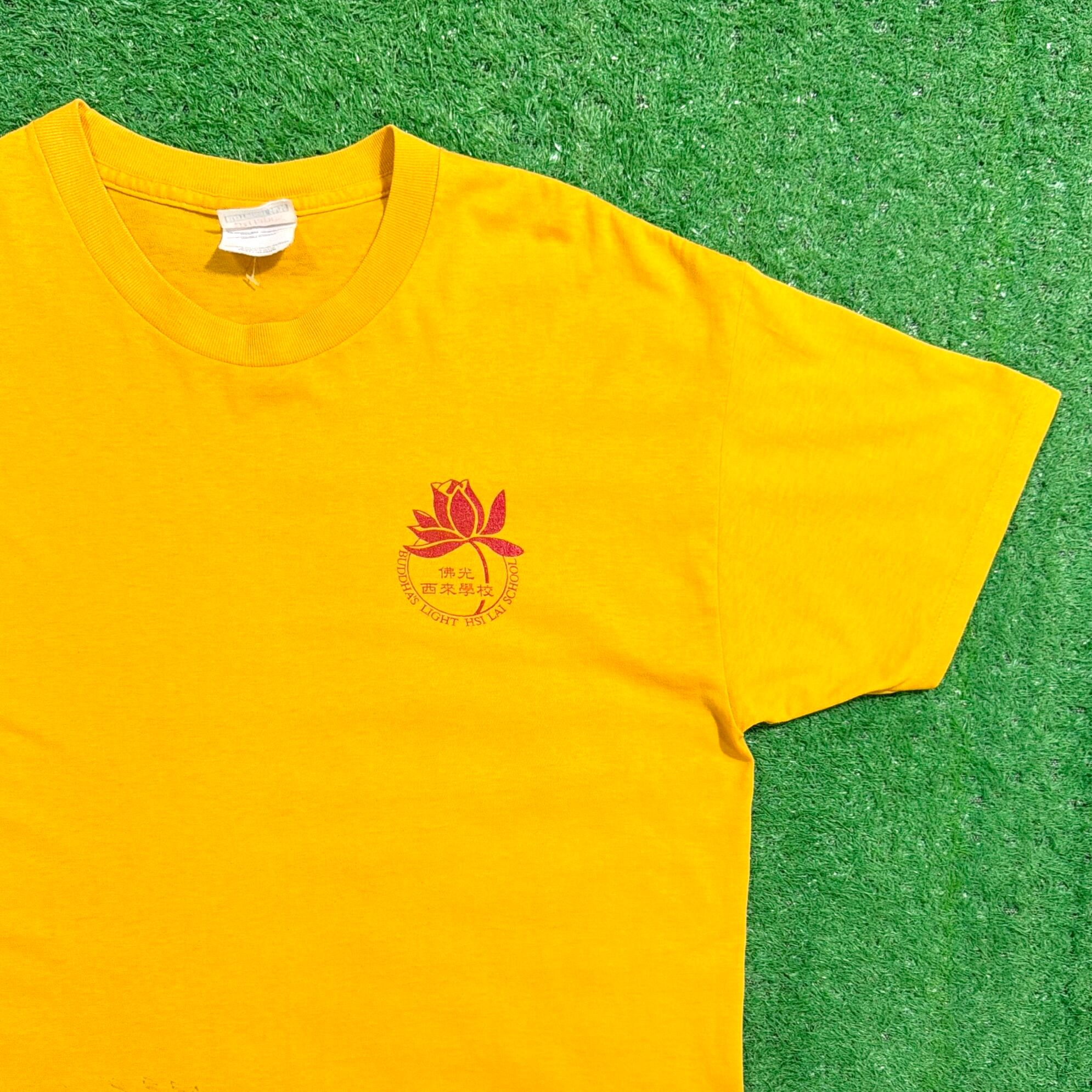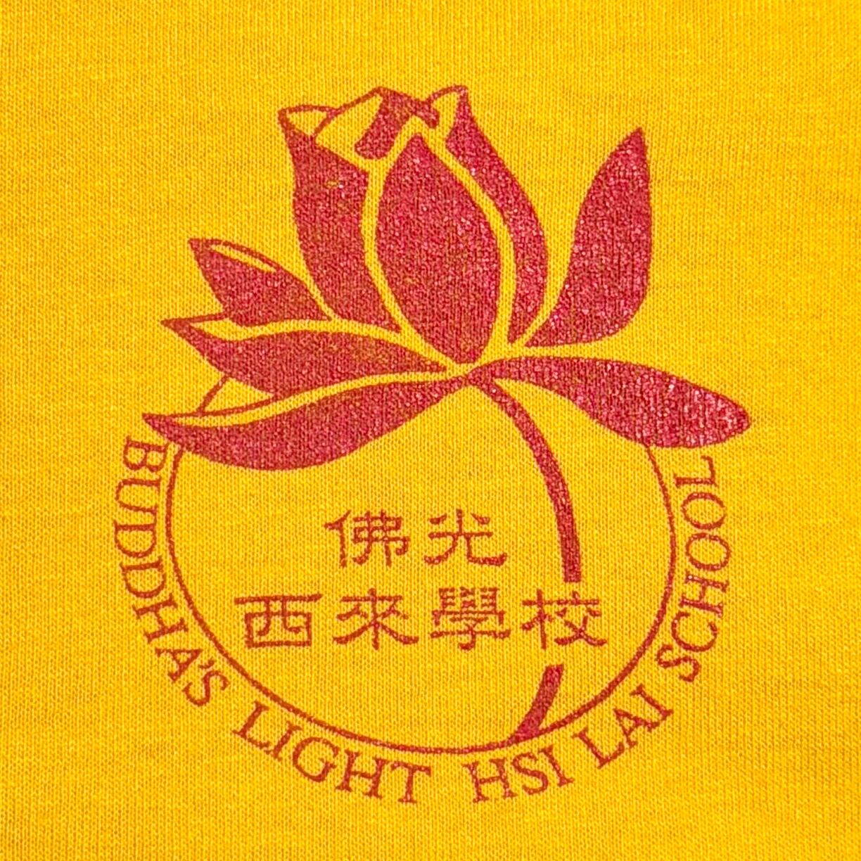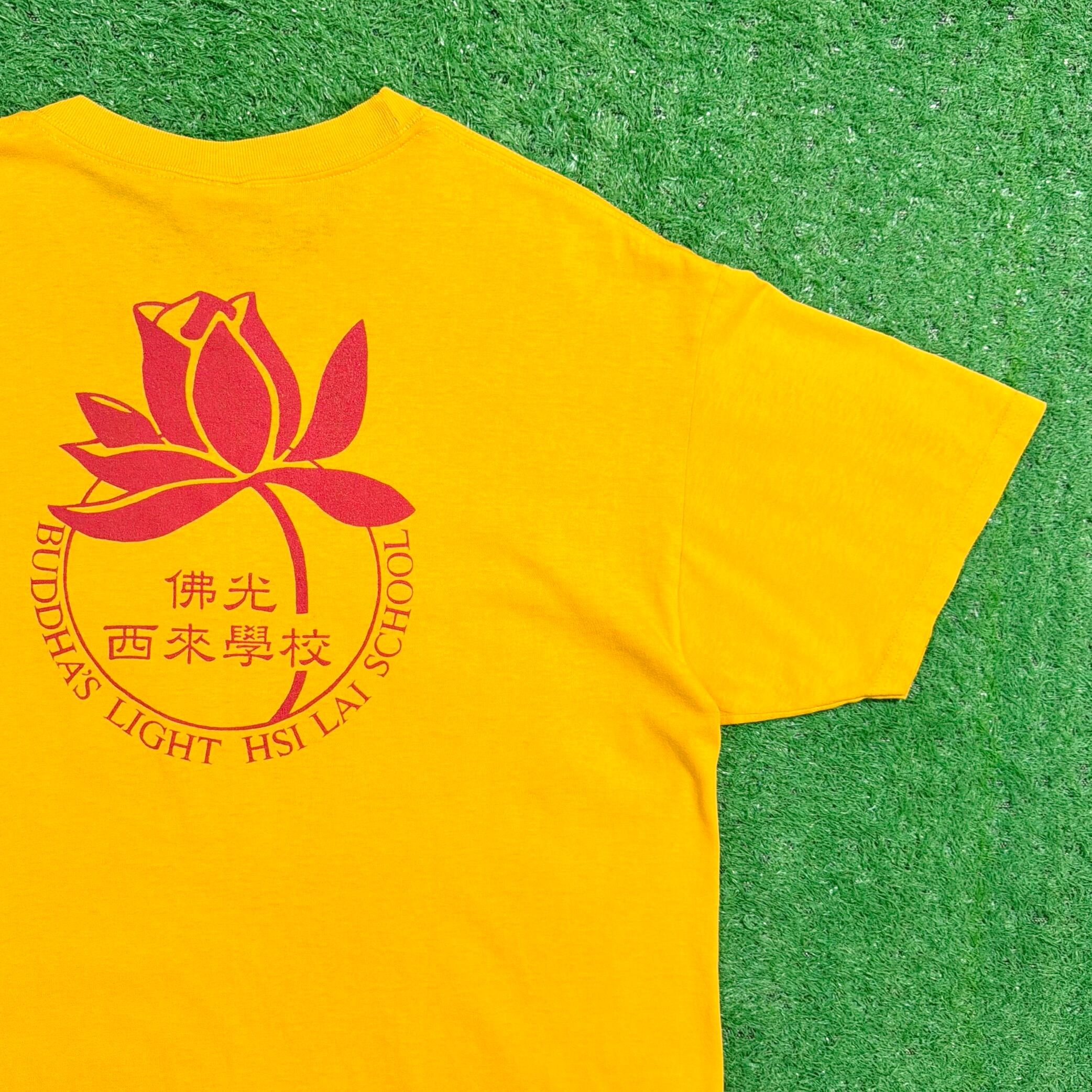 フロントとバックには蓮の花をモチーフにしたロゴがプリントされており、「BUDDHA'S LIGHT HSI LAI SCHOOL(西来学校)」の文字が入るデザイン。アメリカにある仏教系教育機関のスクールTシャツと考えられる一枚です。