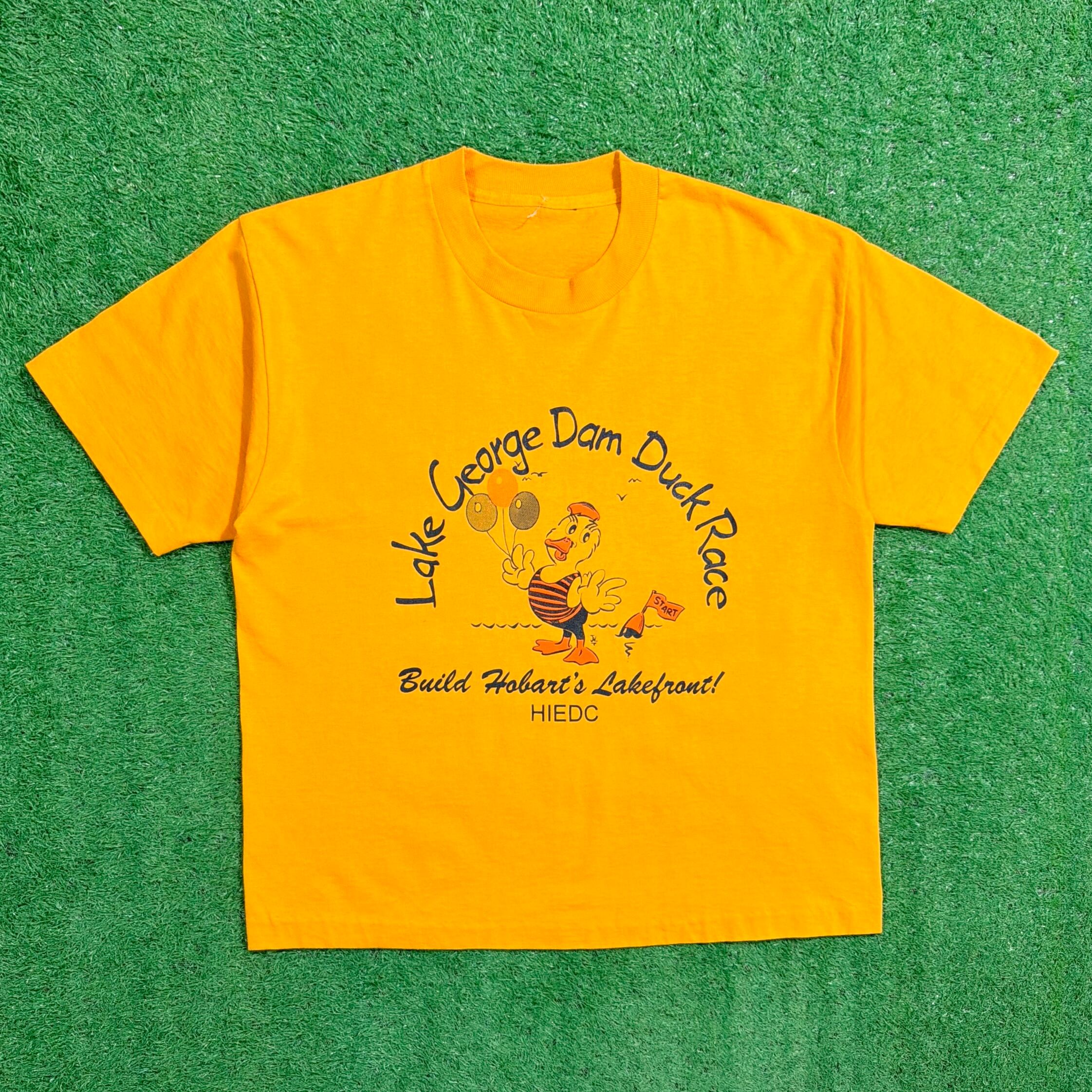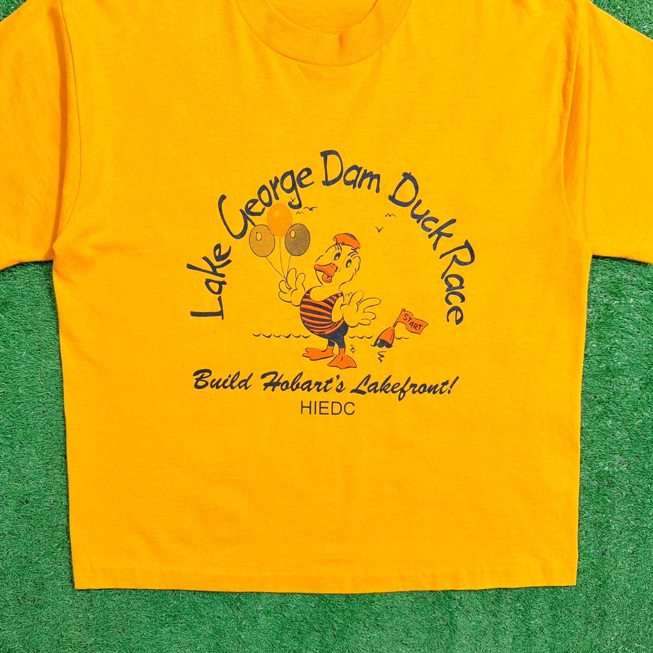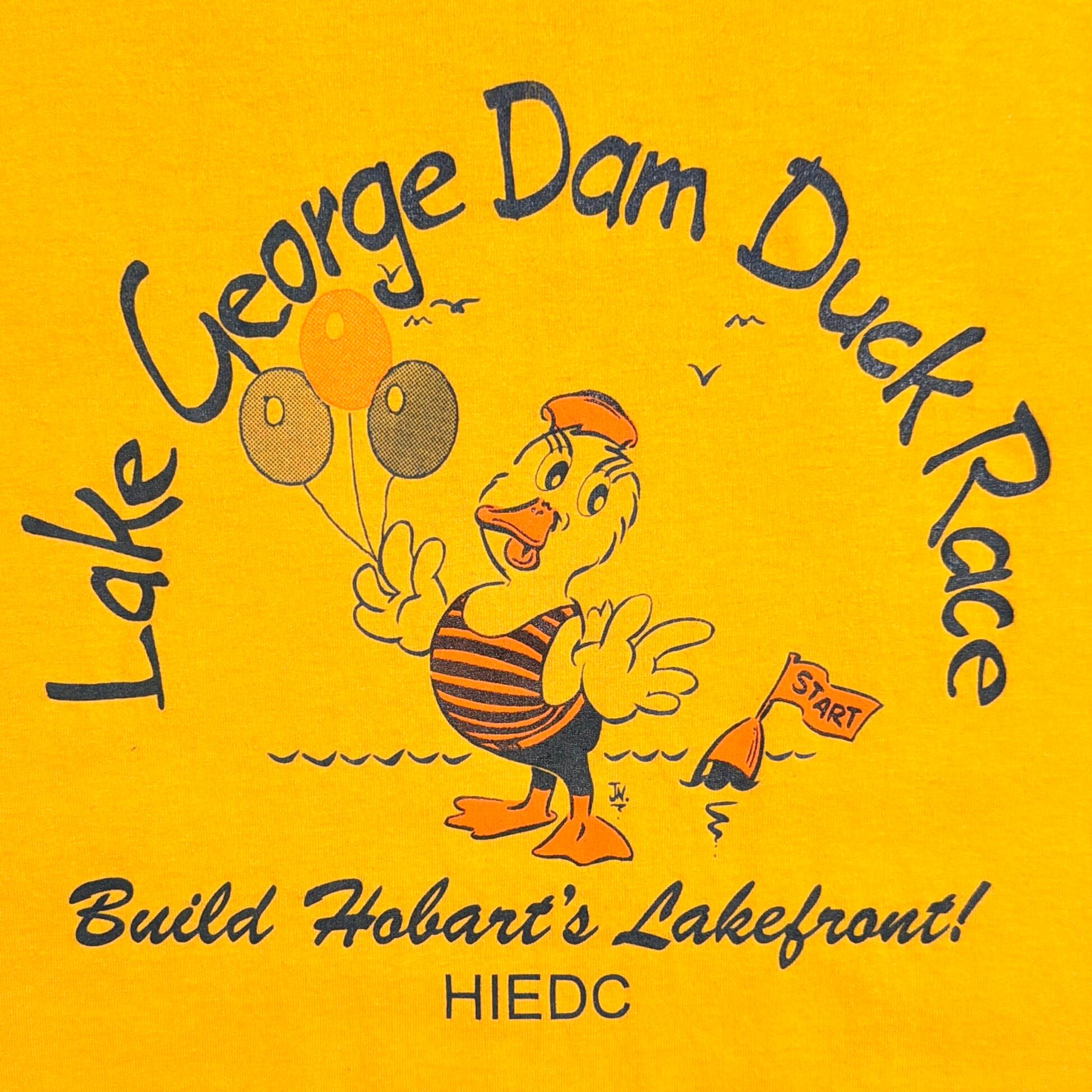 フロントには「Lake George Dam Duck Race」のプリントと、ユニークなアヒルのキャラクターが描かれたポップなデザイン。遊び心のあるイラストと、当時らしいゆるいタッチが魅力の一枚です。