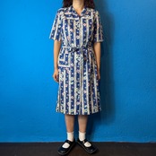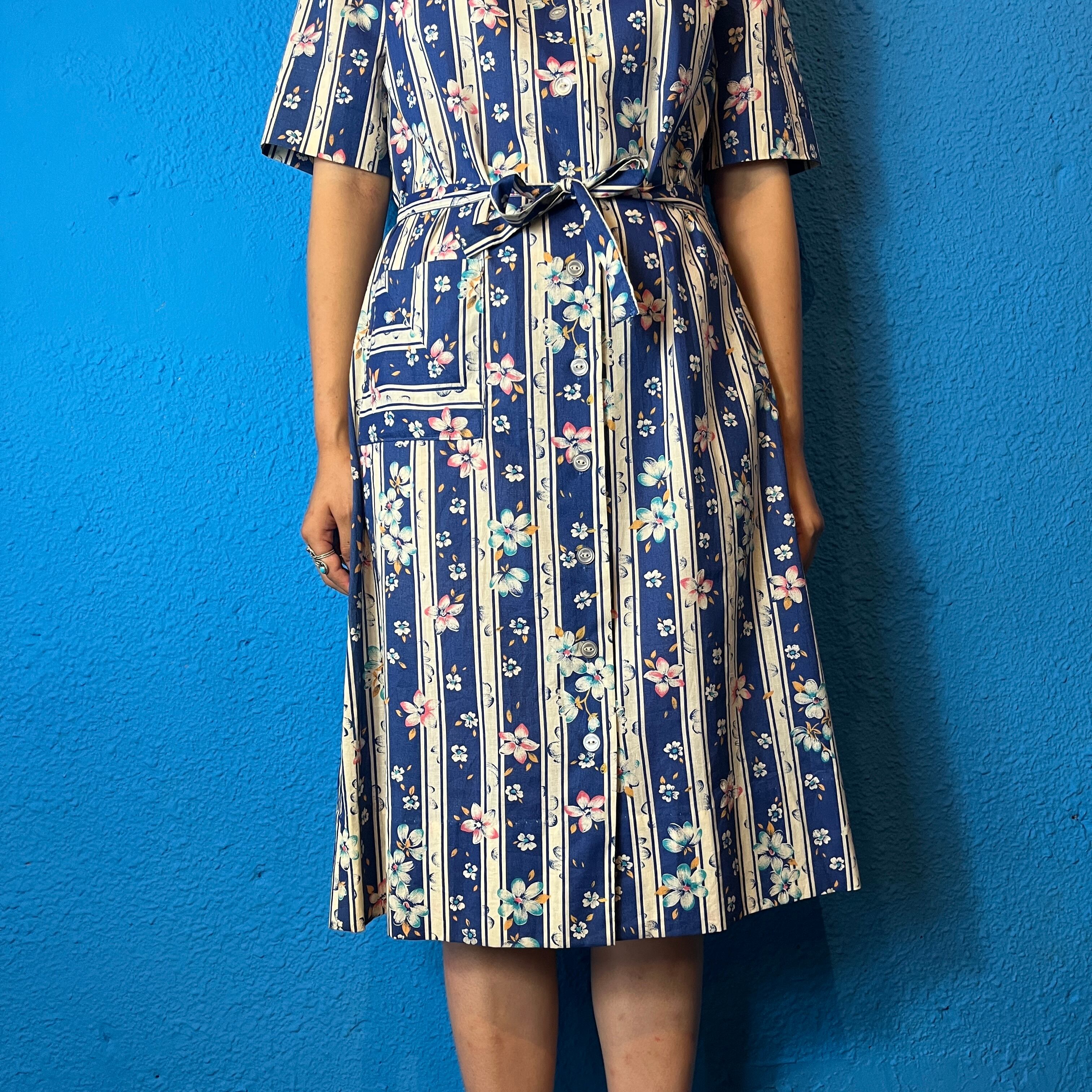 テキスタイルが涼しげな60〜70年代の開襟ワンピースです。ブルーストライプに花が散りばめらていてとっても可愛いです。ウエスト部分のリボンを外して、ウエストマークなしでさらっと着てもまた良いと思います。