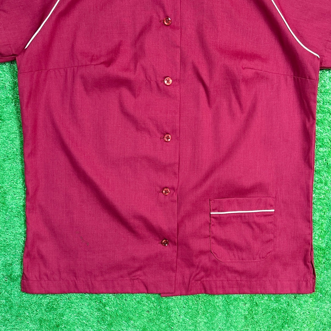 鮮やかなレッドカラーにホワイトのパイピングが映えるデザインで、スポーティーかつクラシックな雰囲気。ラグランスリーブ仕様で肩まわりに動きやすさがあり、当時のユニフォームらしいディテールが魅力的です。胸ポケットには同色のライン入りで、シンプルながらアクセントの効いた一枚。