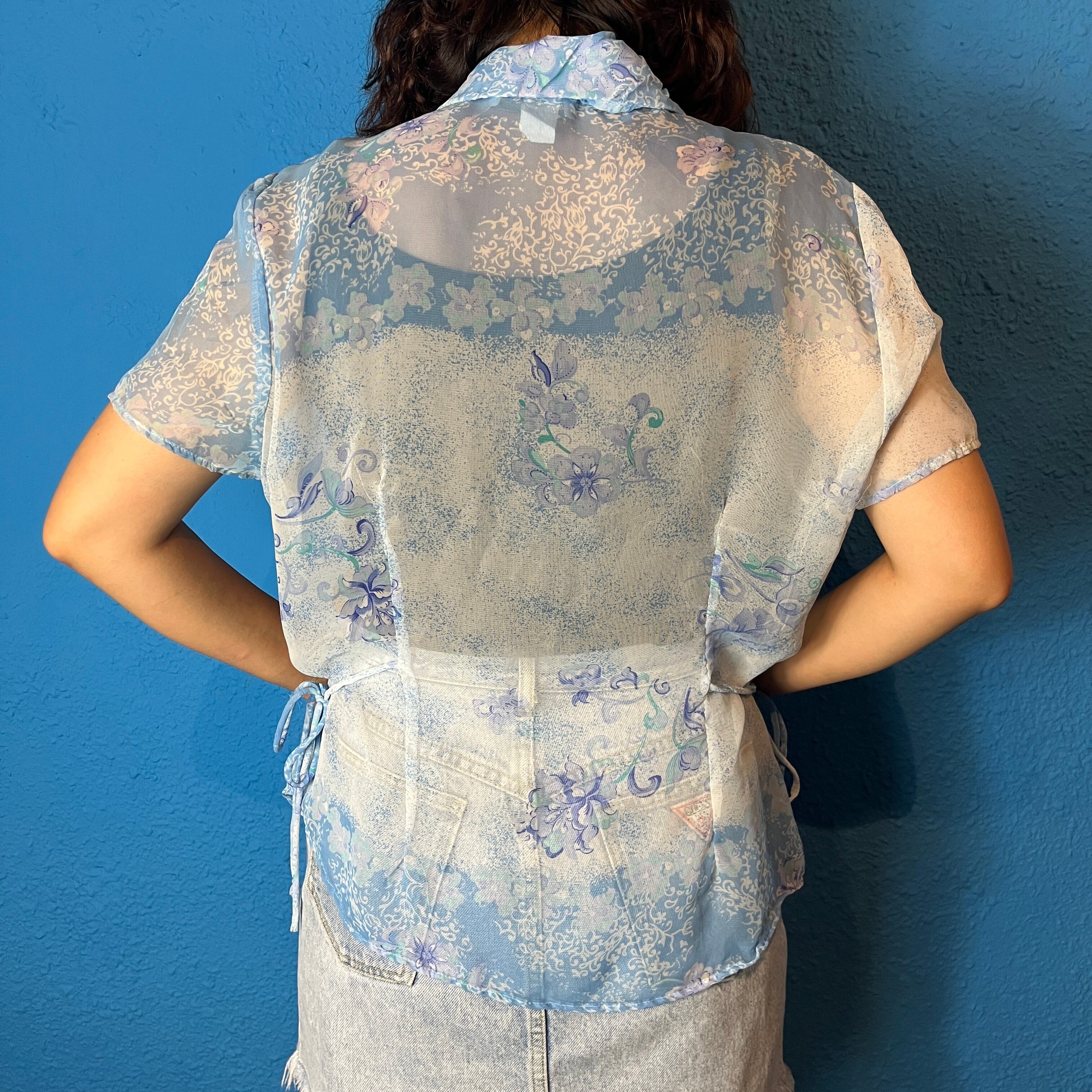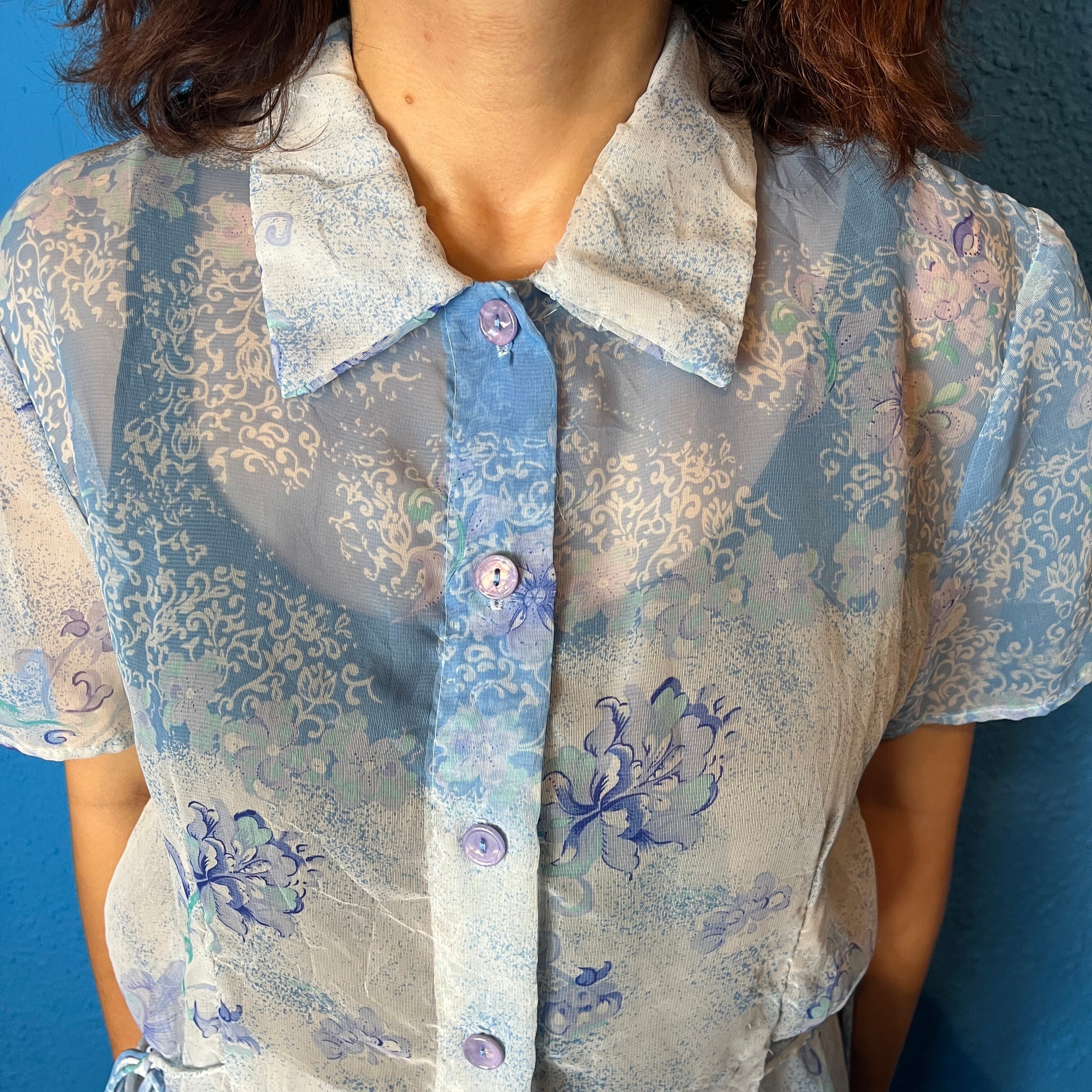 涼しげなシースルーの花柄が魅力的な80〜90年代のシャツです。サイドのリボンも可愛く、シャツに縦線が入っているのでスタイルアップにも繋がります◎
