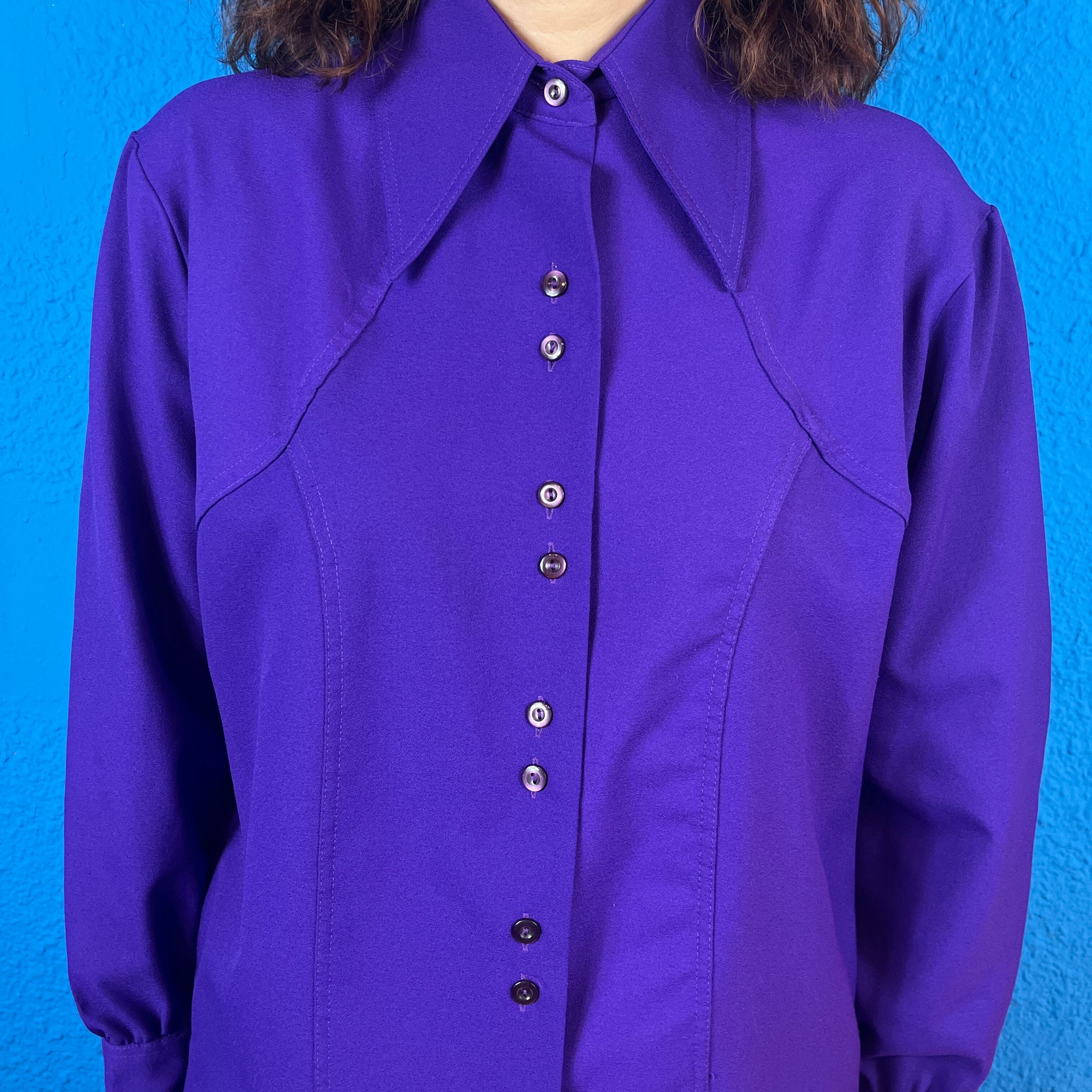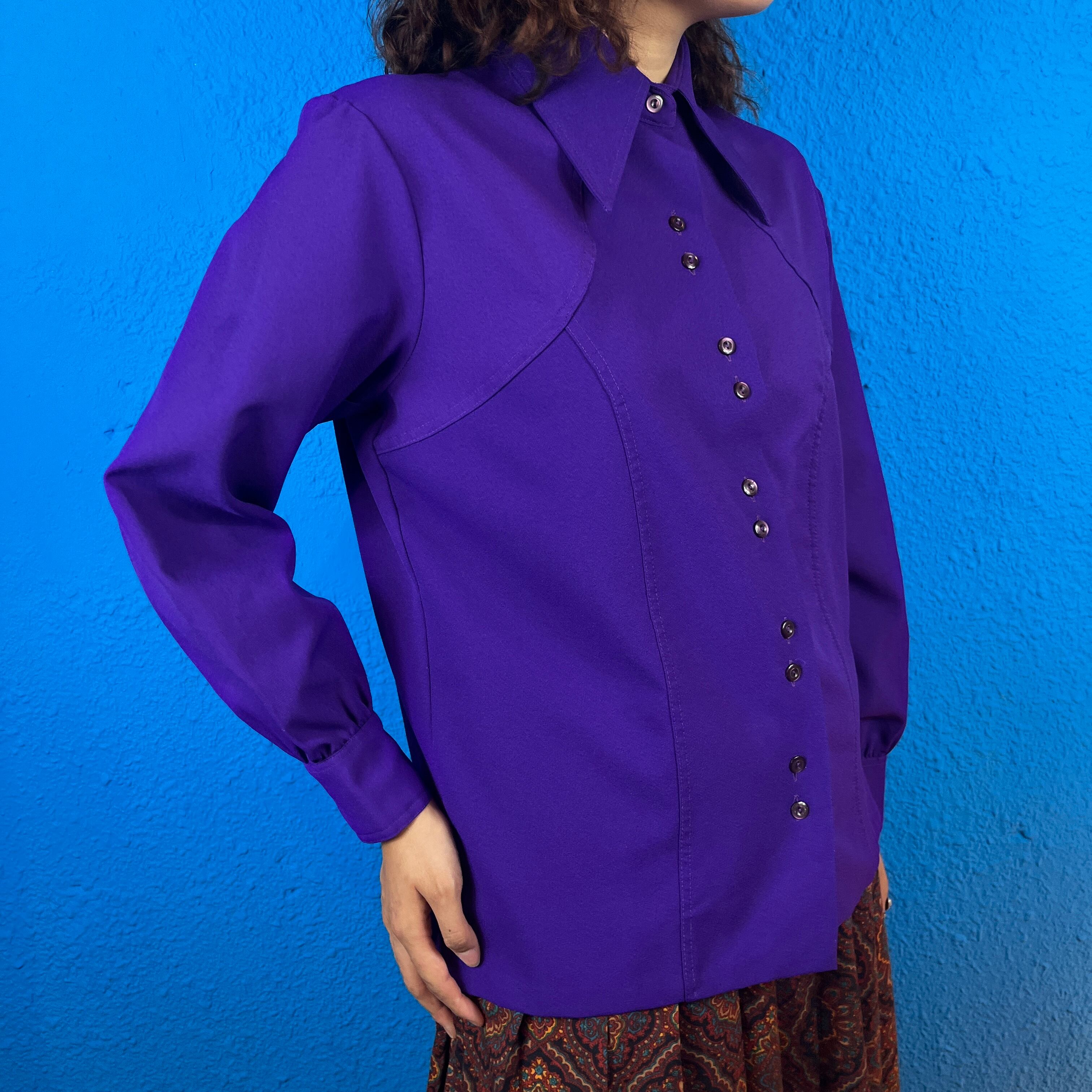 70年代の"K-mart" 鮮やかなパープルカラーが魅力的なシャツです。70年代らしさがある襟にボディのデザインもとっても最高な1枚。ボタンも2連ずつになっているのが可愛いです。ワンピースやベストなどのレイヤードにもピッタリの1枚。お呼ばれにも合わせやすいアイテムだと思います。