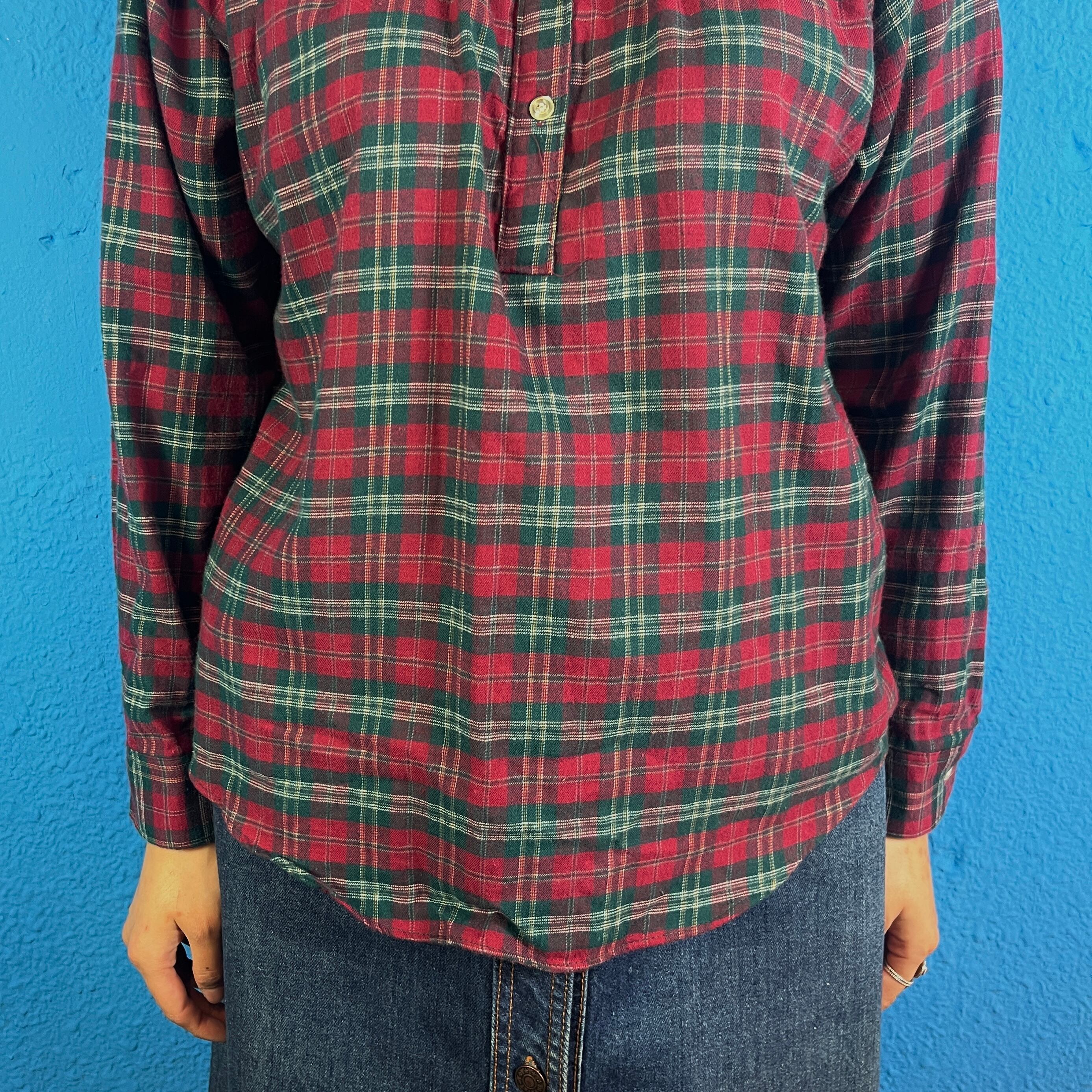 【Lady's】70s Sears Red and Green Checked Collarless Blouse / Vintage ヴィンテージ 古着 シアーズ 赤 チェック カントリー ノーカラー シャツ ブラウス