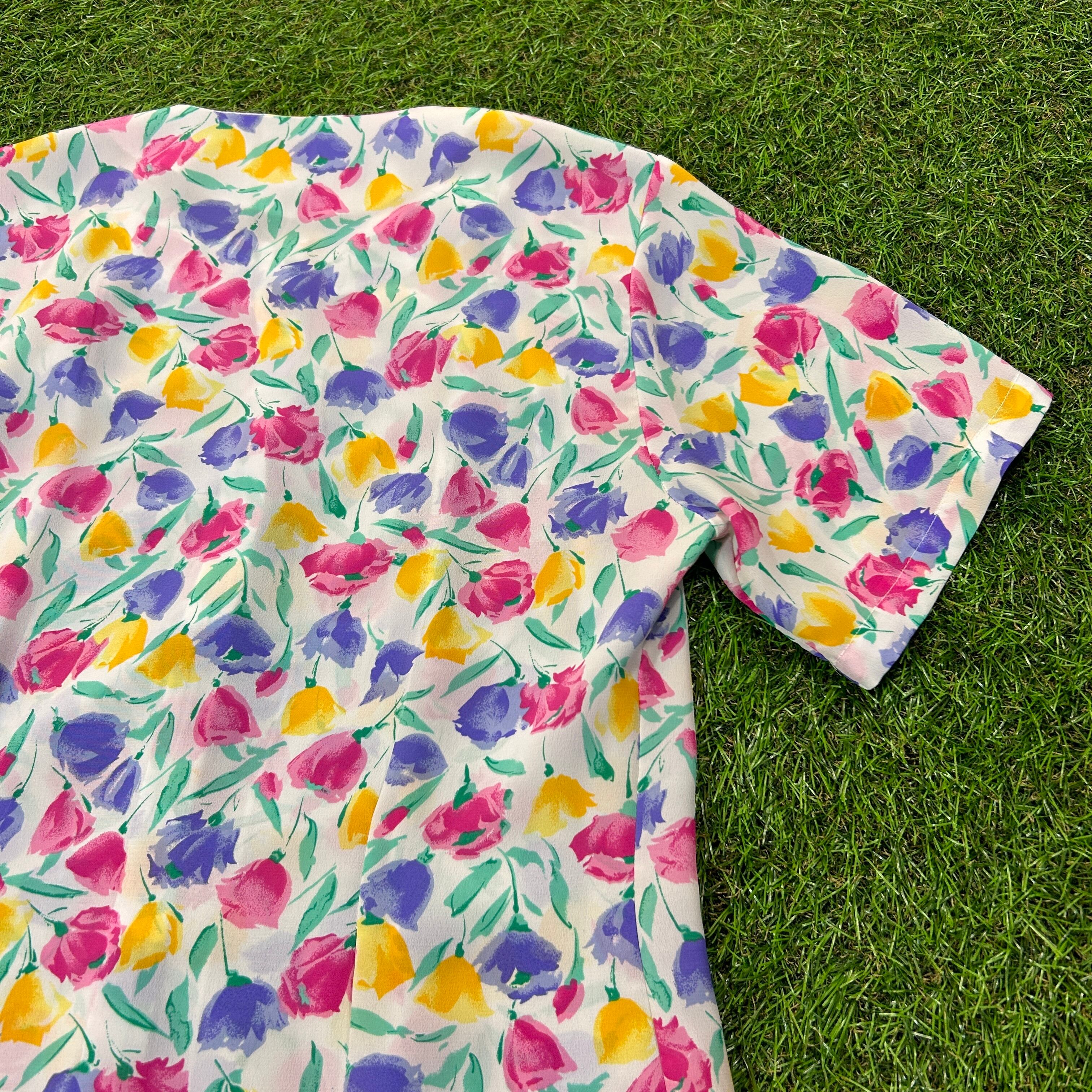 カラフルだけど大人な花柄がとても魅力的な80年代のブラウスです。
