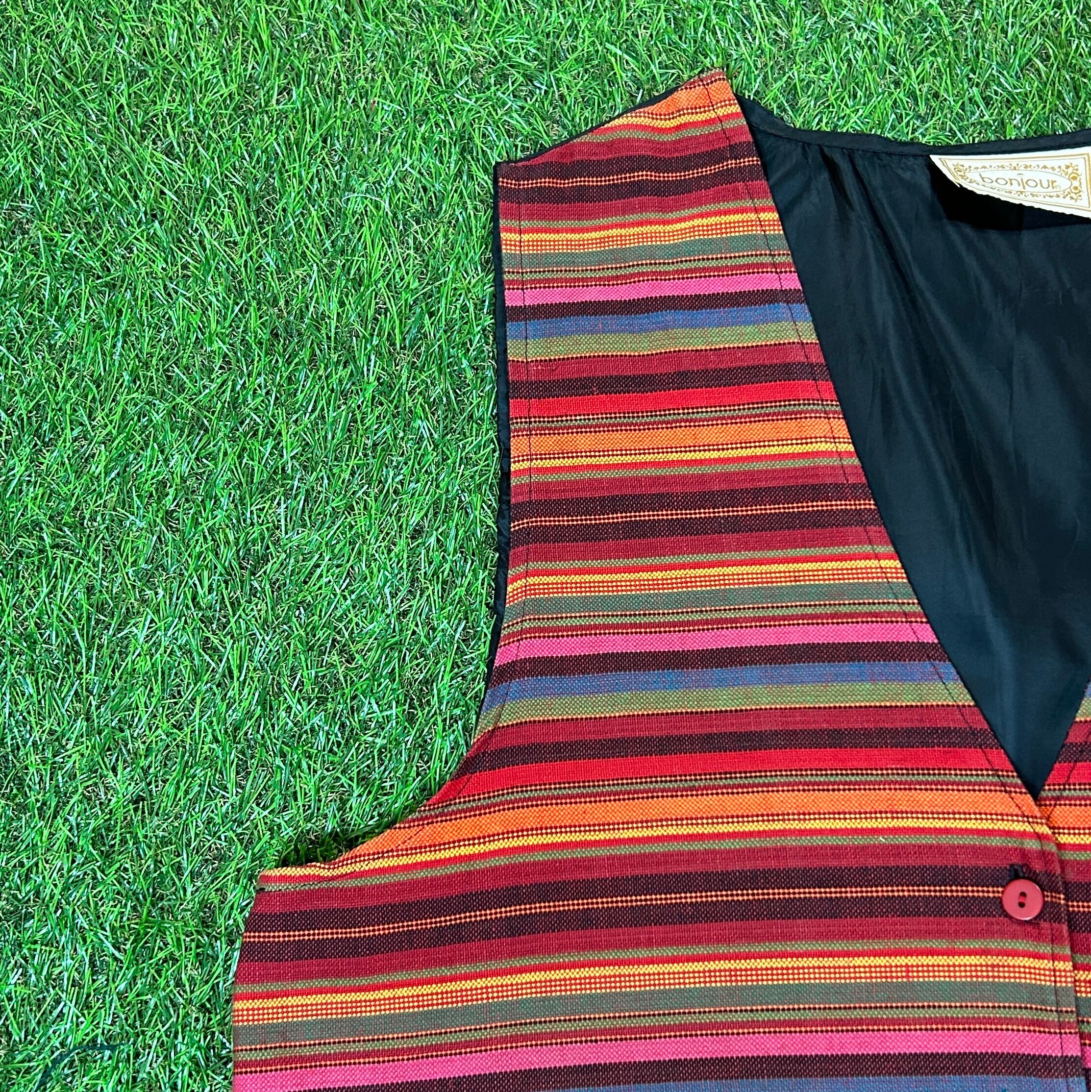 鮮やかな赤・オレンジ・パープルなどの多色ストライプが並び、メキシカンやネイティブスタイルを思わせる存在感あるデザイン。フロントはシンプルなボタン留め仕様で、裏地はブラックで落ち着いた仕上がりになっています。コーディネートのアクセントにぴったりな一着です。ボタンはレディース合わせですが大きなサイズなのでメンズの方でも着用いただけます。