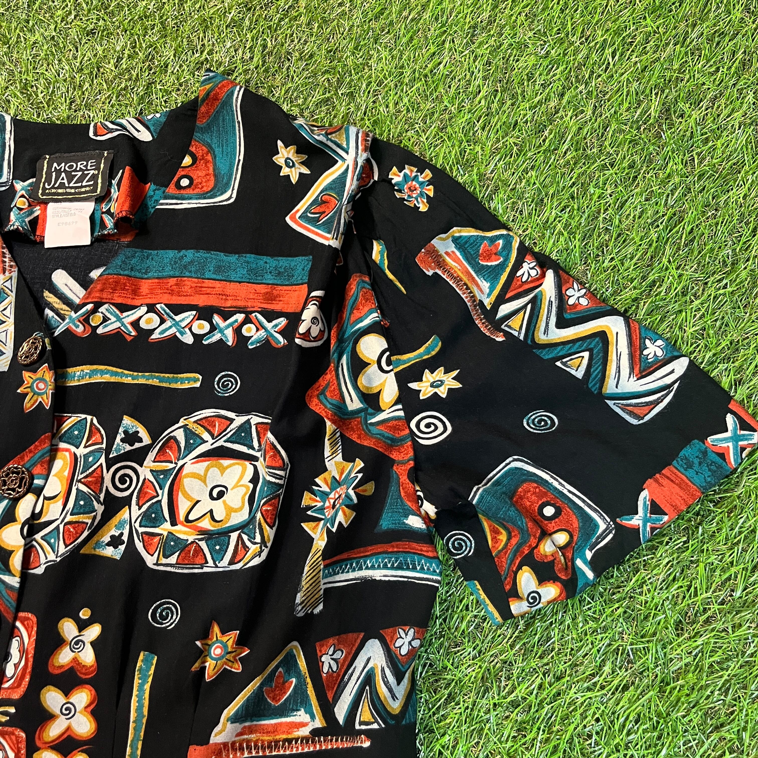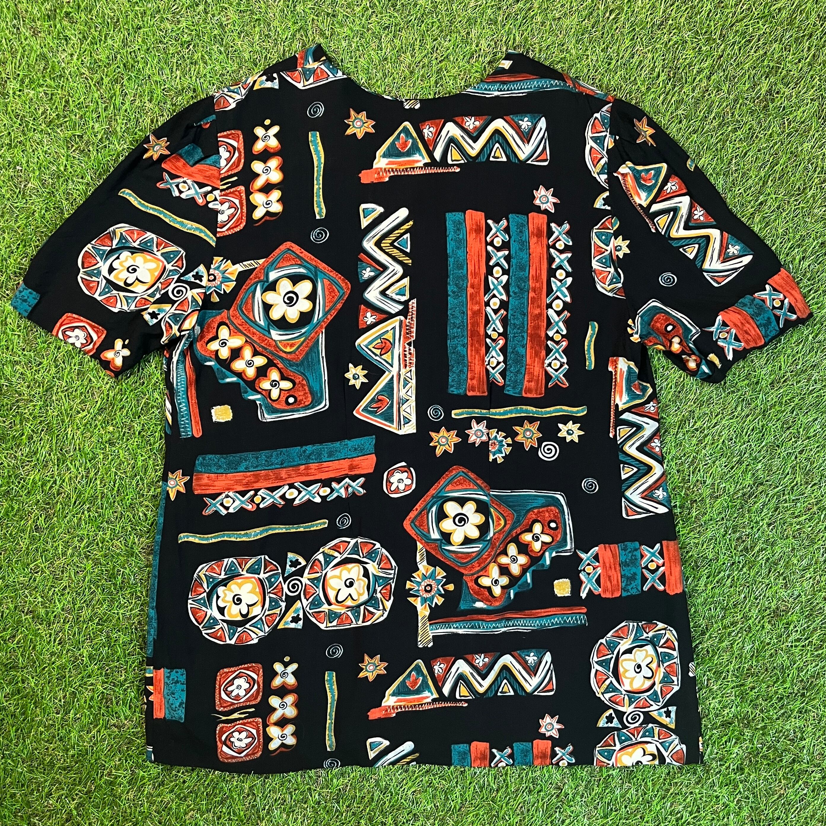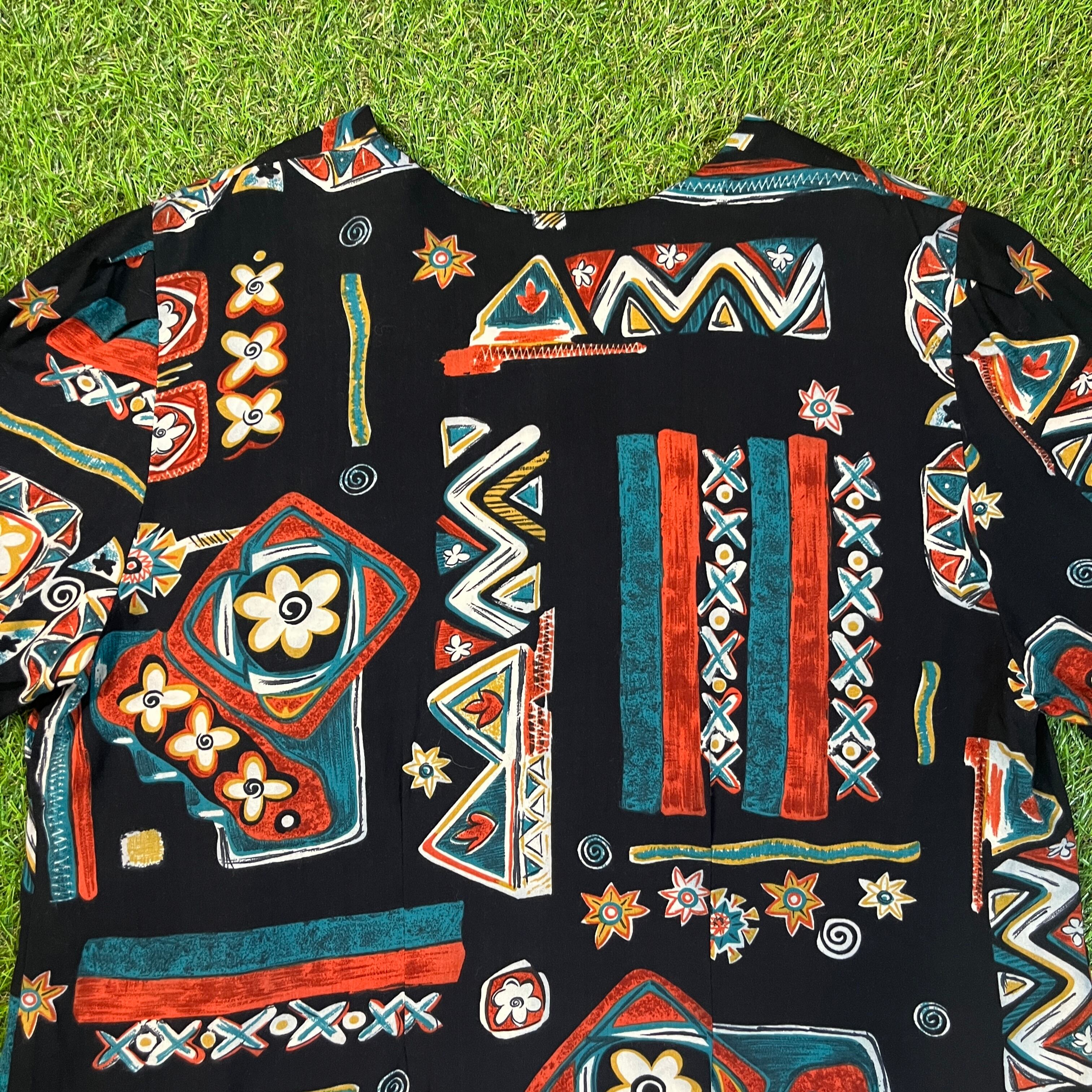 【Lady's】 80s エスニック 花柄 レーヨン ブラウス / Made In USA ヴィンテージ vintage アメリカ製 黒 半袖 シャツ 総柄