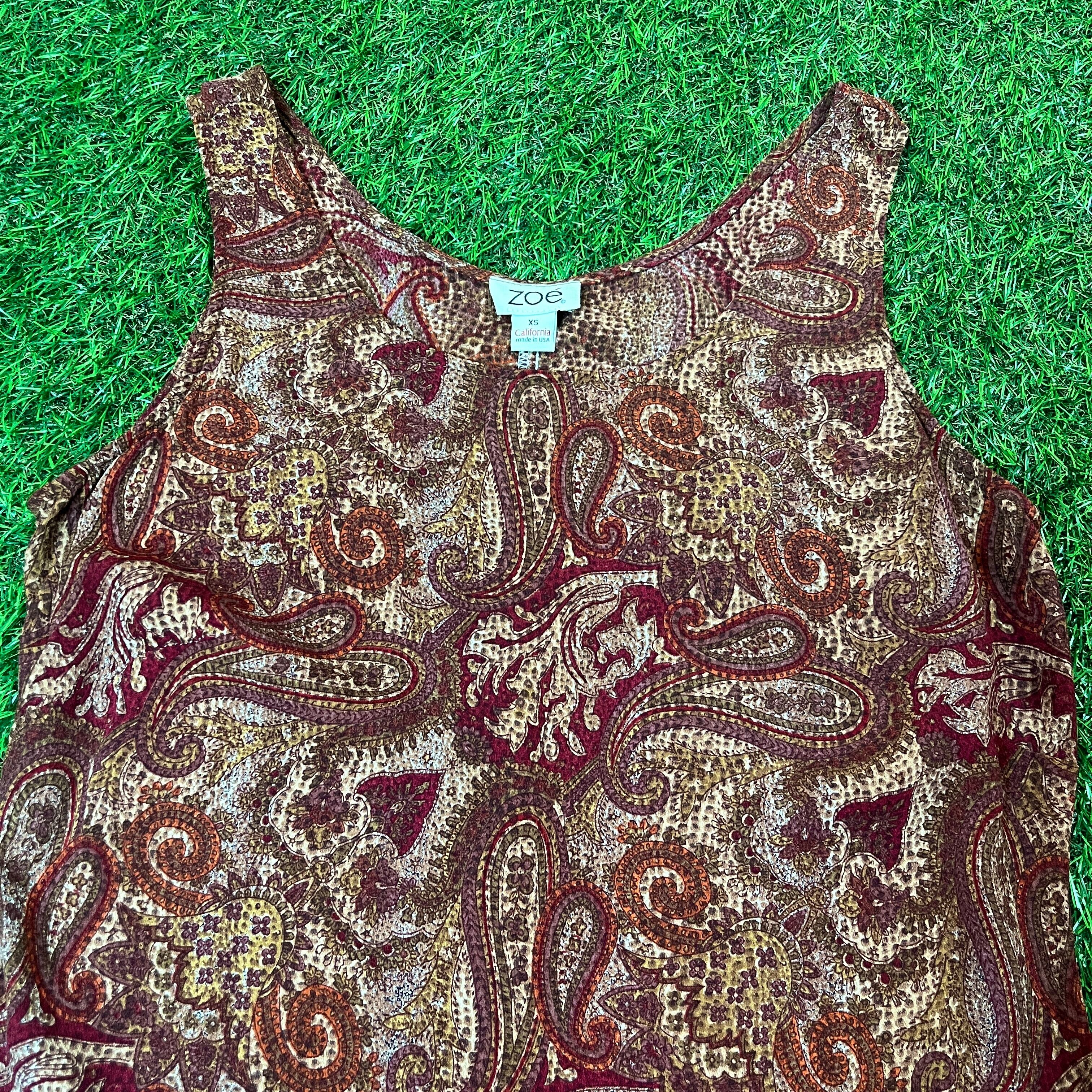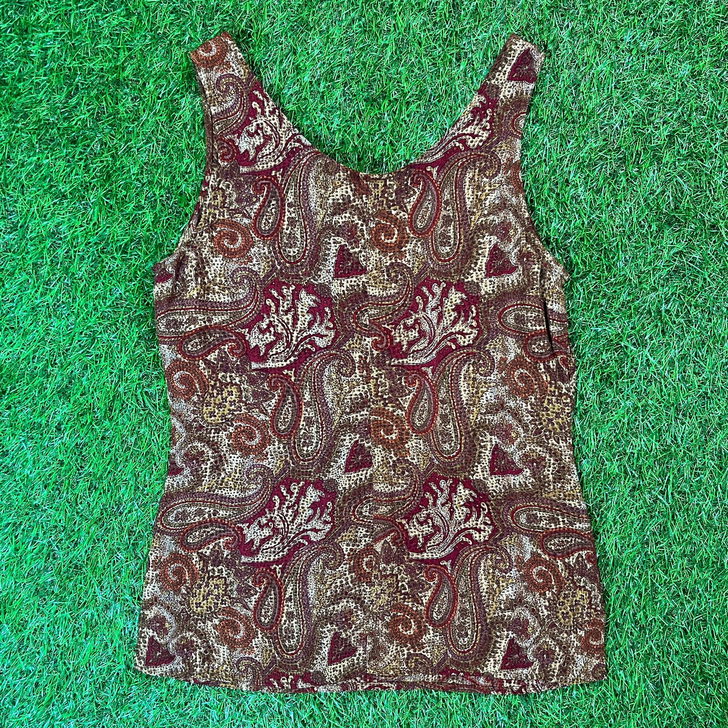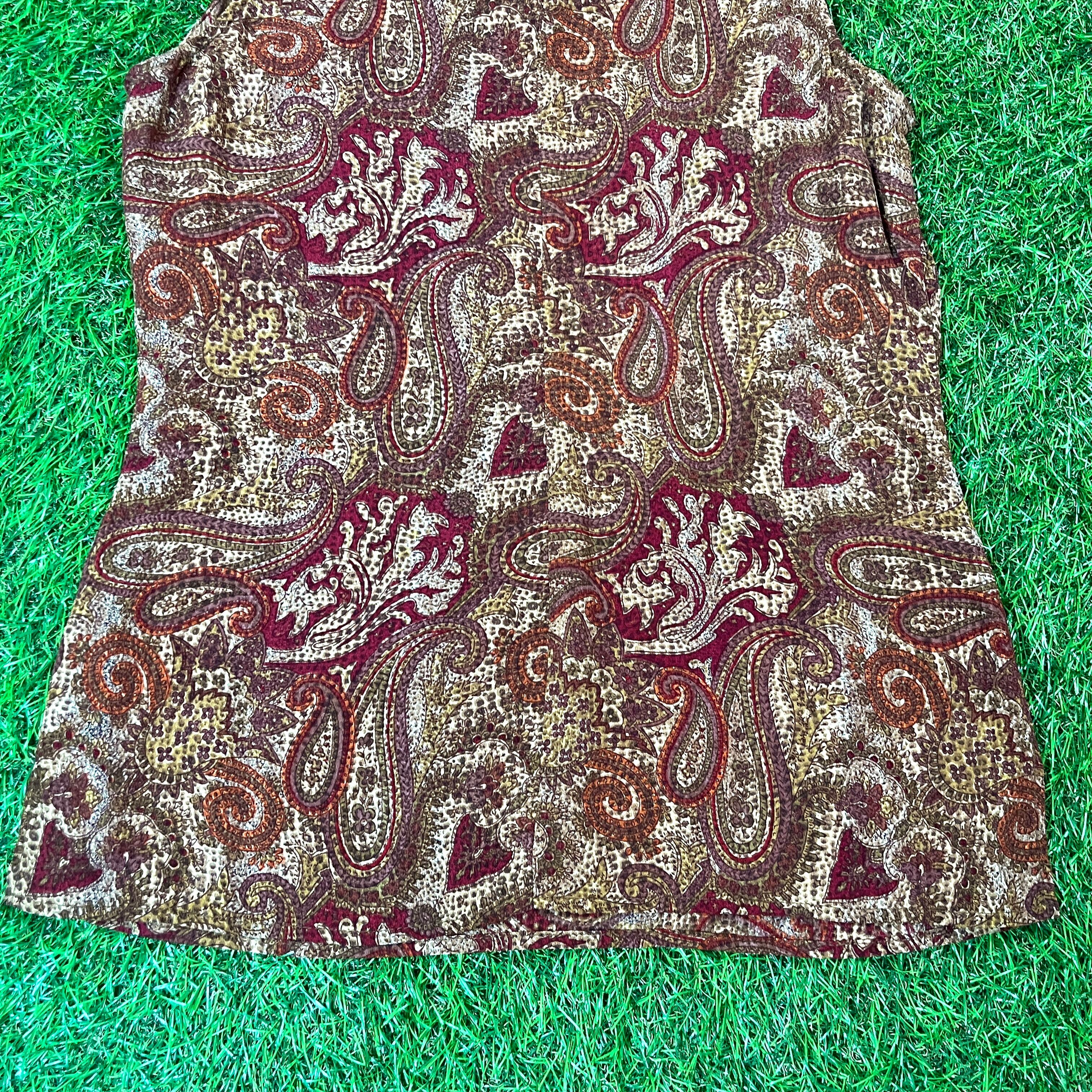 【Lady's】 90s〜 ペイズリー レーヨン 総柄 タンクトップ / Made In USA 古着 ボルドー 赤 ノースリーブ