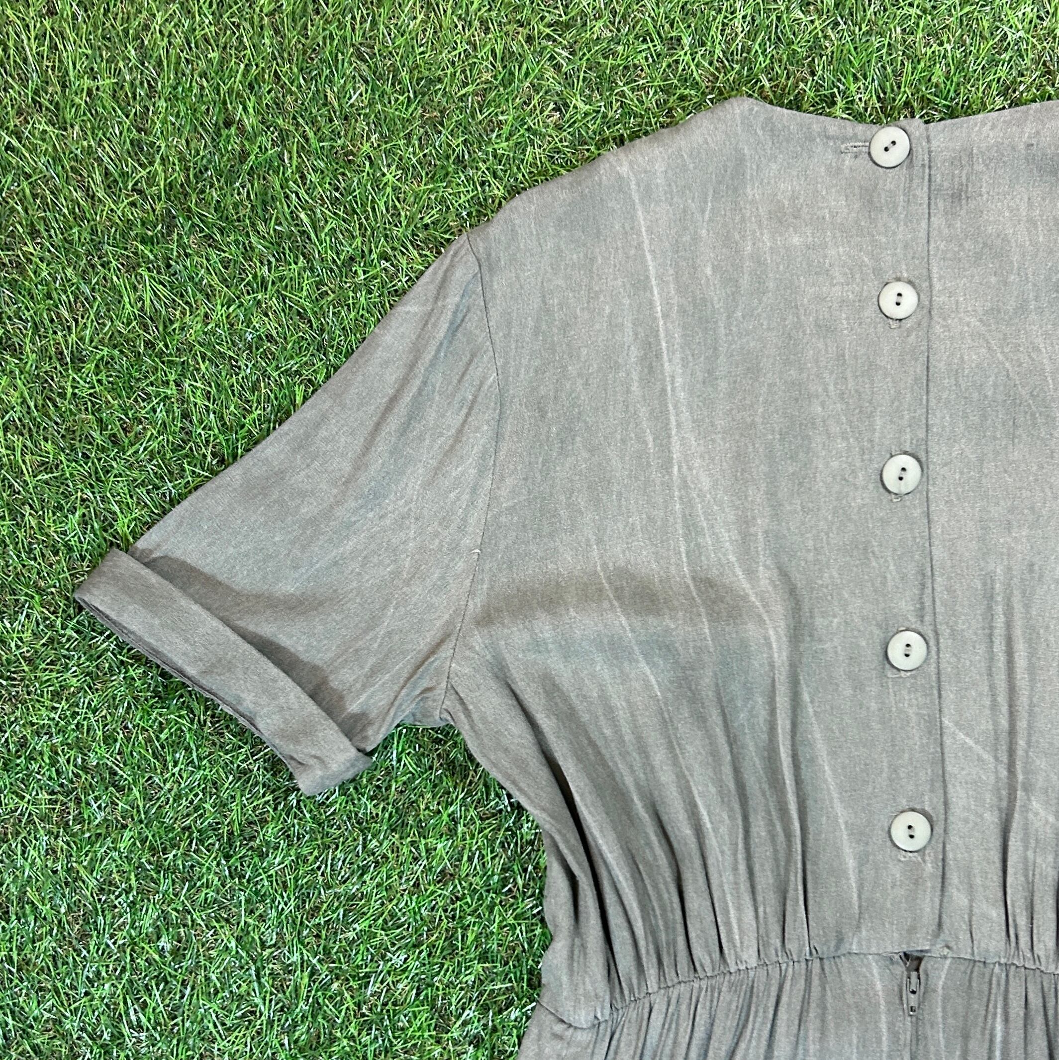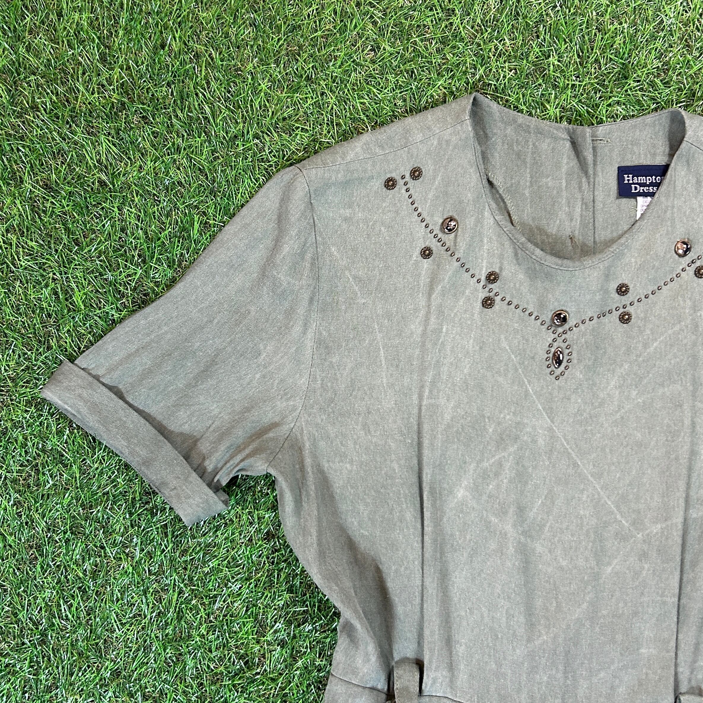 くすみグリーンカラーにフロントのビジューがとても上品な90年代のワンピースです。