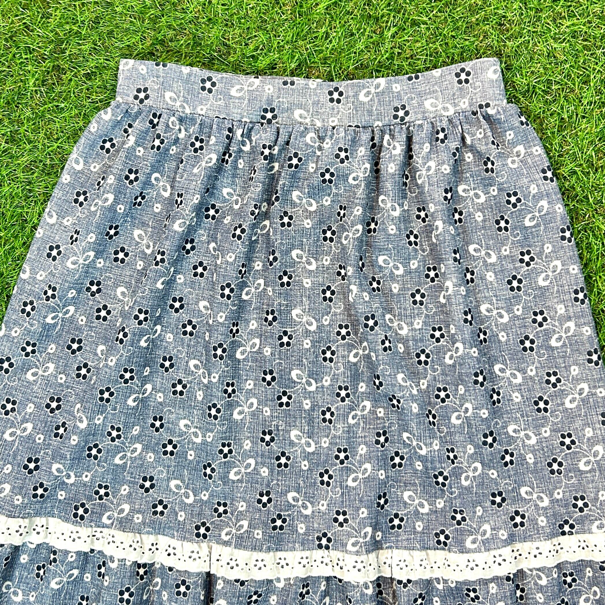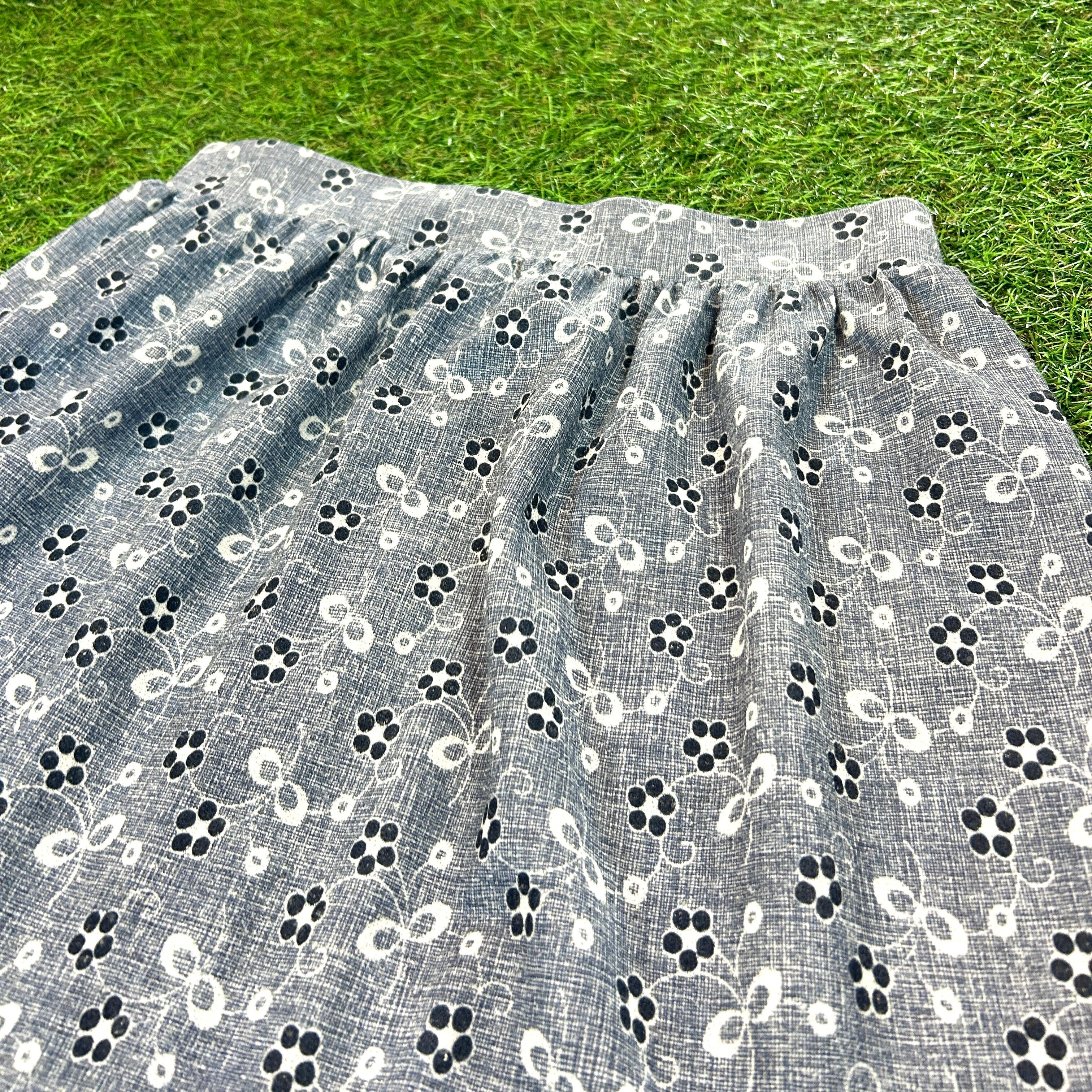 淡めのブルーの花柄にレースデザインがとってもチャーミングなスカートです。
