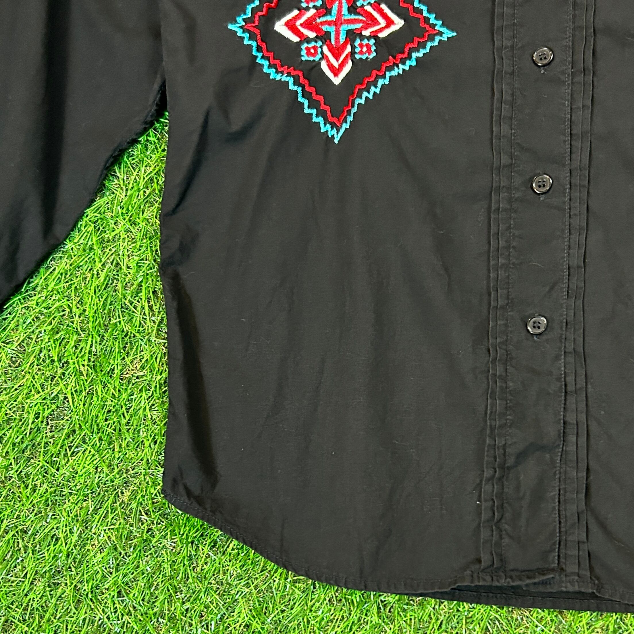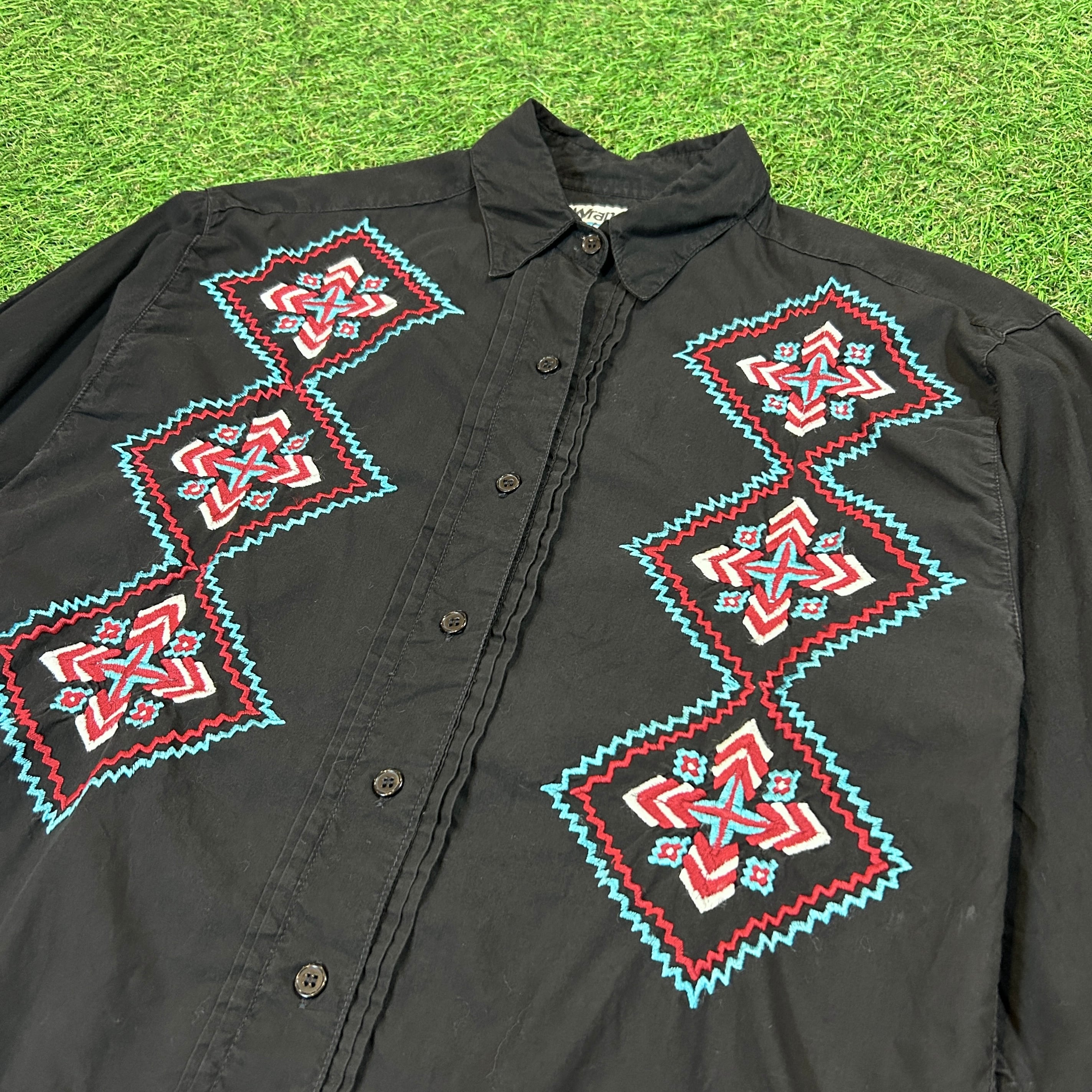 【Lady's】 90s Wrangler ネイティブ柄 刺繍 シャツ / 90年代 長袖 古着 オルテガ ラングラー 黒 レディース ブラック ウエスタン ウェスタン