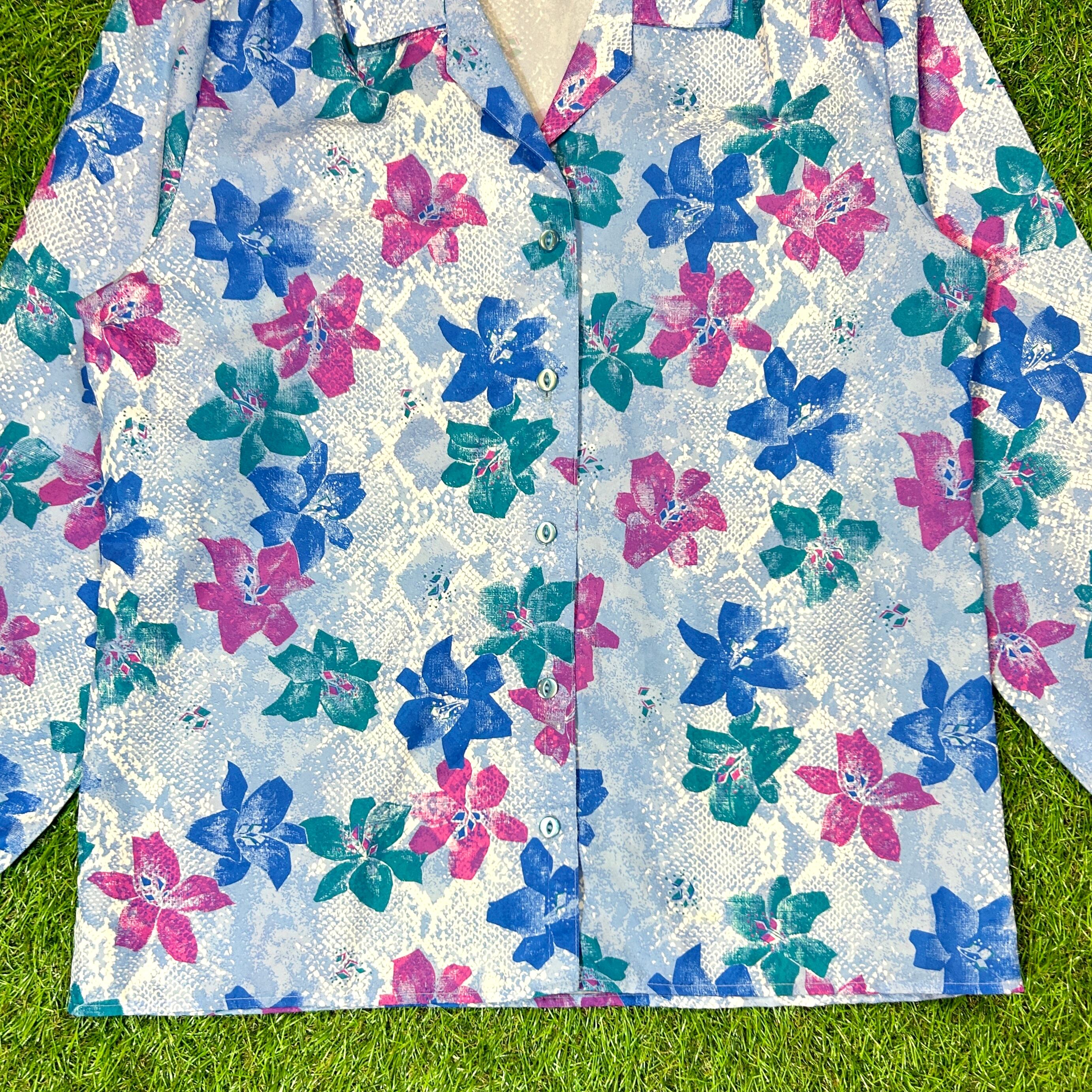【Lady's】90s パイソン & 花柄 ポリエステル オープンカラー シャツ / Made In USA Vintage ヴィンテージ 古着 ポリシャツ 総柄 長袖シャツ 蛇柄
