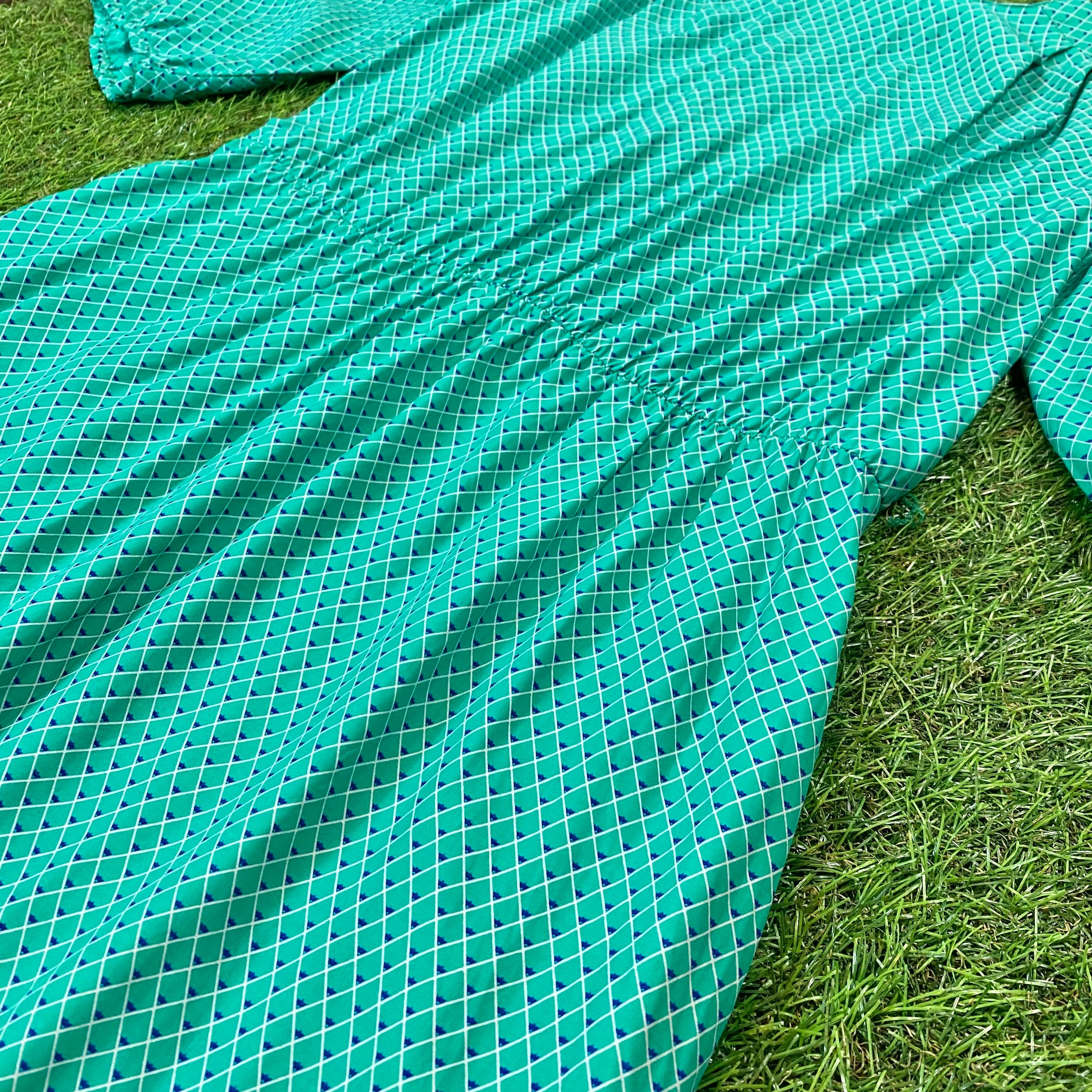 エメラルドグリーンに菱柄模様がプリントされています。