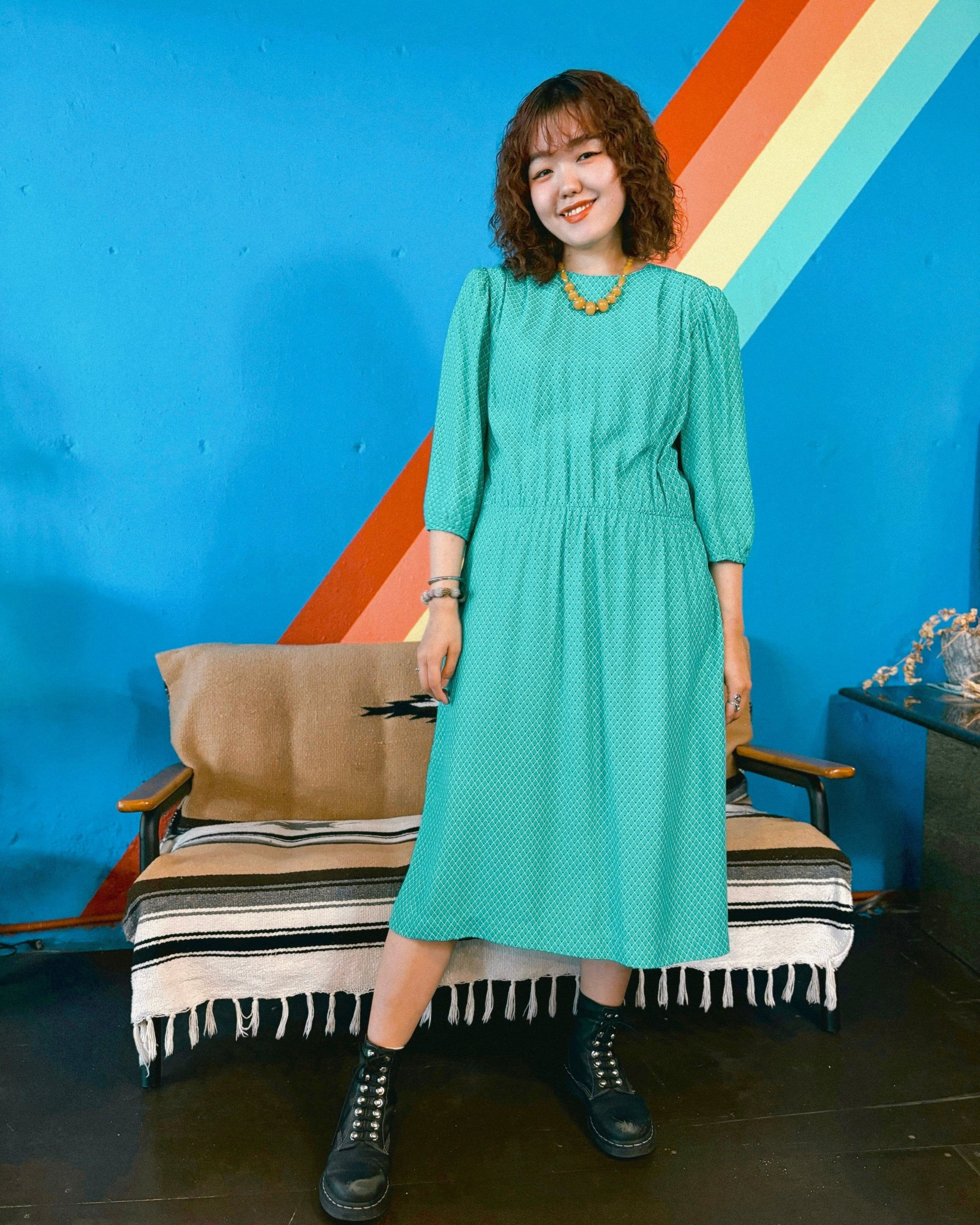 【Lady's】80s エメラルドグリーン 総柄 7分丈 ワンピース / Vintage ヴィンテージ 古着 グリーン