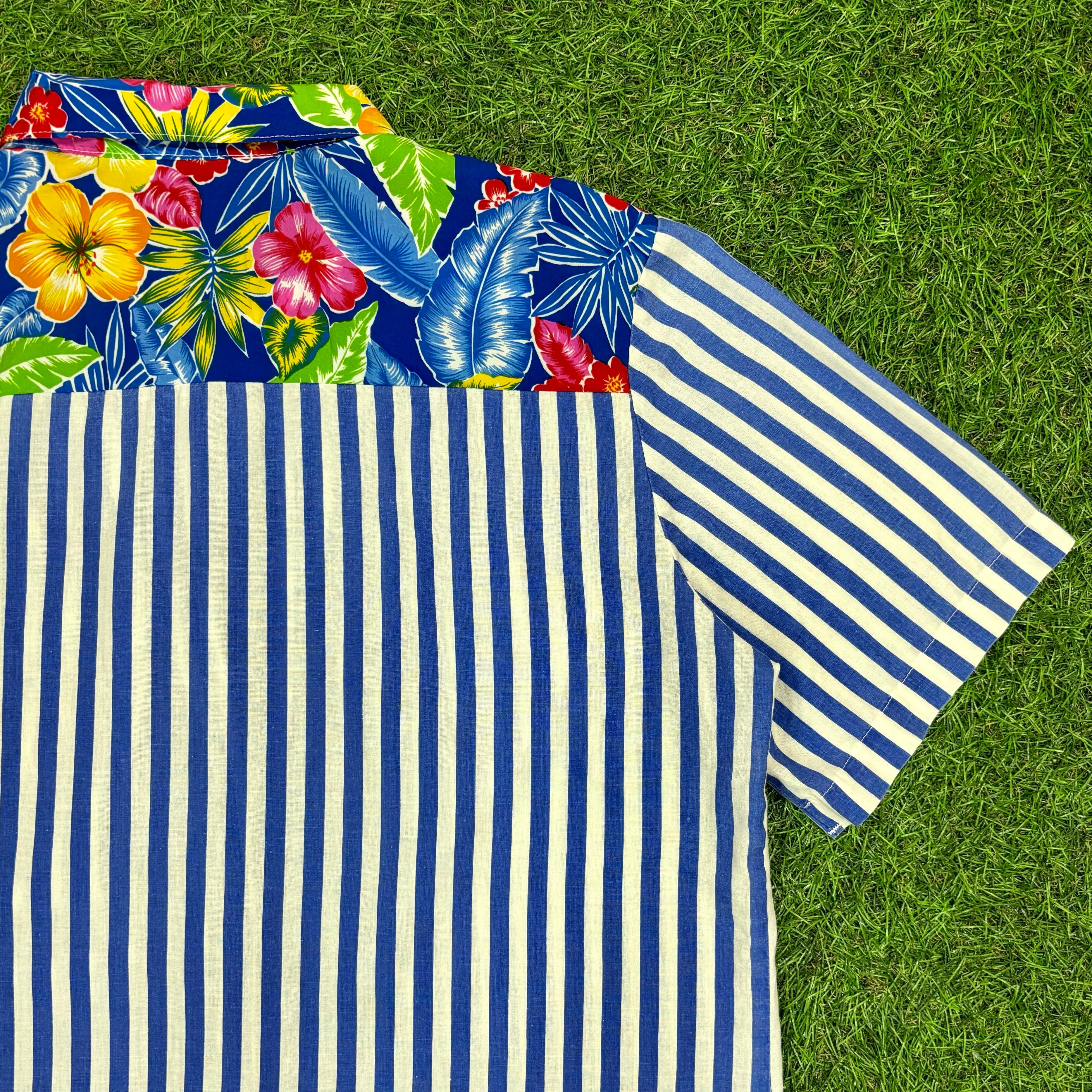 【Lady's】80s ブルー ホワイト & 花柄 ストライプ 半袖 シャツ / Made In USA Vintage ヴィンテージ 古着 半袖シャツ