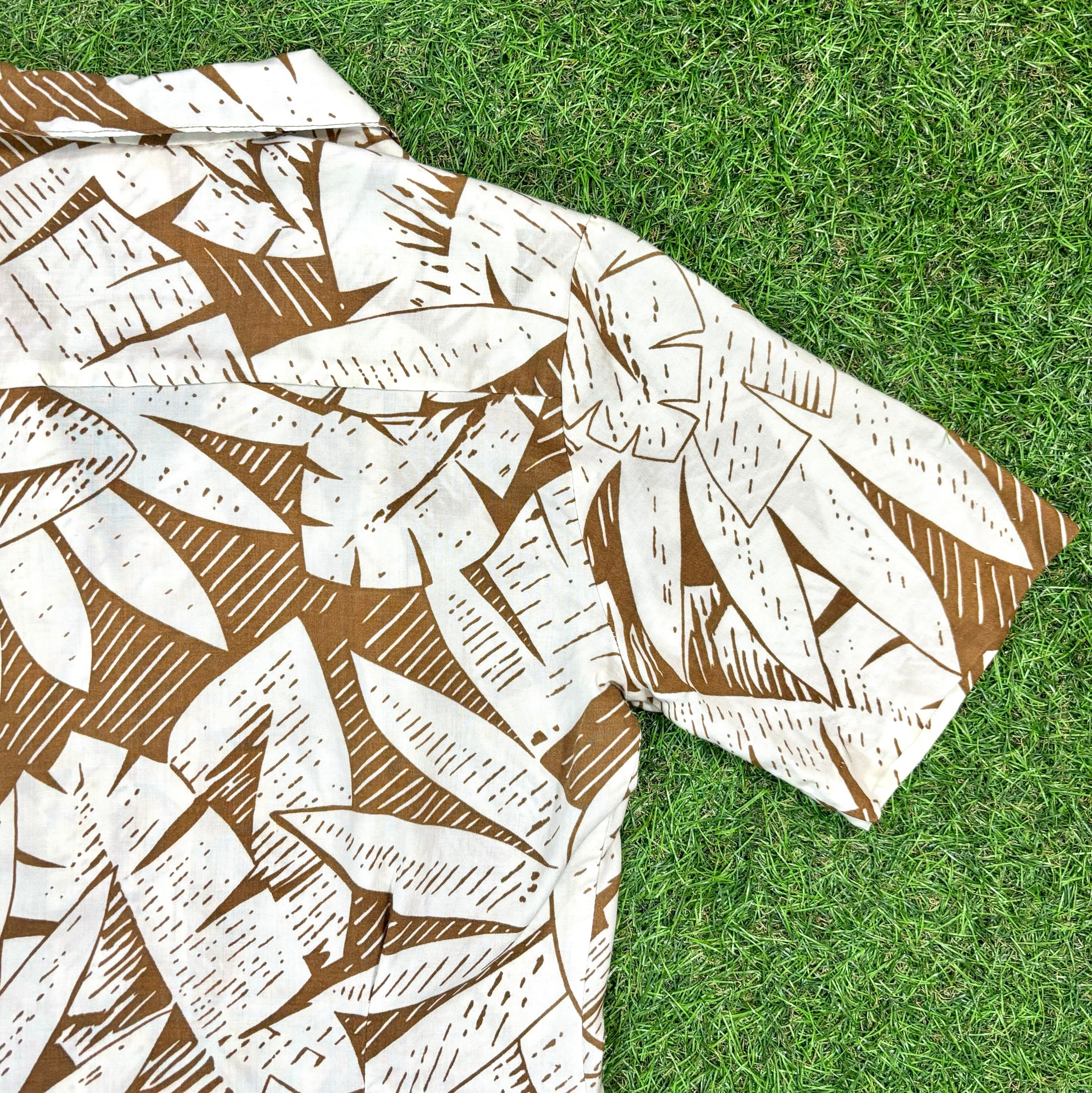 【Lady's】 アイボリー リーフ柄 半袖 ブラウス / Made in USA ブラウン ベージュ 古着 半袖シャツ シャツ アロハ