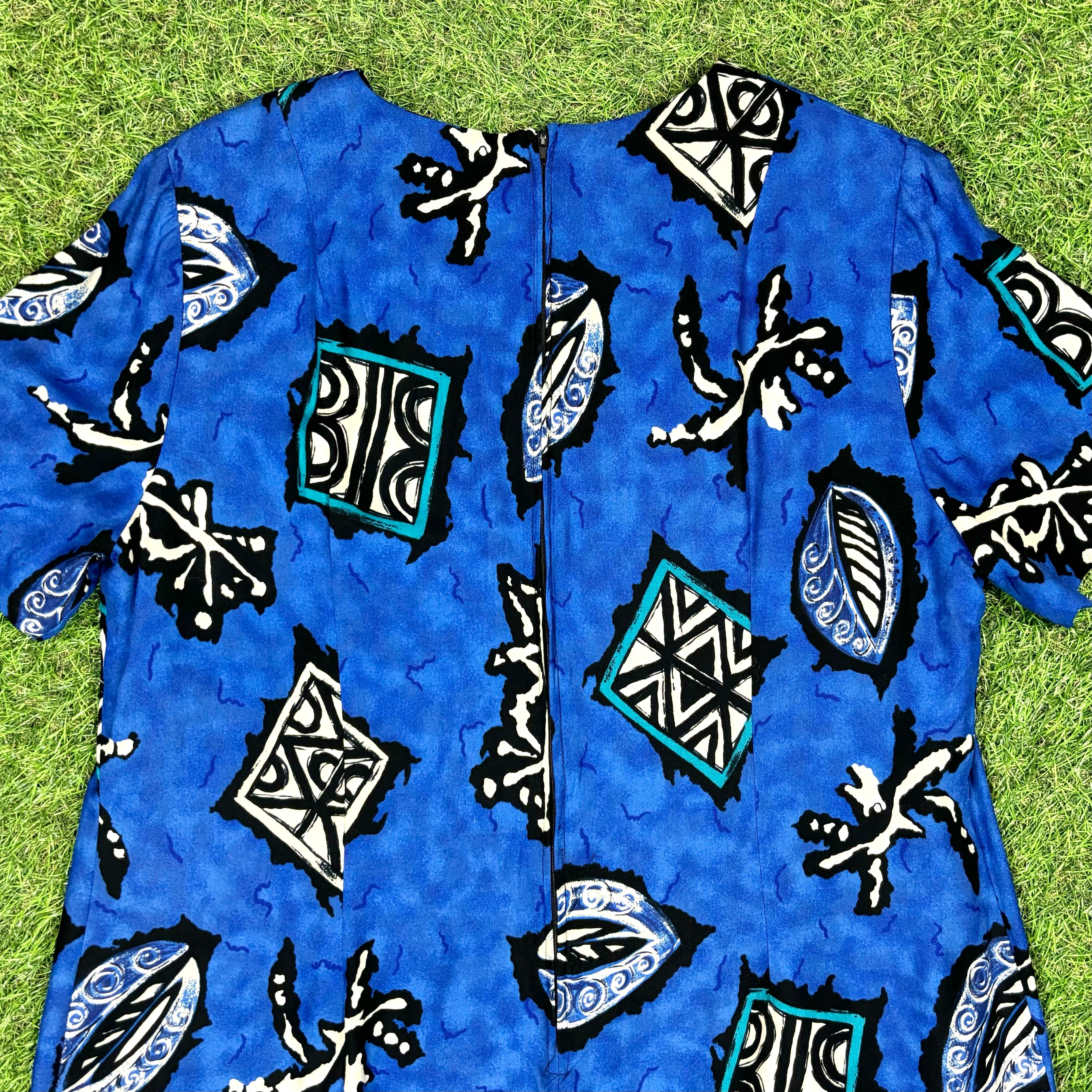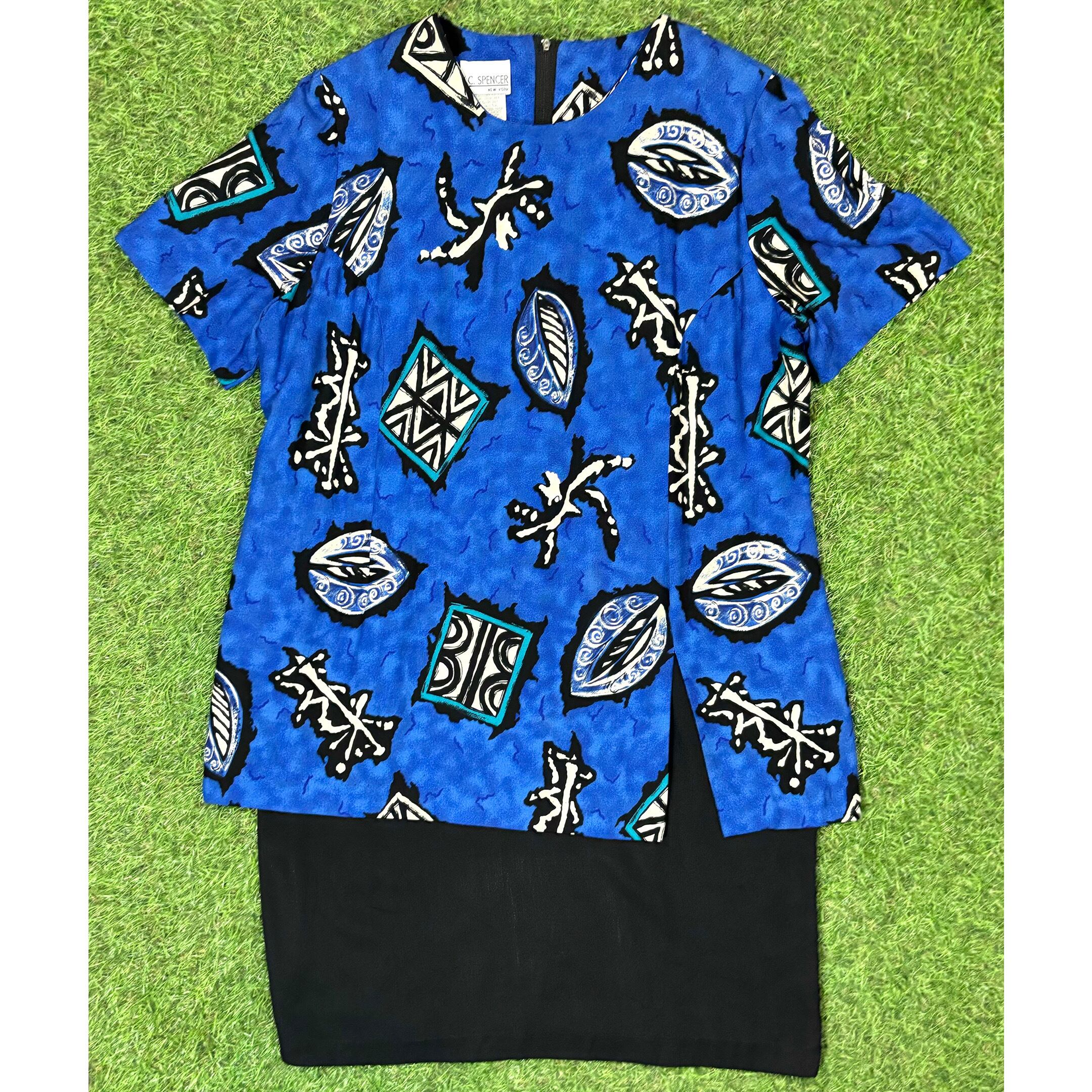 【Lady's】 80s ブラックブルー レイヤード風 デザイン 半袖 ワンピース / Made In USA Vintage ヴィンテージ 古着 青 黒 エスニック