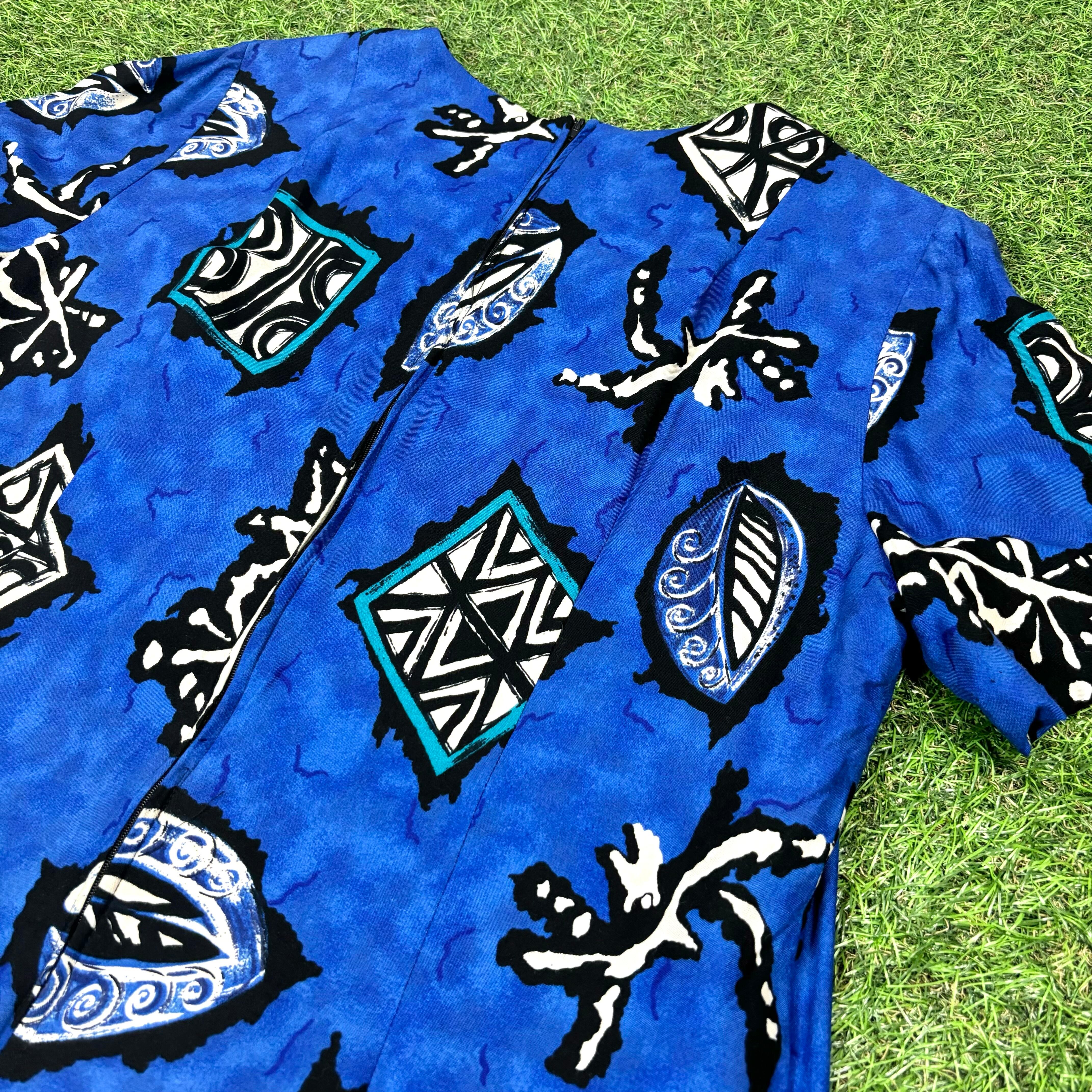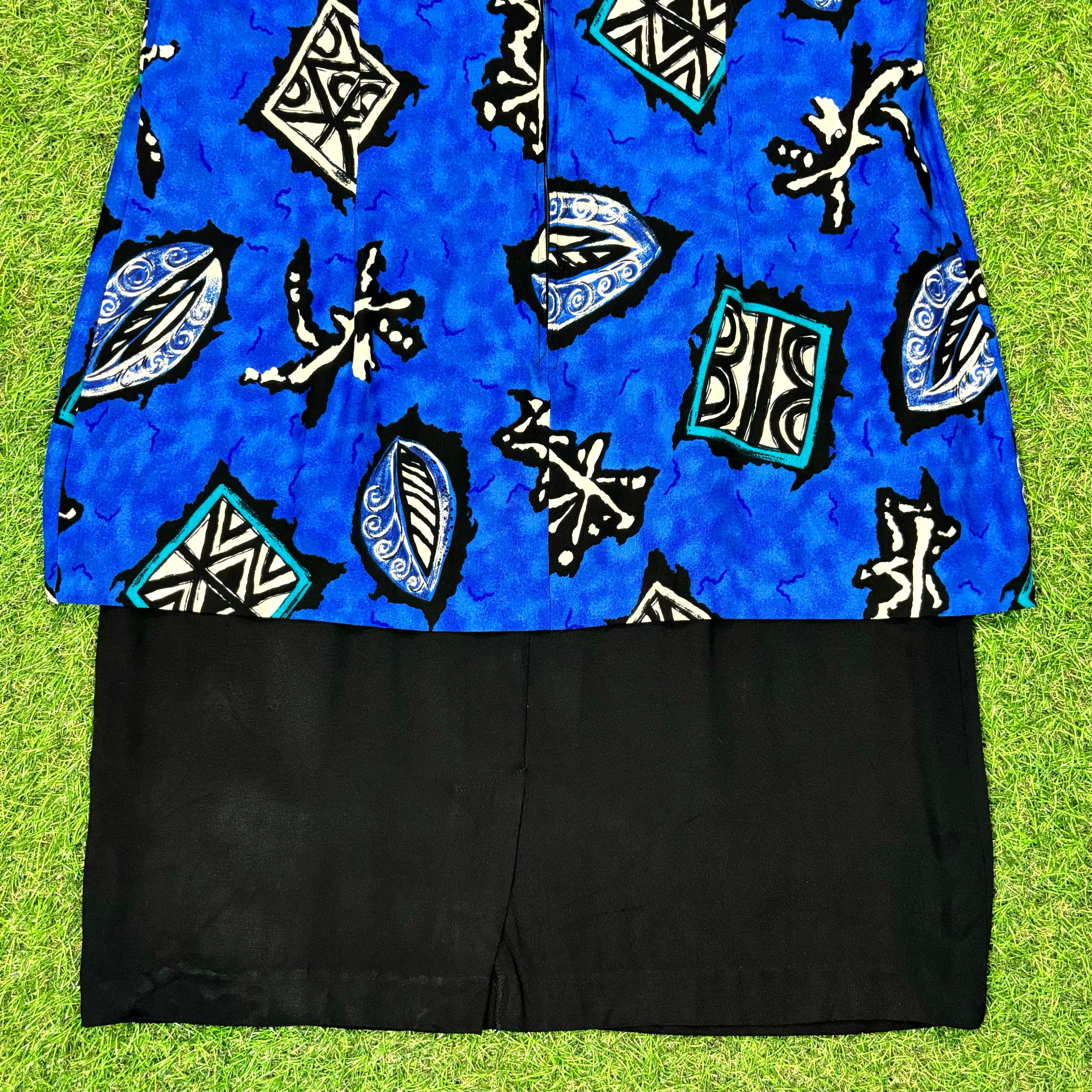 ブルーのトップスに黒のスカートをはいているようなデザインでゆったりとしたシルエットが着心地抜群です。ネイティブ感のある柄も◎