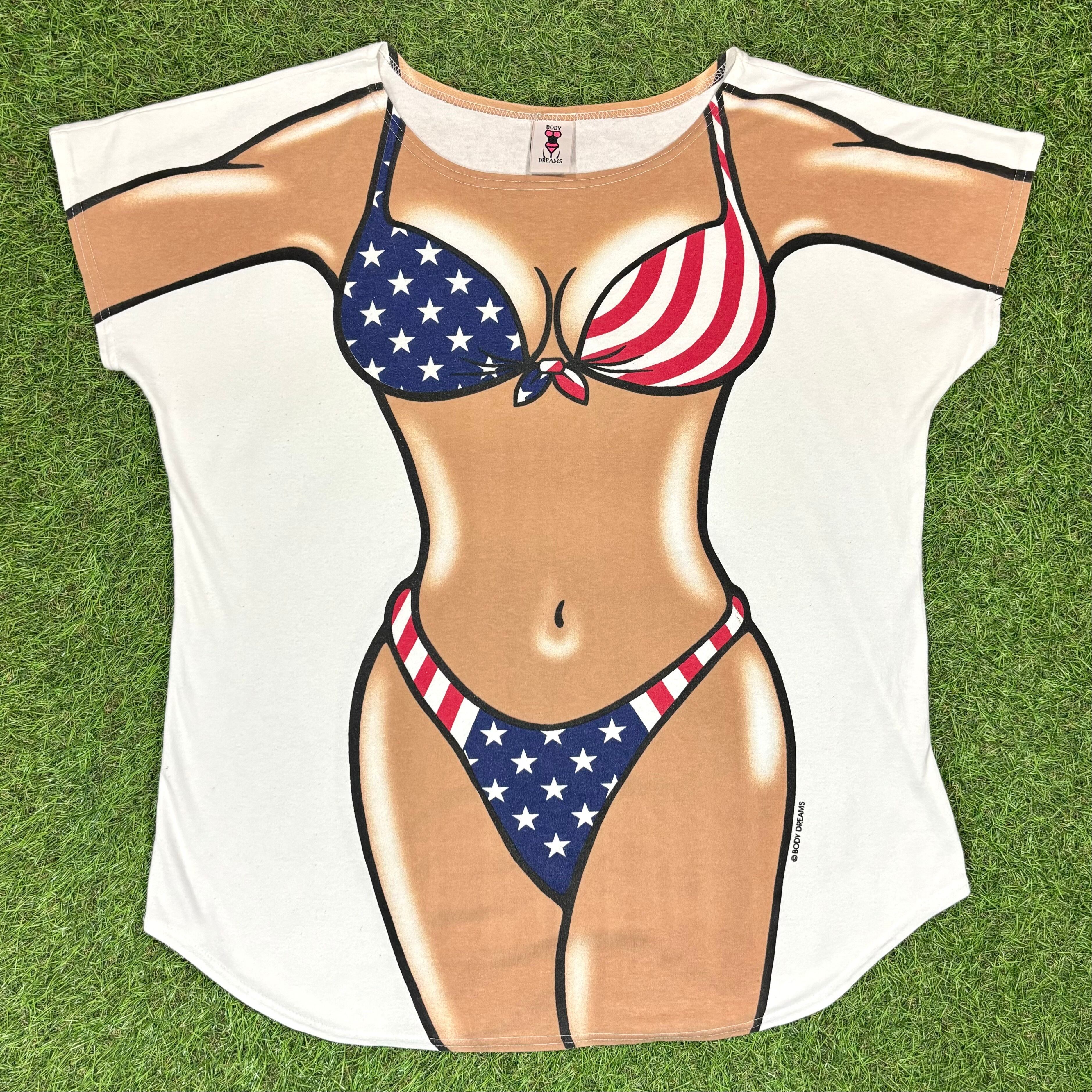 【Lady's】 00s アメリカンフラッグ ビキニギャル デザイン Tシャツ / Made In USA Vintage ヴィンテージ 古着 個性派 イラスト