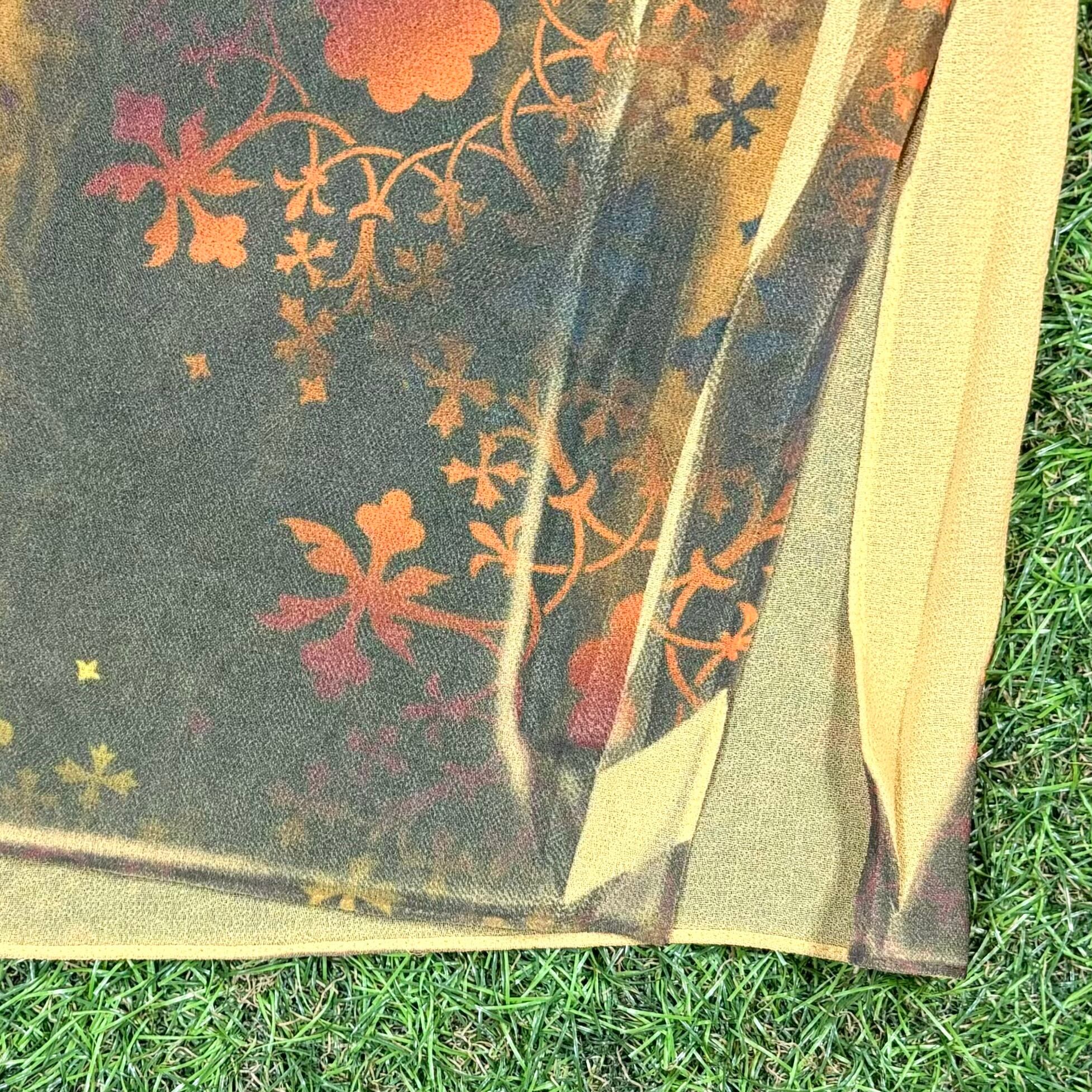 透け感のあるザラっとした薄手の素材にオリエンタルな柄がプリントされています。