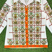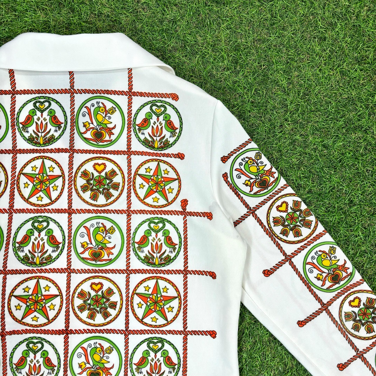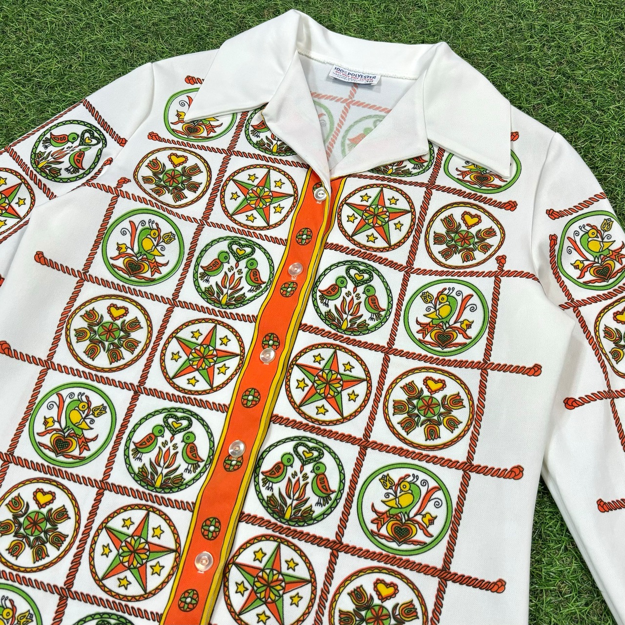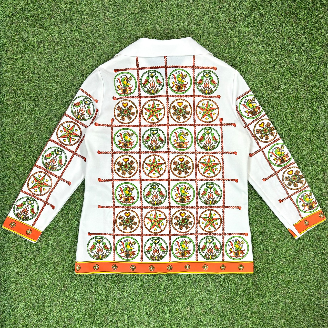 【Lady's】 70s レトロ 総柄 イラスト 開襟 シャツ ジャケット / Made In USA アメリカ製 Vintage ヴィンテージ 古着 長袖 レディース オープンカラー