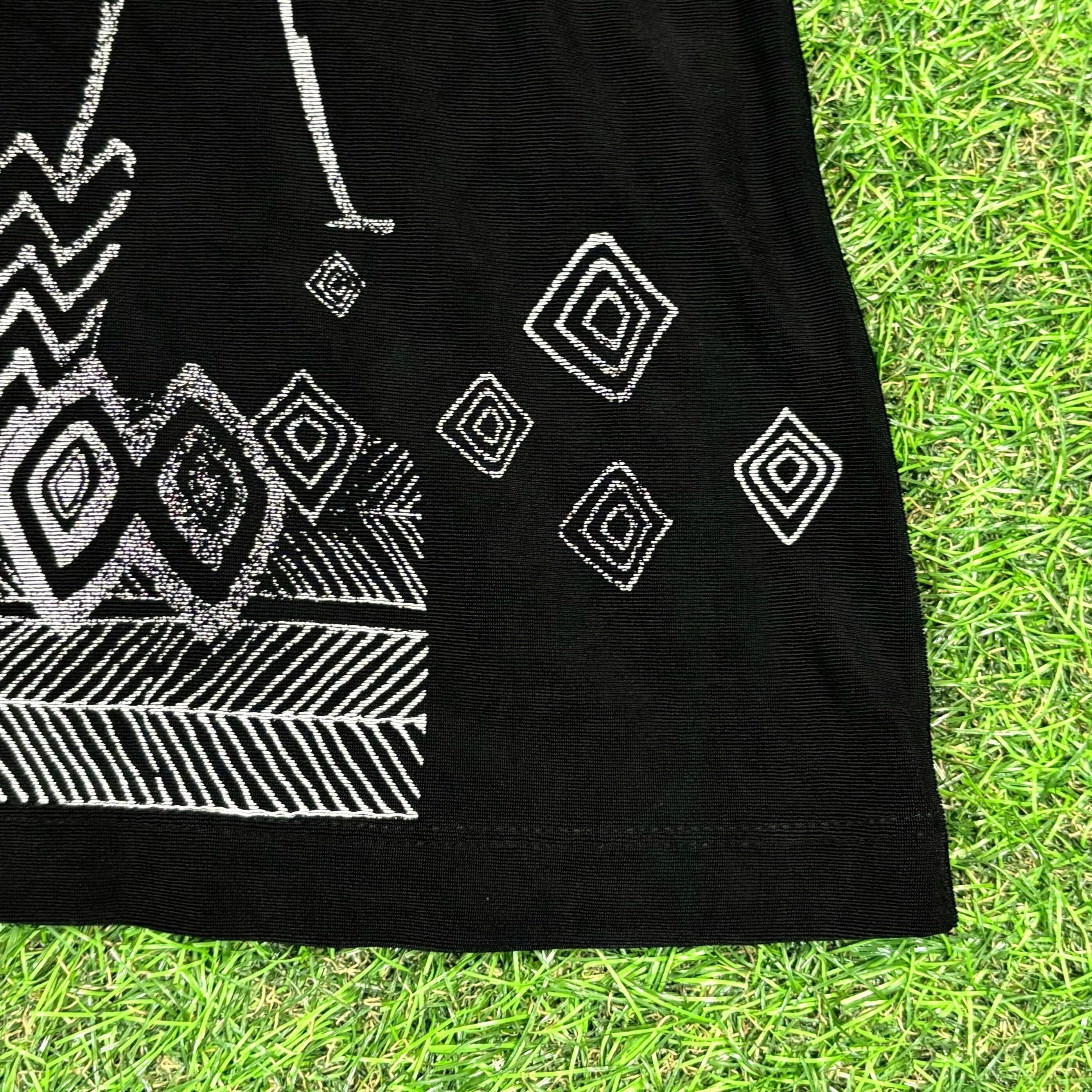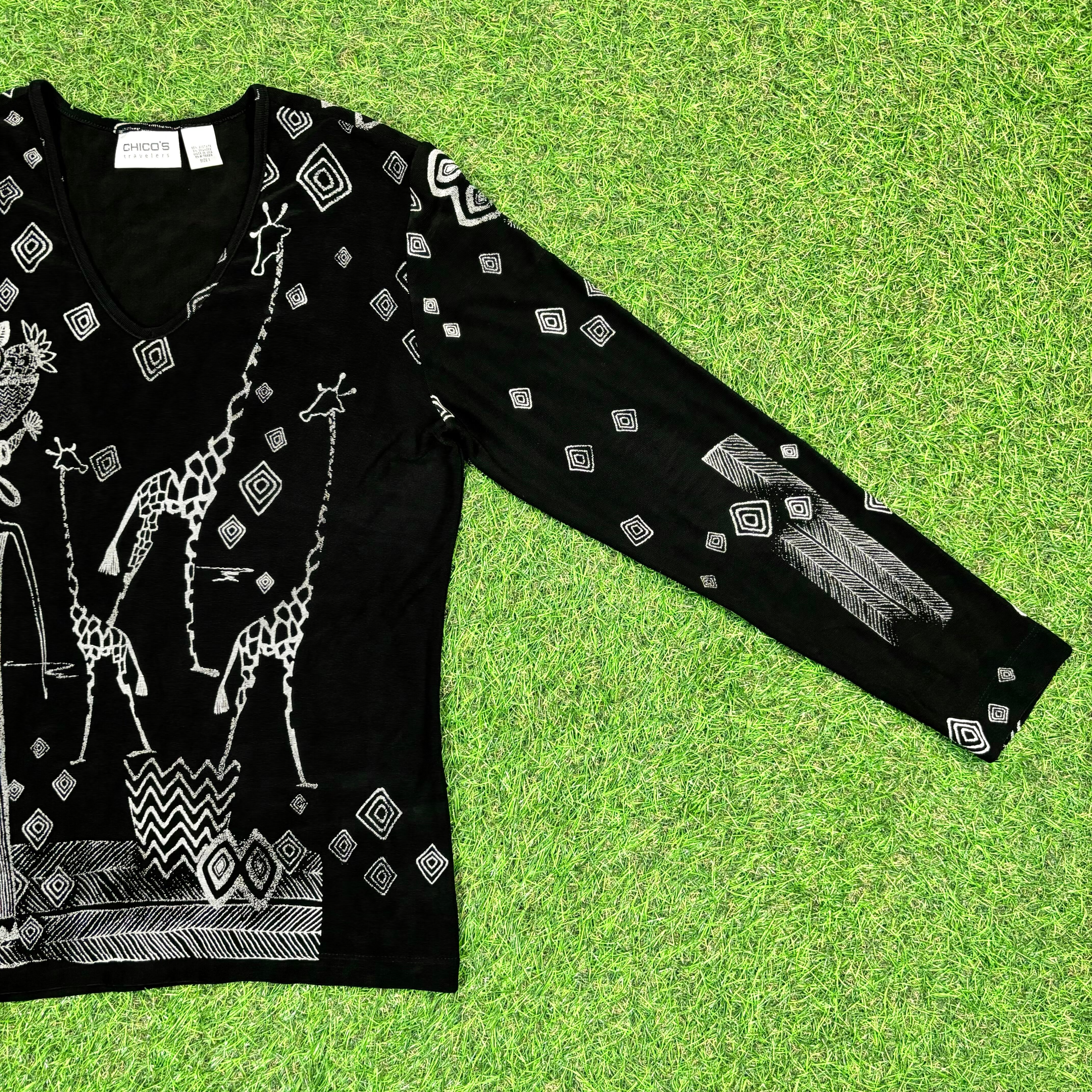 【Lady's】 90s サファリ イラスト Vネック ブラック トップス / Made In USA アメリカ製 Vintage ヴィンテージ 古着 アニマル 総柄