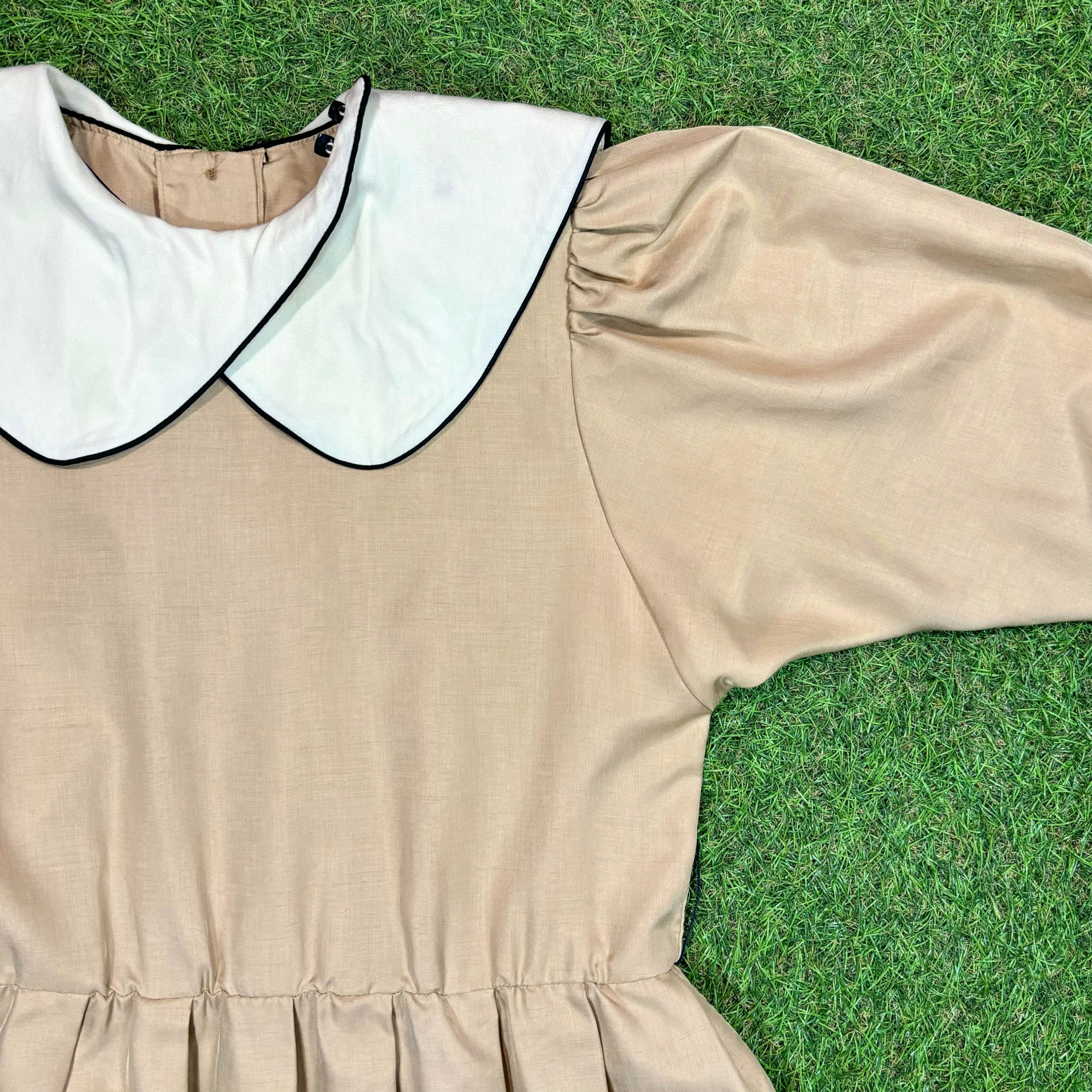 【Lady's】 80s ベージュ ビッグカラー 7分袖 ワンピース / Made In USA アメリカ製 Vintage ヴィンテージ 古着 レトロ