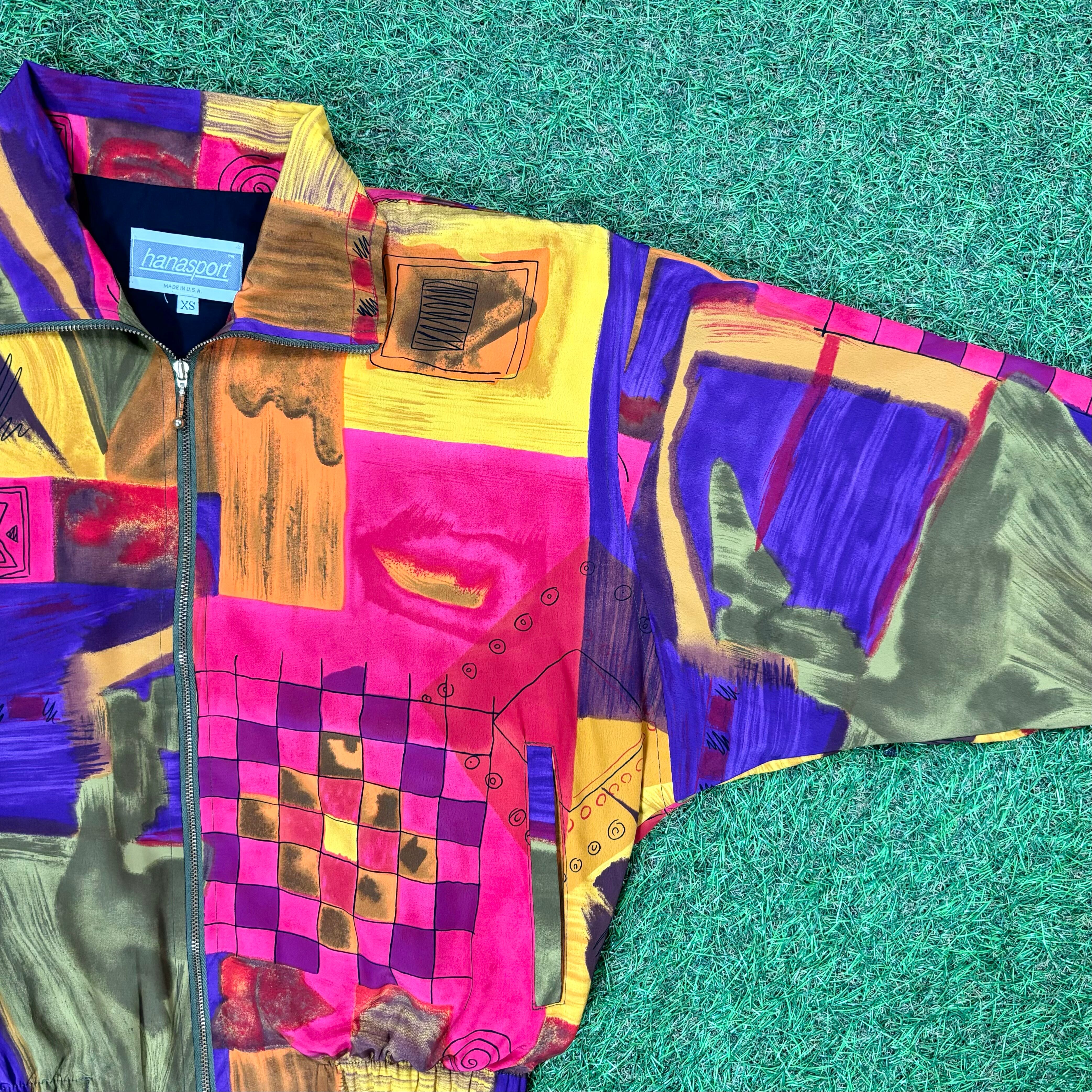 【Lady's】 90s アート 総柄 ポリエステル ジャケット / Made In USA ジャンバー ブルゾン アメリカ製 90年代 レディース 個性派