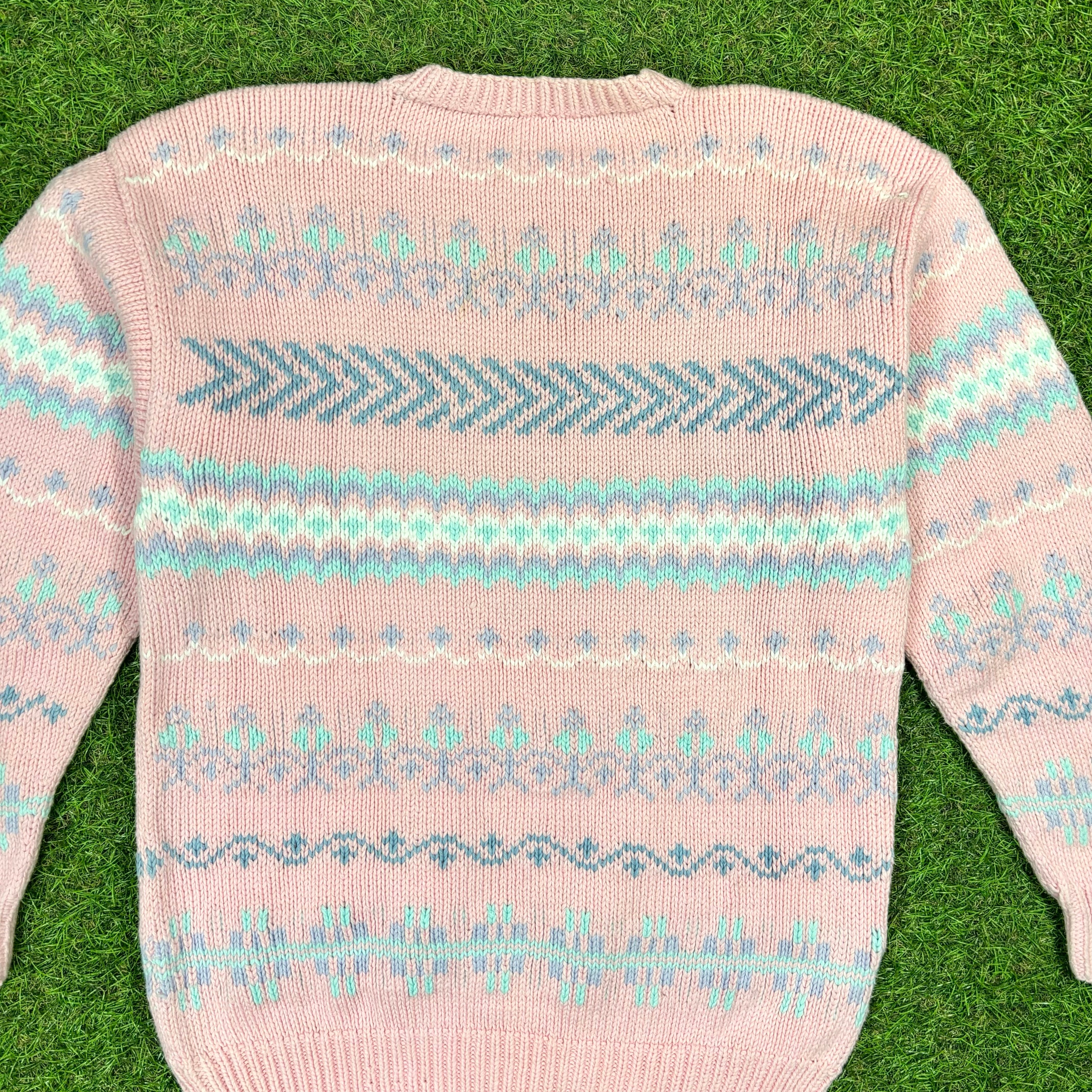 詳細不明ですが淡いピンクのカラーに幾何学な模様が入ったとってもかわいらしいニットです。