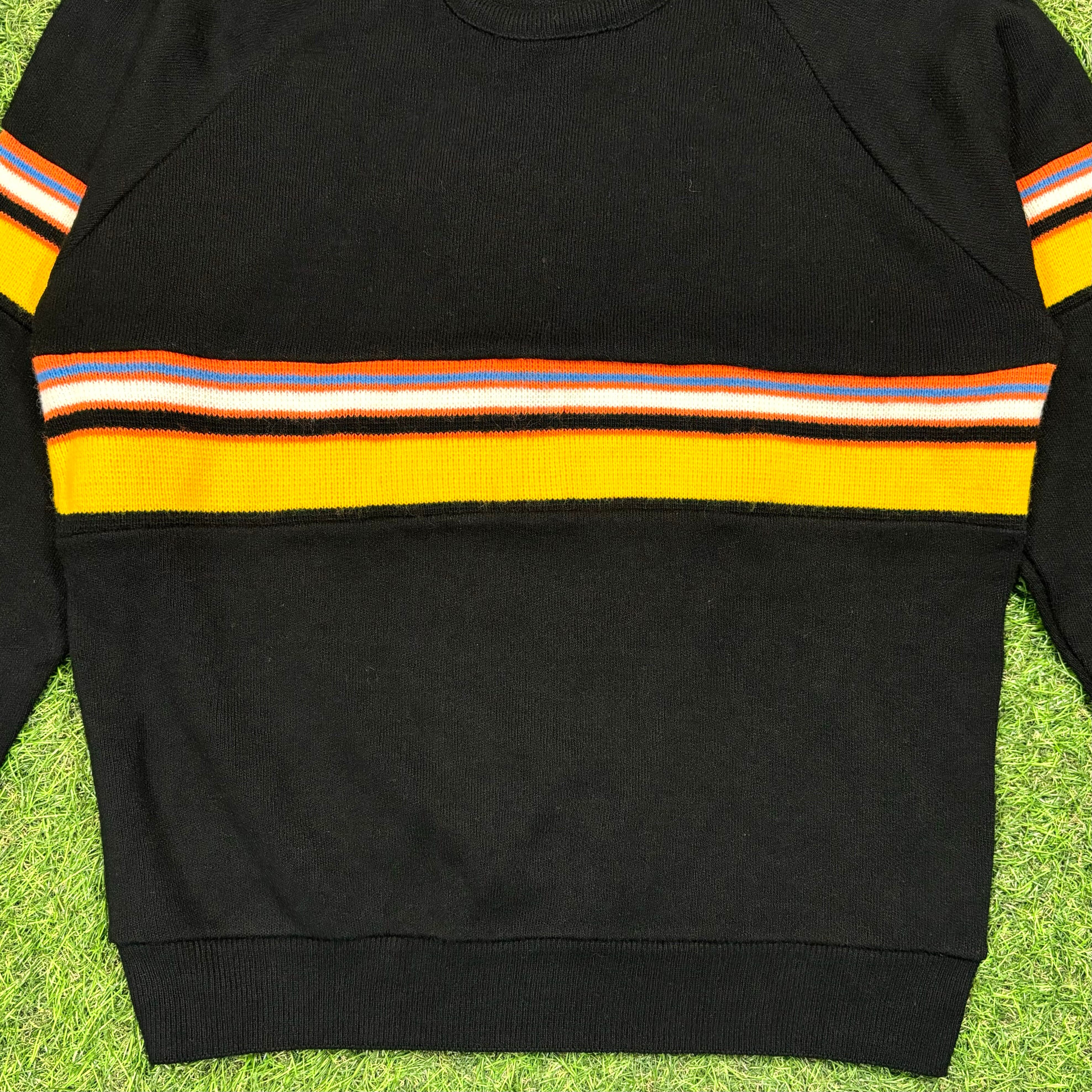 【Men's】 70s ブラック イエロー ライン アクリル ニット / 70年代 古着 トップス セーター 黒 レトロ 大人古着 Vintage ヴィンテージ 大人古着