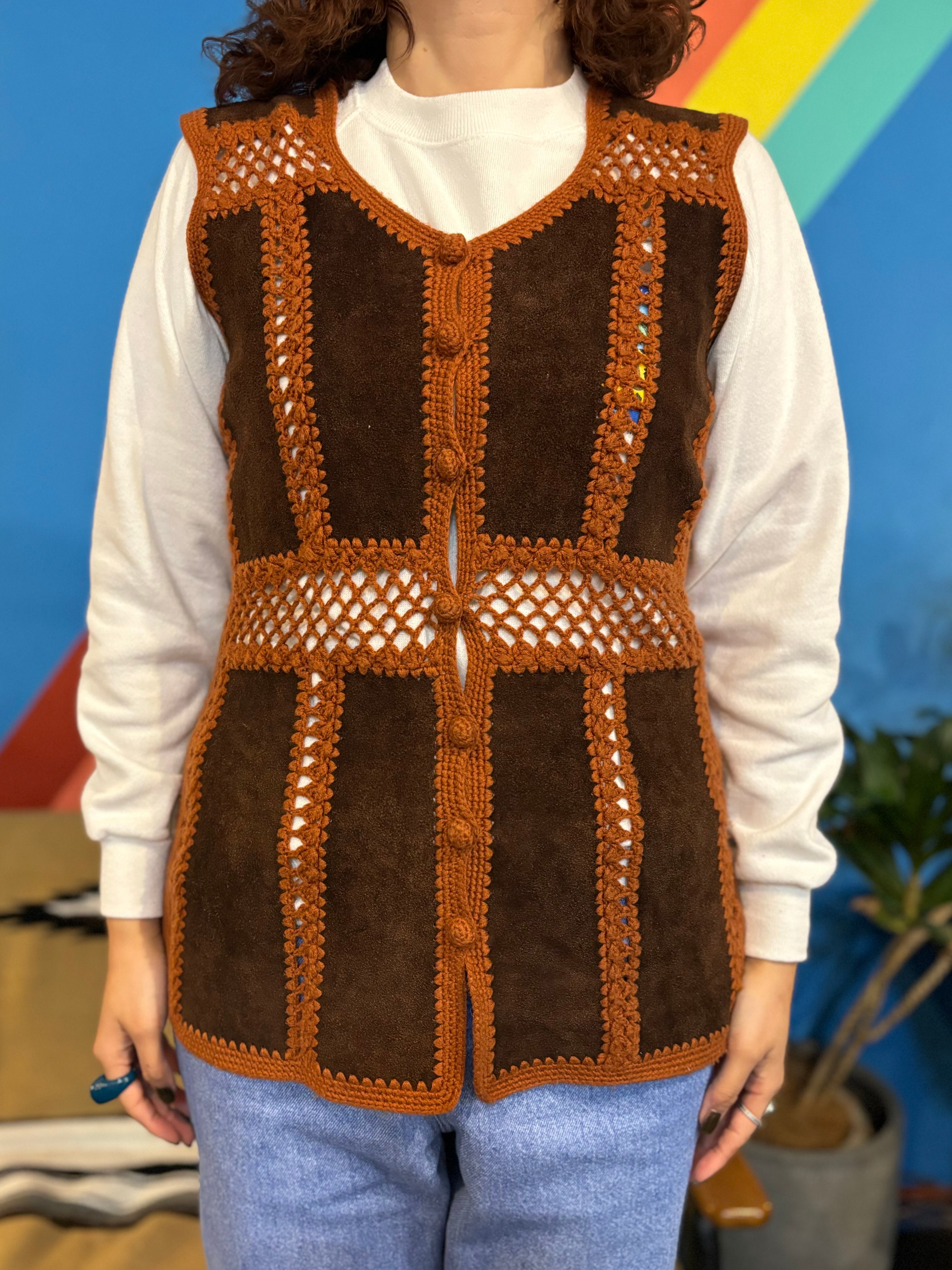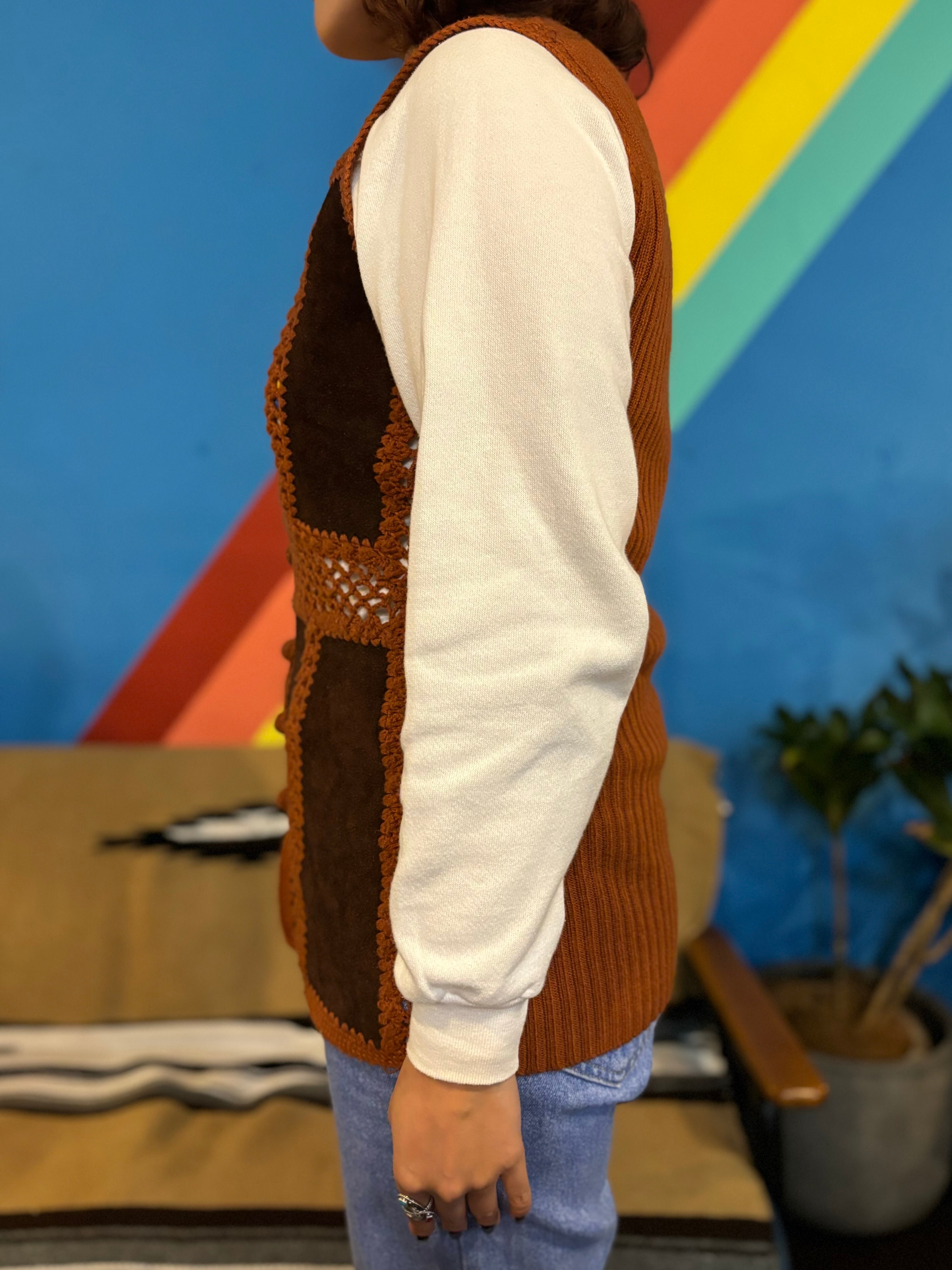 【Lady's】 70s スウェード 切り替えし ブラウン ニット ベスト / 70年代 古着 ヒッピー レトロ レディース Vintage ヴィンテージ