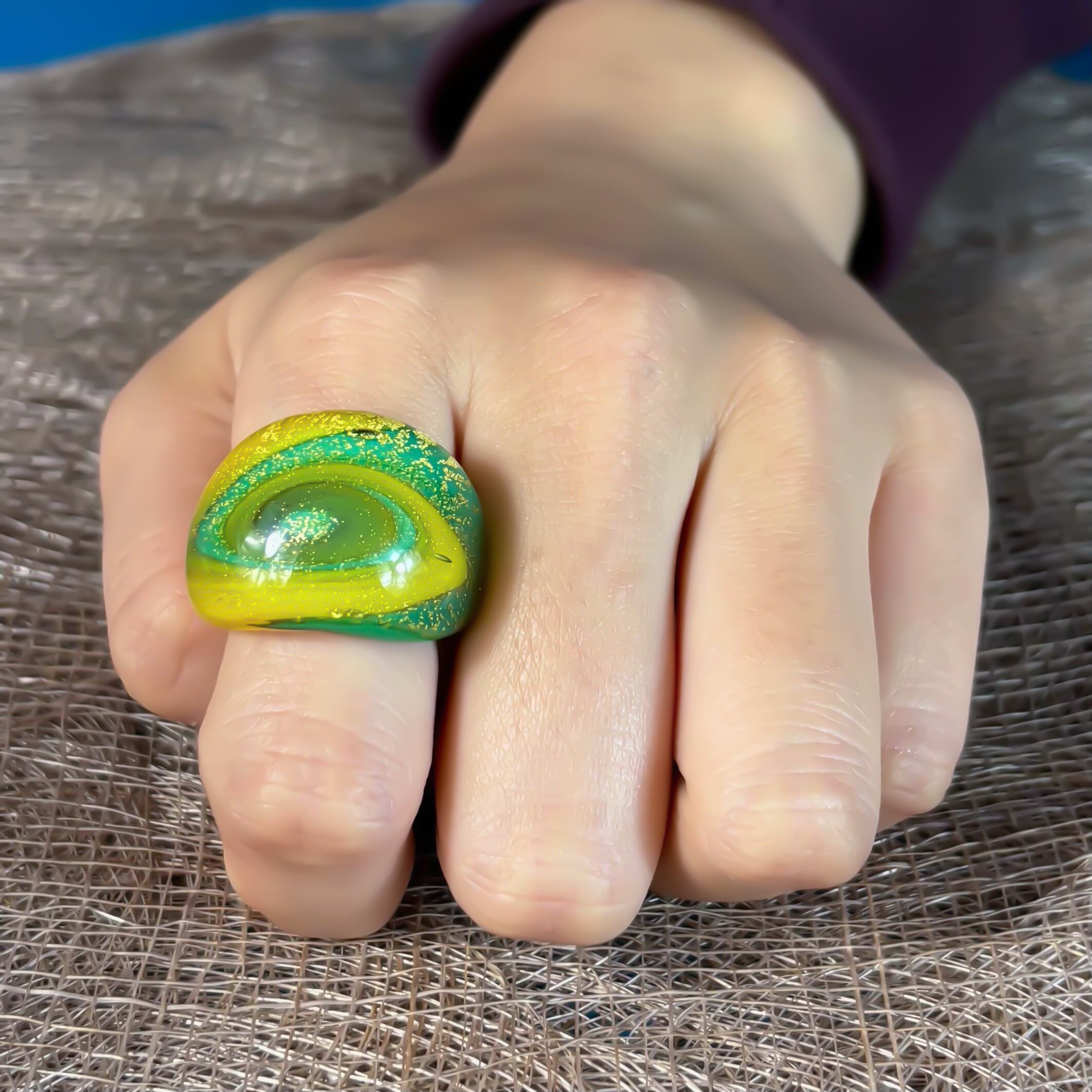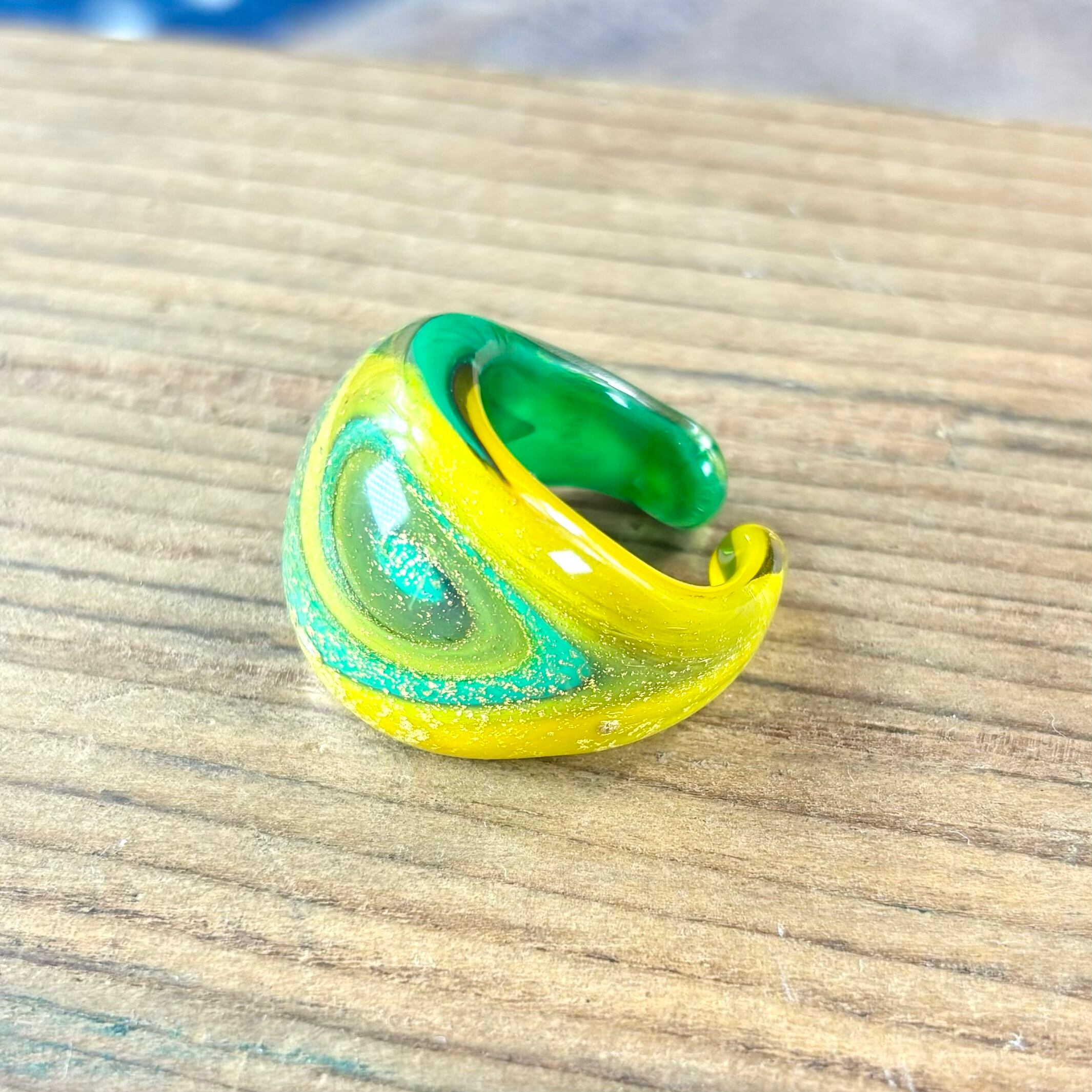 イエローとグリーンのマーブル模様がとっても魅力的なリングです。