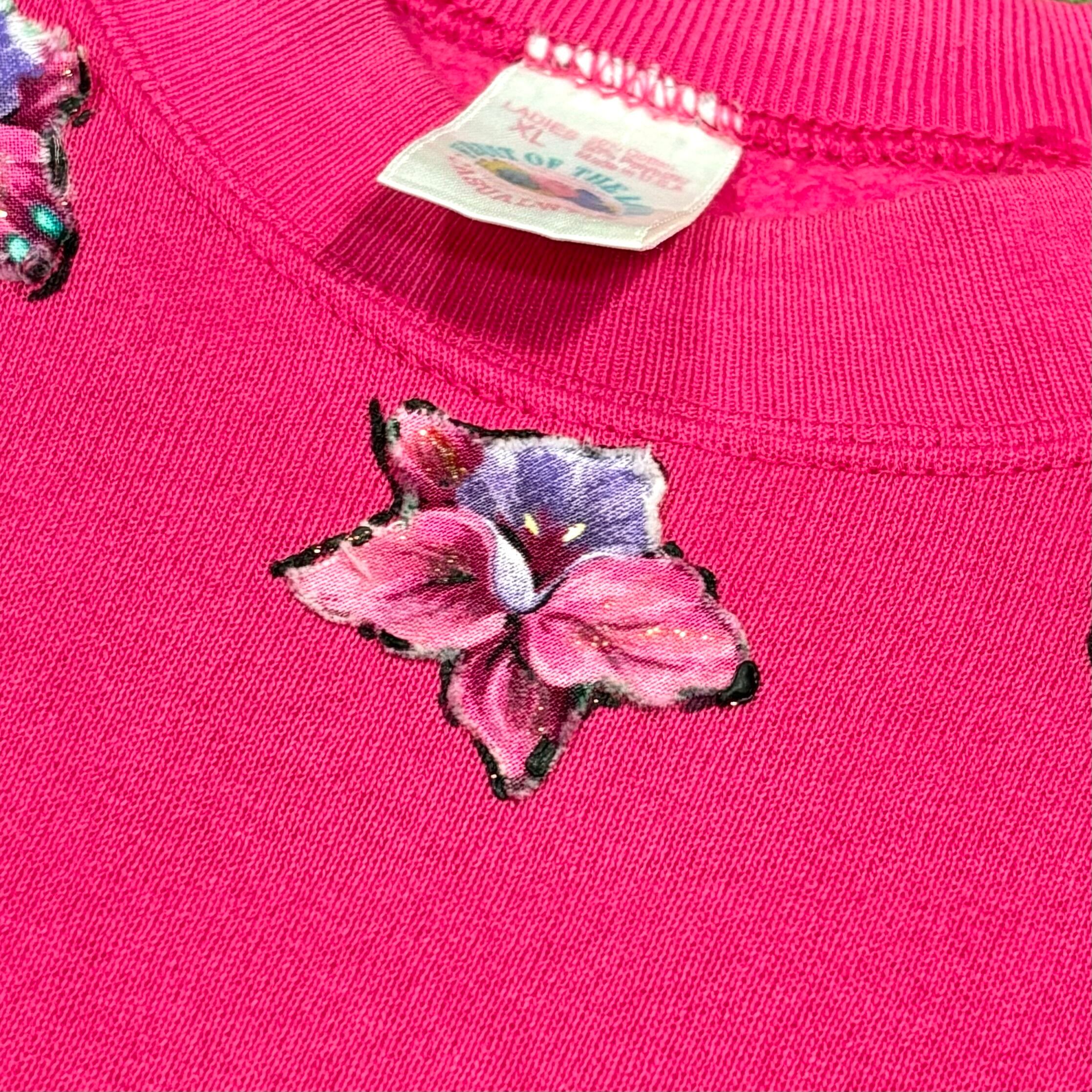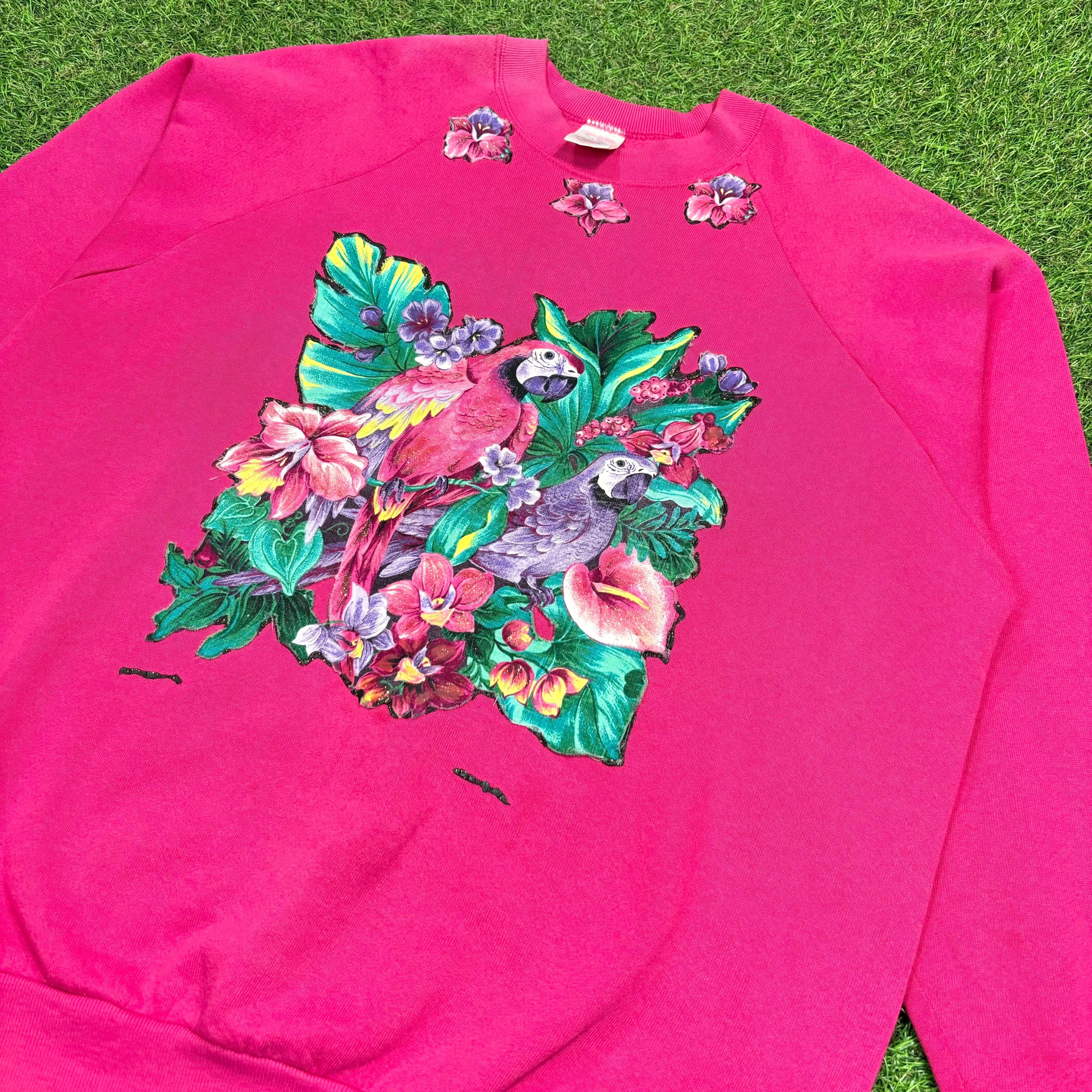 【Unisex】 90s トロピカル オウム パッチ スウェットシャツ / Made In USA スウェット スエット トレーナー ピンク 鳥 動物 アニマル