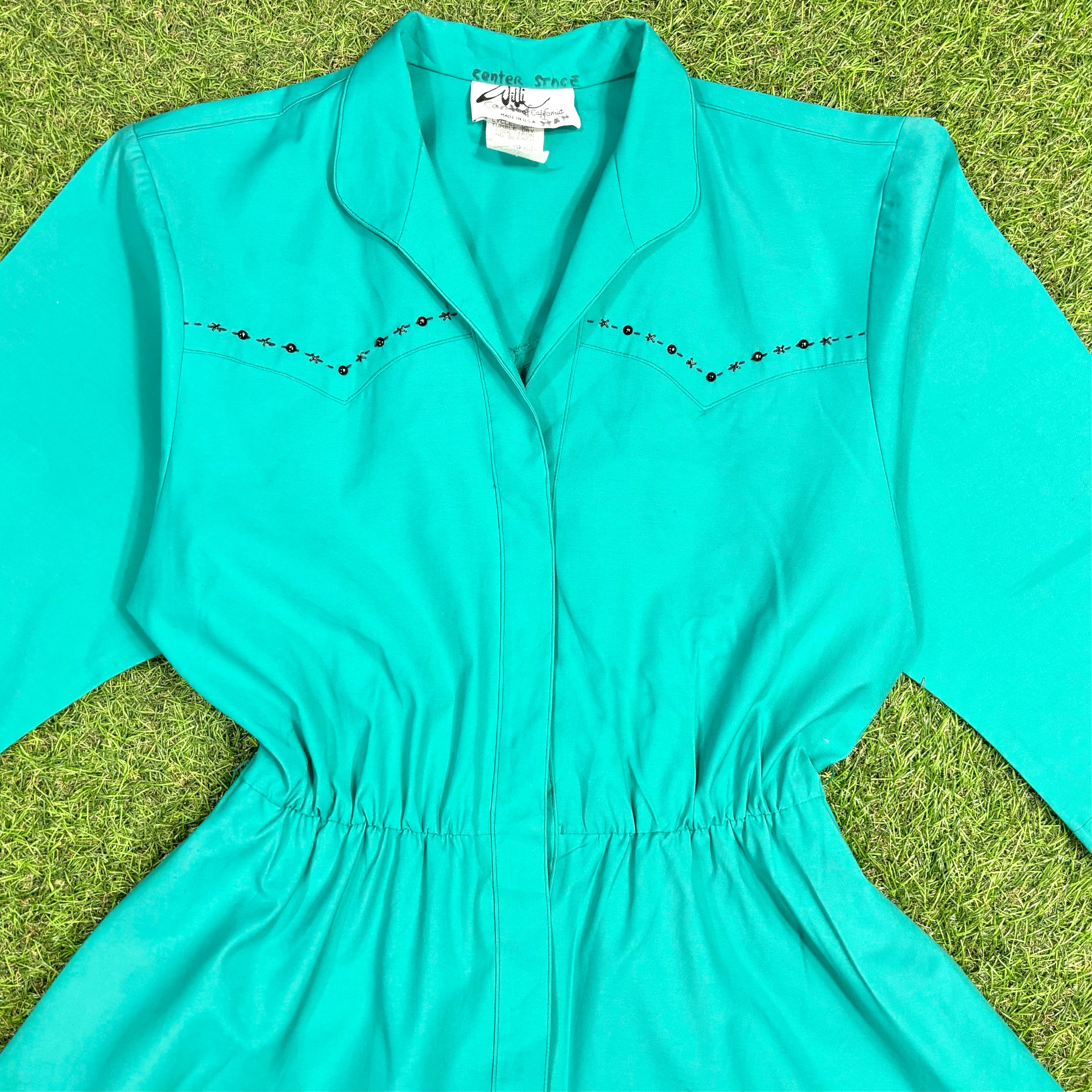 【Lady's】 80s ウェスタン スタイル 開襟 ワンピース / Made In USA ワンピ 古着 レトロ ウエスタン 緑 グリーン 80年代